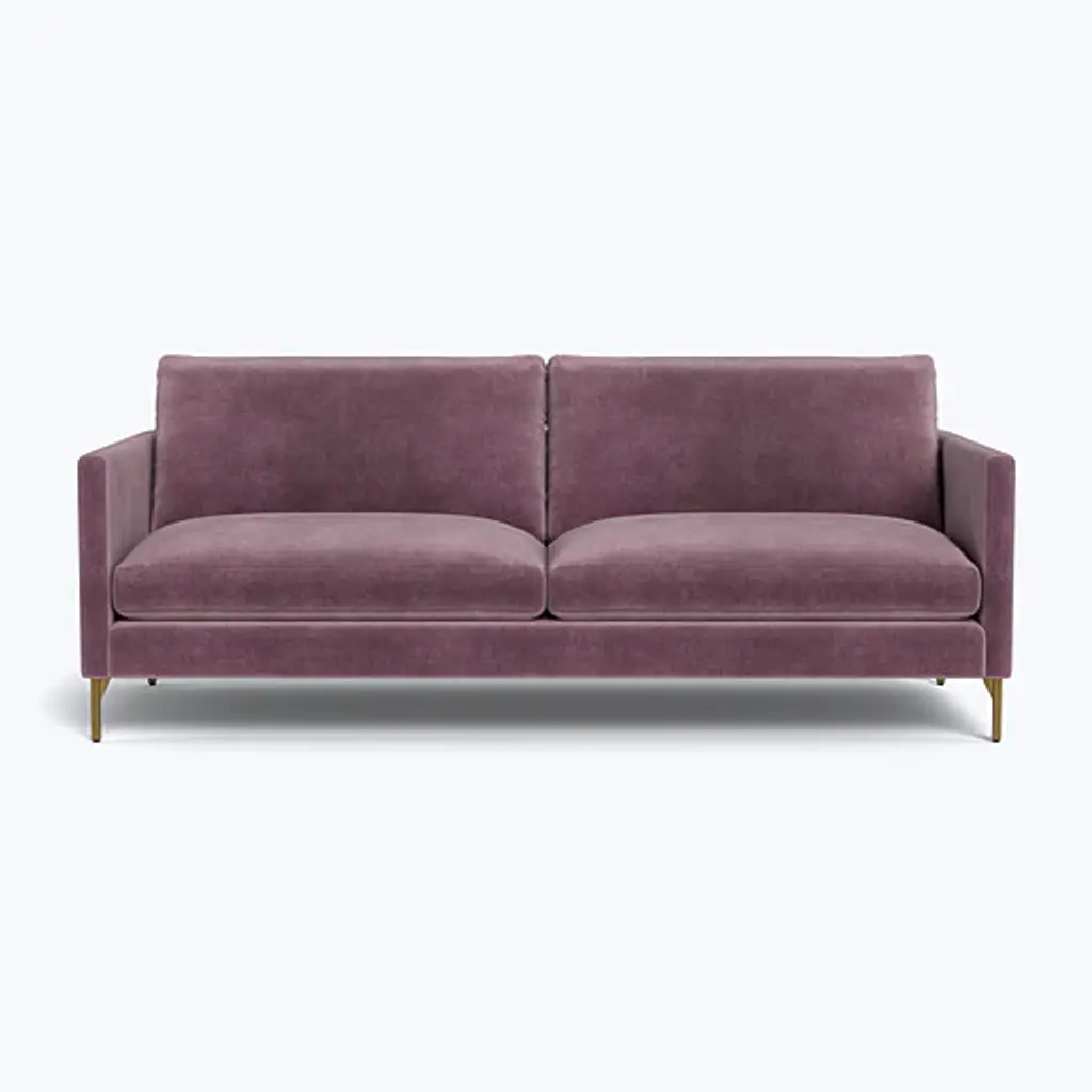 Make a statement in your home with the Hannah Two Seat Sofa, an exclusive offering from abc carpet & home. Designed to elevate your living experience, this sofa perfectly combines style and comfort. The Hannah Two Seat Sofa features slim track arms and sleek legs, adding a touch of elegance to its contemporary design. Its generous dimensions provide ample room for relaxation, making it the perfect addition to any living room or entertainment area. Available in two sizes, this sofa perfectly adapts to any space. Additionally, choose between two leg finishes, brass and silver, to customize the sofa to perfectly suit your unique style preferences. The Hannah Collection is distinguished by its blend-down cushions, a mix of dense foam and feather down that is carefully washed to meet hypoallergenic regulations. These reversible cushions ensure lasting comfort, inviting you to sink in and unwind after a long day. Constructed with a sustainably sourced Goodwood frame, this sofa is not only aesthetically pleasing but also eco-conscious, offering peace of mind as you create lasting memories at home. Customize your Hannah Two Seat Sofa with Cobble Hill's wide range of color and fabric combinations, offering over 80 options to suit your unique style and preferences. Whether it's the Graceland Sorrell 100% Polyester or another fabric of your choice, rest assured that each option is durable, stain-resistant, and easy to clean. Simply select your dream color and fabric scheme, and your custom sofa will be shipped to your home in 8-10 weeks. Proudly made in the USA, each piece in the Cobble Hill collection reflects a commitment to quality craftsmanship and ethical manufacturing practices. Maintaining the pristine condition of your sofa is effortless with simple care instructions. Spot clean with mild detergent and vacuum frequently to keep it looking fresh. For a deeper clean, professional services are recommended. Make every moment count with the Hannah Two Seat Sofa, where comfort and style converge to create unforgettable experiences.