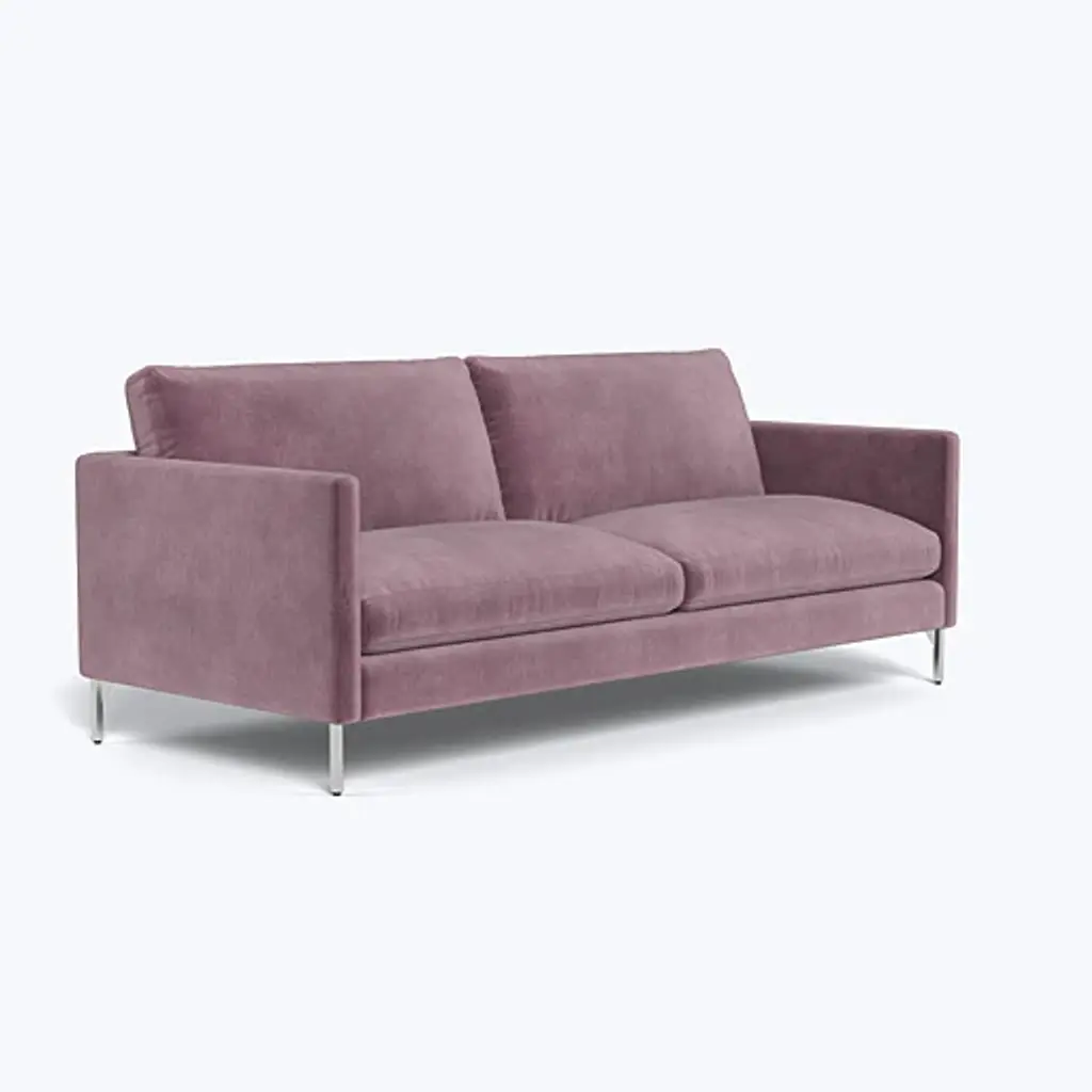 Make a statement in your home with the Hannah Two Seat Sofa, an exclusive offering from abc carpet & home. Designed to elevate your living experience, this sofa perfectly combines style and comfort. The Hannah Two Seat Sofa features slim track arms and sleek legs, adding a touch of elegance to its contemporary design. Its generous dimensions provide ample room for relaxation, making it the perfect addition to any living room or entertainment area. Available in two sizes, this sofa perfectly adapts to any space. Additionally, choose between two leg finishes, brass and silver, to customize the sofa to perfectly suit your unique style preferences. The Hannah Collection is distinguished by its blend-down cushions, a mix of dense foam and feather down that is carefully washed to meet hypoallergenic regulations. These reversible cushions ensure lasting comfort, inviting you to sink in and unwind after a long day. Constructed with a sustainably sourced Goodwood frame, this sofa is not only aesthetically pleasing but also eco-conscious, offering peace of mind as you create lasting memories at home. Customize your Hannah Two Seat Sofa with Cobble Hill's wide range of color and fabric combinations, offering over 80 options to suit your unique style and preferences. Whether it's the Graceland Sorrell 100% Polyester or another fabric of your choice, rest assured that each option is durable, stain-resistant, and easy to clean. Simply select your dream color and fabric scheme, and your custom sofa will be shipped to your home in 8-10 weeks. Proudly made in the USA, each piece in the Cobble Hill collection reflects a commitment to quality craftsmanship and ethical manufacturing practices. Maintaining the pristine condition of your sofa is effortless with simple care instructions. Spot clean with mild detergent and vacuum frequently to keep it looking fresh. For a deeper clean, professional services are recommended. Make every moment count with the Hannah Two Seat Sofa, where comfort and style converge to create unforgettable experiences.
