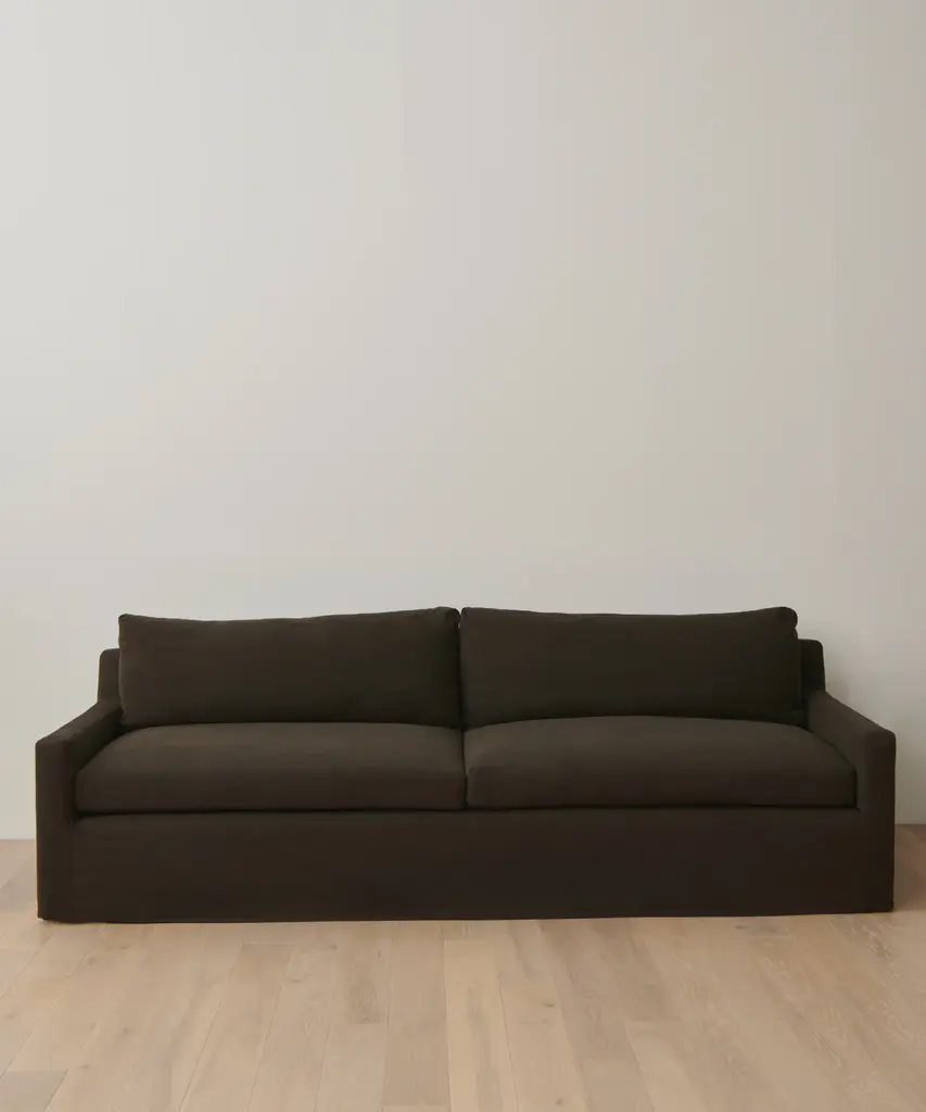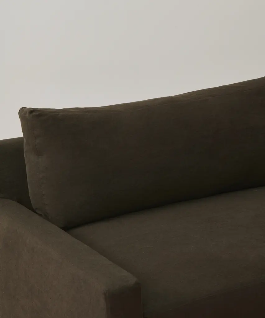 Harbor Sofa Jet Linen Classic sofa handmade in Los Angeles featuring Libeco linen upholstery crafted in Belgium: 91% linen and 9% nylon slipcover. Features feather down fill in back cushions and feather down fill with foam core in seat cushions. Seat cushions boast a firm feeling for longevity and timeless look. Slipcover and cushions feature a double top-stitch for added seam strength. Frame is kiln-dried to stand the test of time. For a free fabric swatch, please click here. For furniture purchases, please refer to our furniture inspection policy here, and for help styling this piece in your space, contact [email protected] for a complimentary consultation. CA Residents: Prop 65 Information