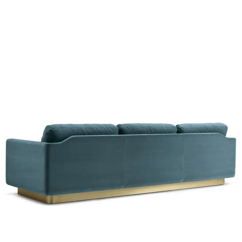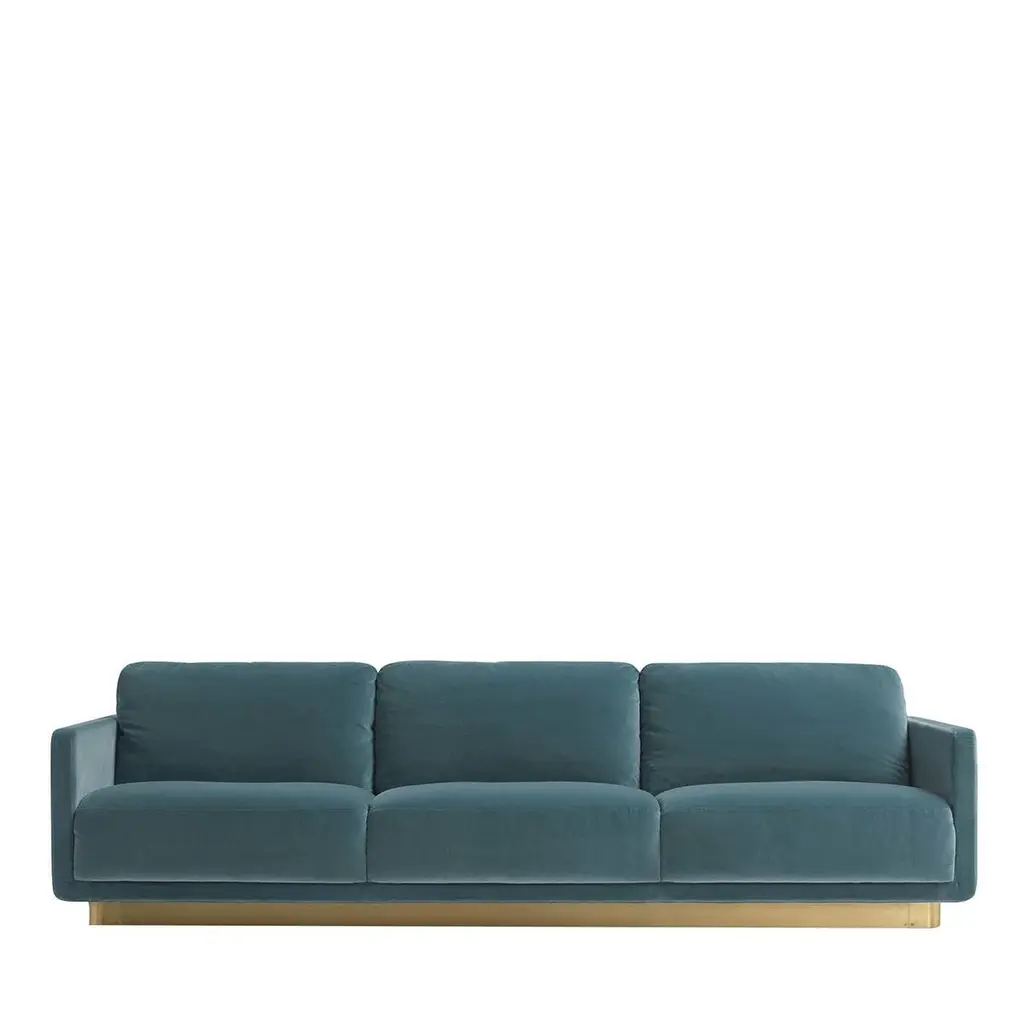 The clean, essential design of this sofa exudes subtle sophistication and a versatile profile. Resting on a satin brass base, the 3-seat structure is padded with multi-density rubber covered with a layer of memory foam and goose feathers, and upholstered with soft emerald green fabric. The three-seat cushions are also equipped with elastic belts that add durability and comfort to the piece.