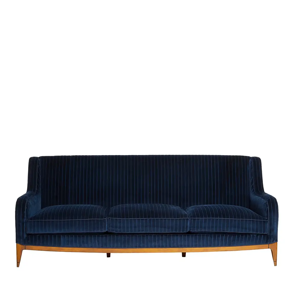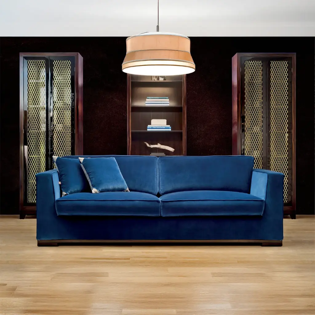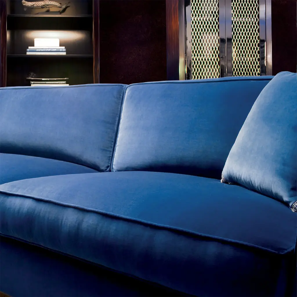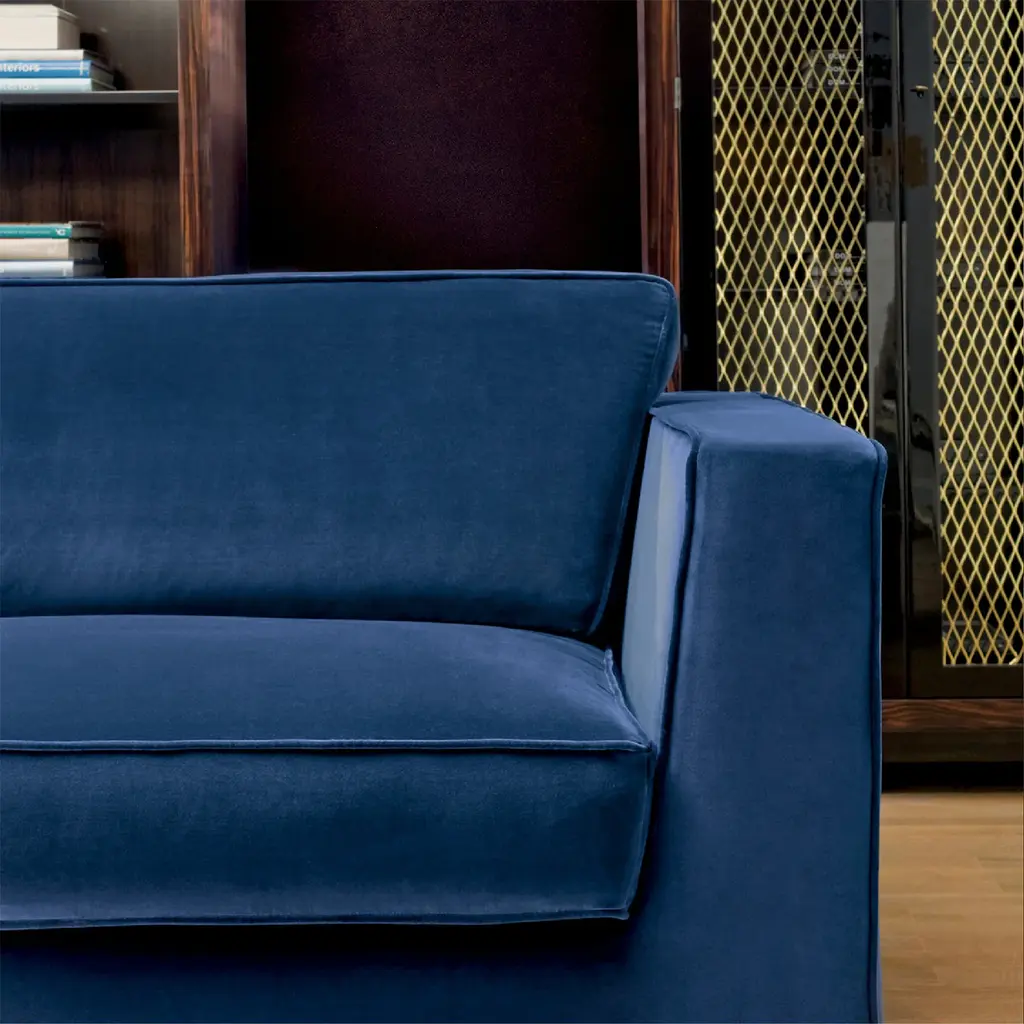 Distinctive for a linear silhouette and a classic aesthetic, this minimalist sofa will add a sophisticated accent to any living room, while also enlivening it with a chic pop of color. The seat is 43 cm high and plush, enclosed in straight armrests and backrest. The blue fabric upholstery (Cat. 3) can be changed and paired with contrasting piping for a striking and timeless effect. A sofa bed version is available upon request, please consult the Concierge for options and customizations.
