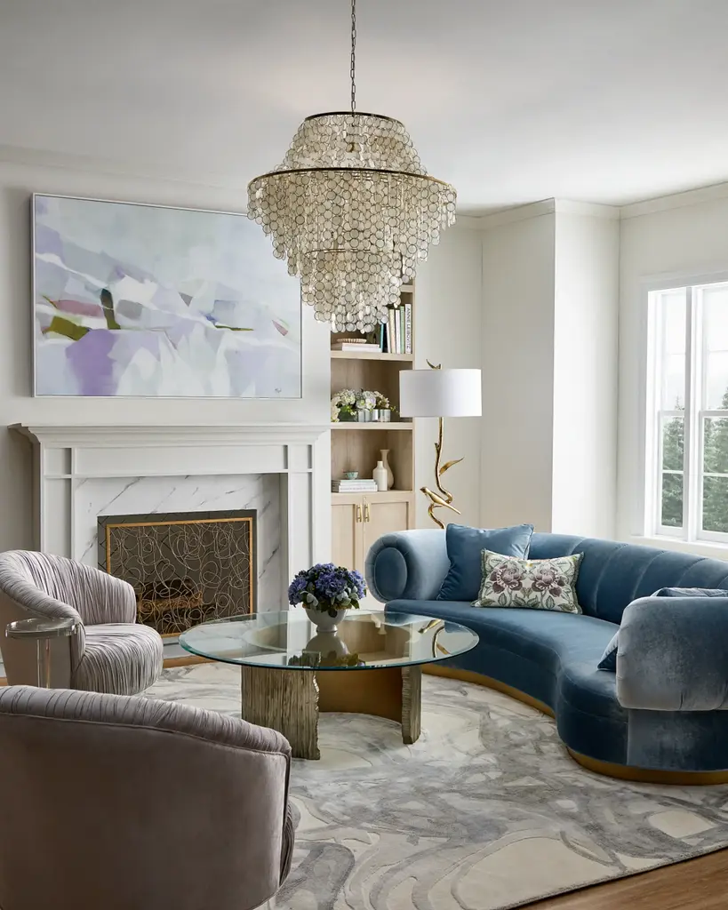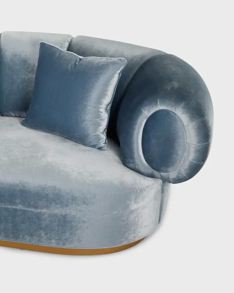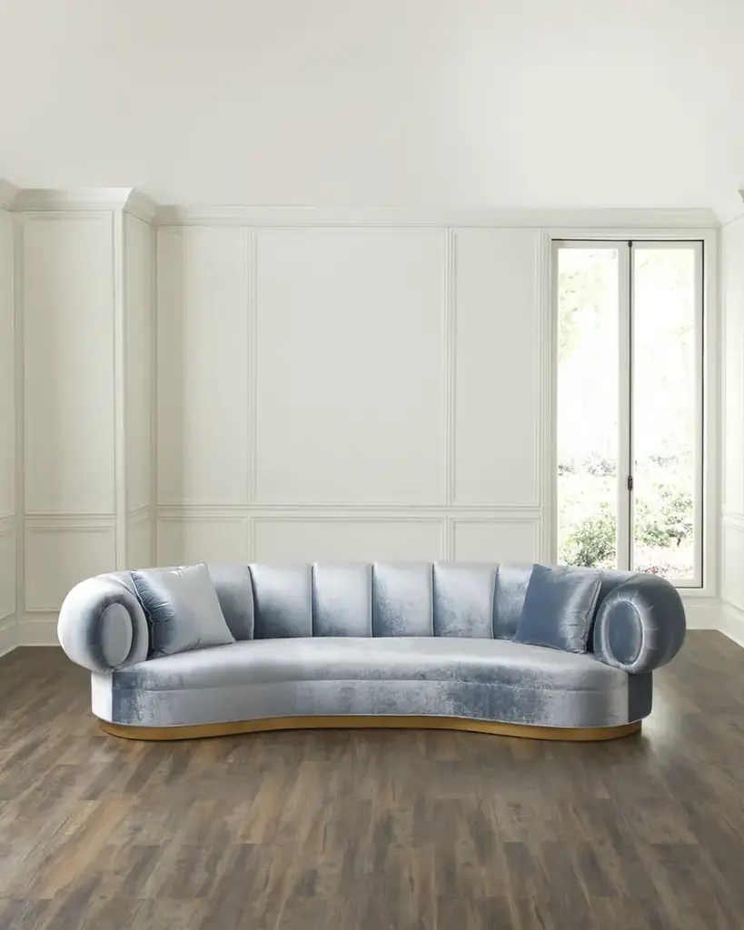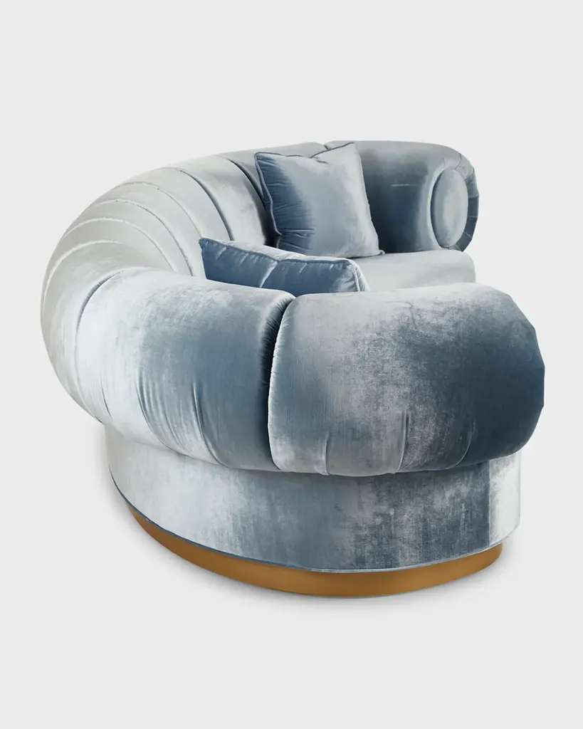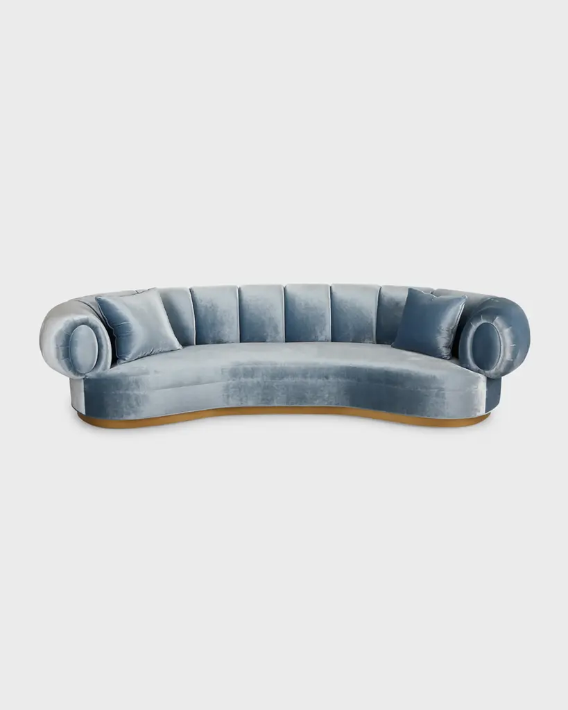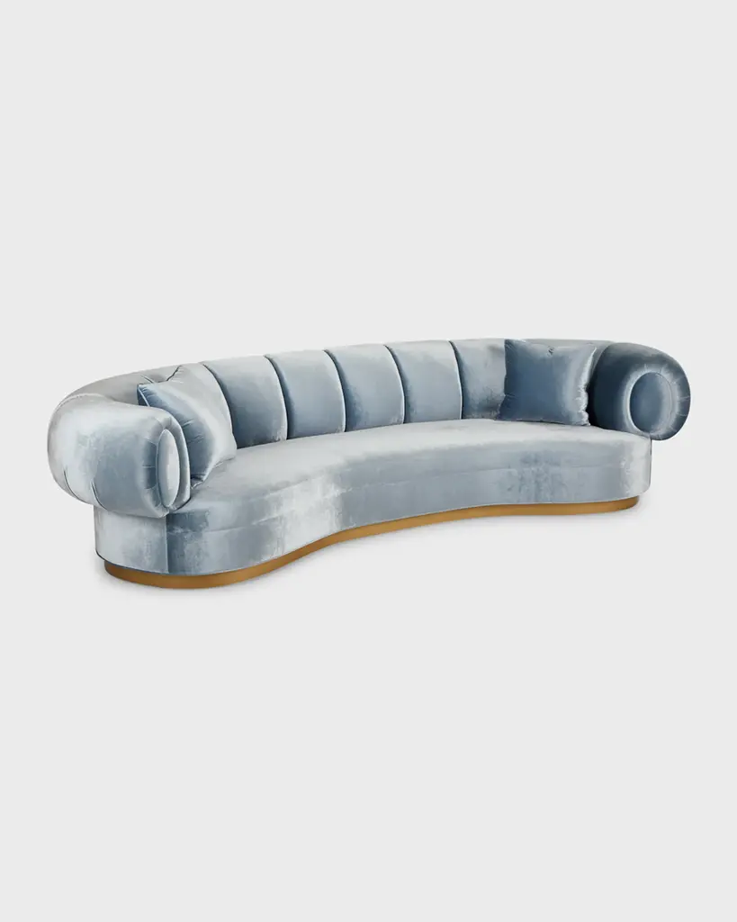 Velvet sofa features rounded, oversized arms, a channel-tufted back, and a gold-finished plinth base Includes one 24"Sq. pillow and one 20"Sq. pillow in polyester velvet Handcrafted of engineered hardwood and polyester velvet Overall, approx. 130"W x 54.5"D x 31"T Seat, 93"W x 25"D x 15"T Finished back Weight, 233.0 lbs Made in USA Boxed weight, approximately 377.0 lbs Shipping Direct from Vendor, usually ships within 65 business days. About Haute House: Haute House is a Hollywood-based design and manufacturing company that creates haute couture furnishings for the home. Designer and owner Casey Fisher has been designing furniture for years as an upholstery, textile, and retail space stylist. Instead of designing a line offering just one look, the Haute House line consists of three looks that offer something for every taste. However, there is one element present in every Haute House design—a great sense of style.