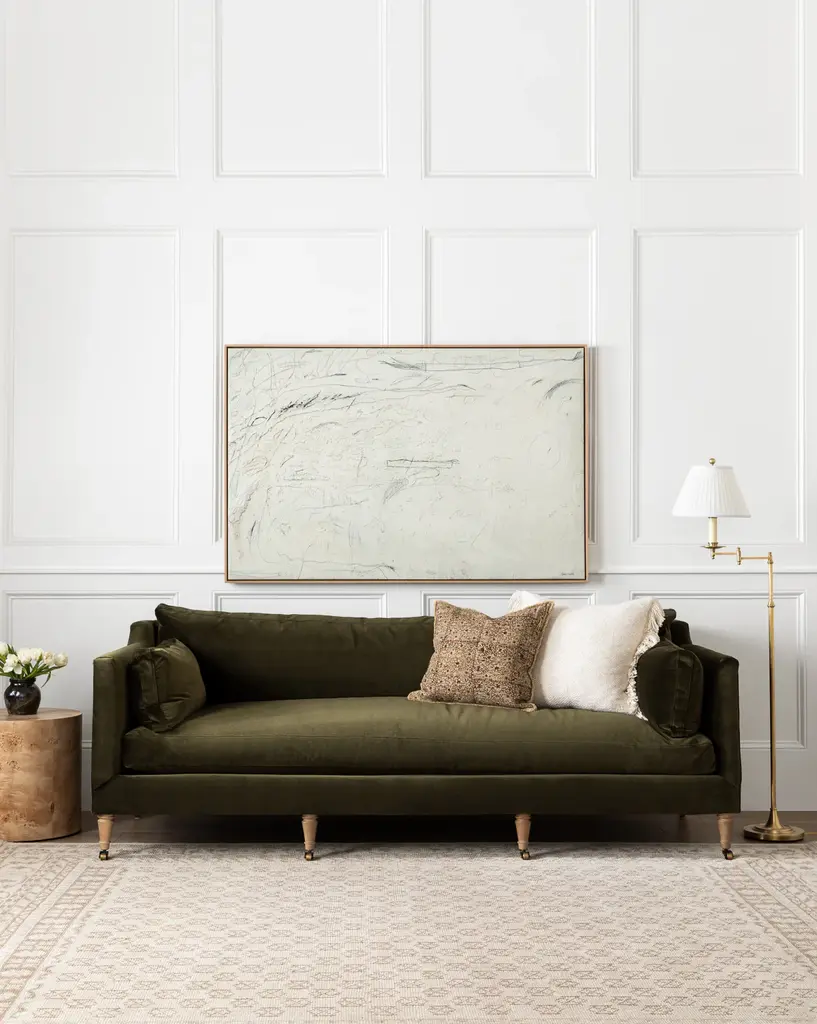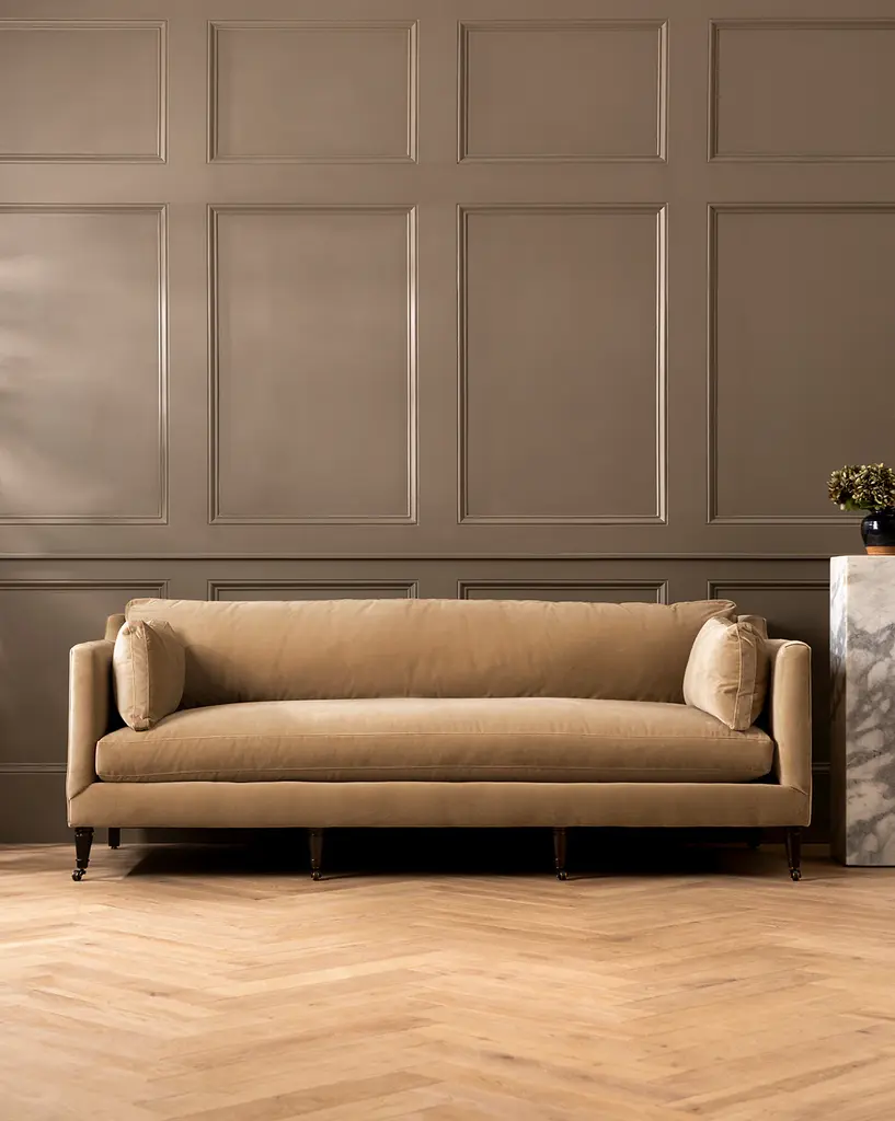 Our Haverford Upholstered Sofa 90" is a masterful combination of contemporary and classic elements. Handcrafted with luxurious comfort in mind, its cushions are filled with a feather blend around a high-strength suspension. The turned maple legs and shaped arms give the sofa a traditional, but approachable feel. Customizable in a wide array of fabrics, you can make this made-to-order piece entirely your own.