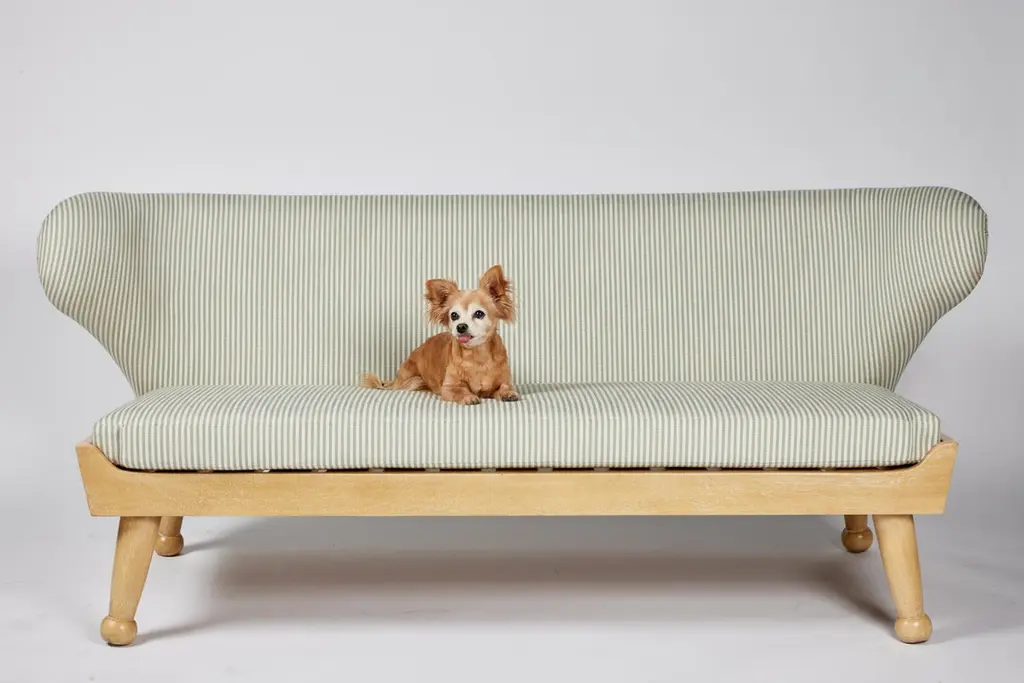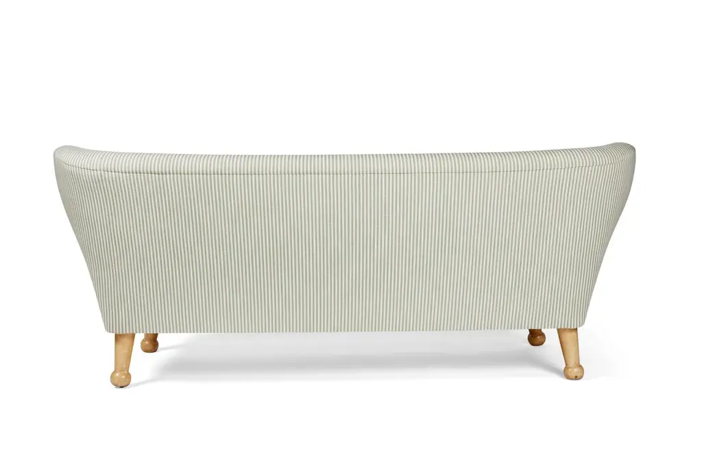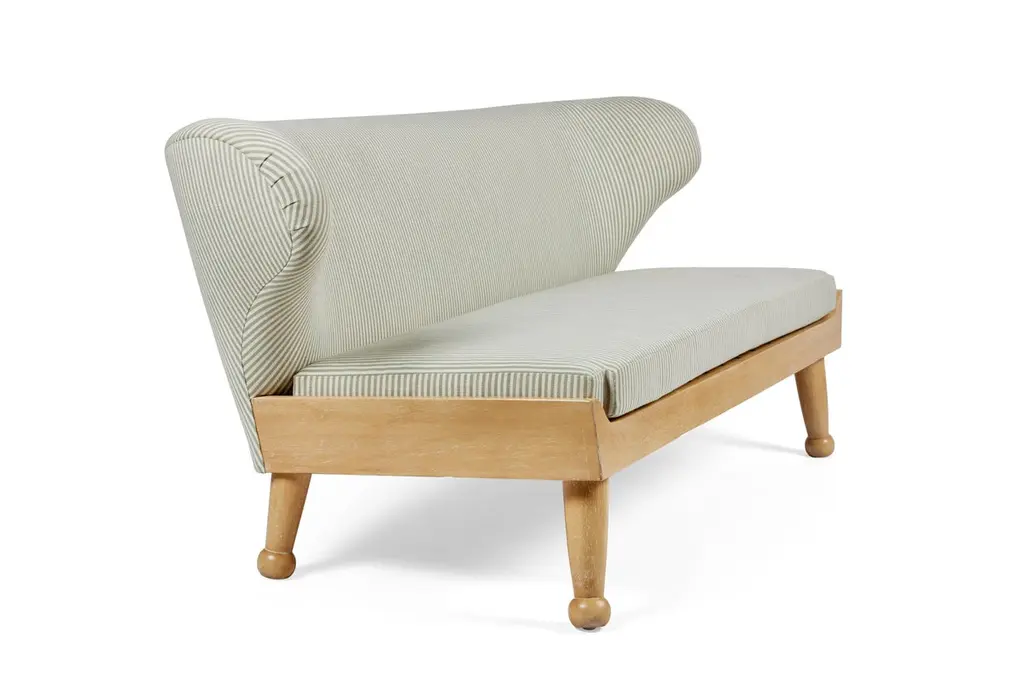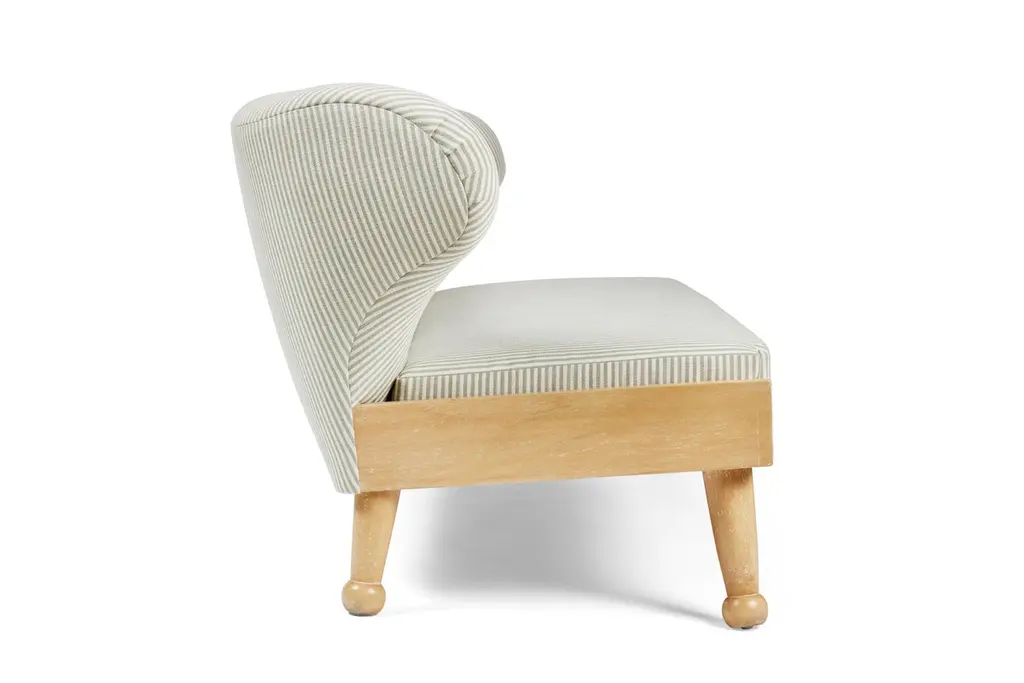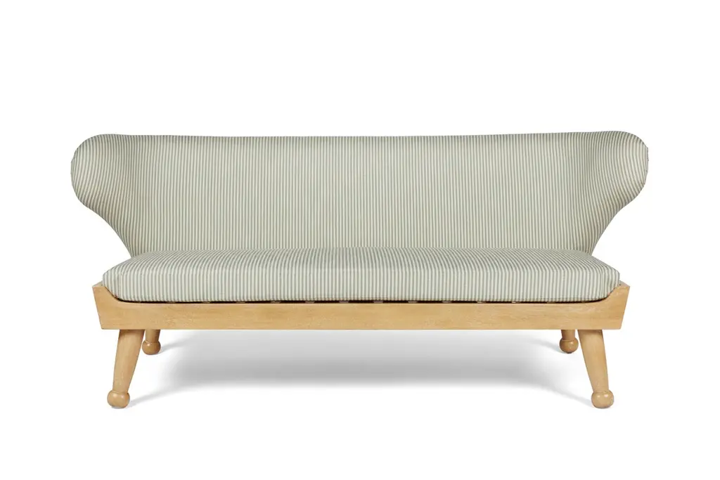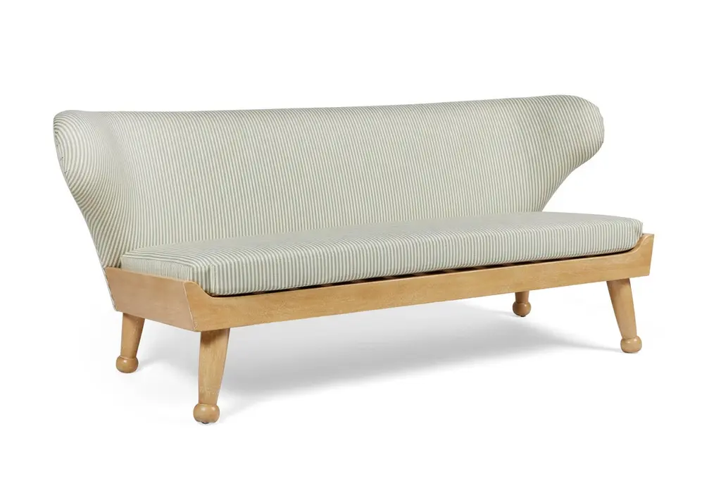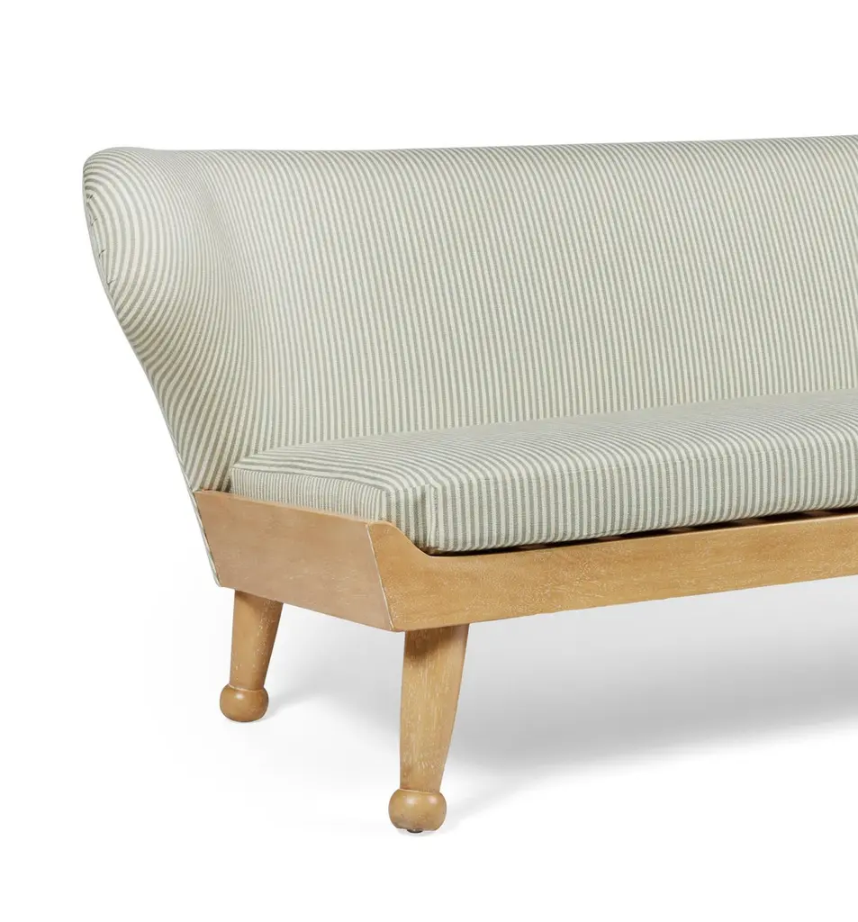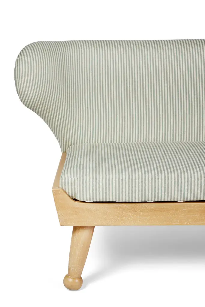 Our winged Hayworth Sofa, with low-profile design, is the newest addition to our Hayworth Collection. Bench made in Los Angeles, its soft curves pair with a sturdy foundation of Iroko wood in this indoor-outdoor piece created to embrace spirit of endless summer. Shown here in our Carbon Canyon finish, it is ideally scaled for outdoor lounging and summer entertaining, our Hayworth Sofa comfortably seats three. Designed with functionality in mind, the upholstered back cushion and removable seat cushion, are both made of outdoor dry-fast foam. Base and legs are made of solid Iroko with slats for drainage. Shown here in our Carbon Canyon finish, it is also available in our Rincon finish. All of our outdoor upholstered pieces come standard with an ivory outdoor woven textile (not pictured here). They are also available as COM (customer’s own materials). Please specify your preference upon ordering. Dimensions: 72" W × 31" D × 29.5” H Seat height: 17” H (at the front of the seat, and tapers down in back) COM Yardage: 14 yards solid All of our pieces are bench made in Los Angeles by local artisans. Current lead time: 16-22 weeks + transit time. Inquire about customizations, alternate materials & finishes, or coordinating outdoor cover. About this piece: + Fabric shown in images in COM. This piece comes standard with an ivory outdoor woven textile (which is not shown here). COM materials may be specified on any of our upholstery.+ Fade & mildew resistant fabric is recommended for outdoor usage or in high-humidity environments. + Please inquire about yardage requirements for patterned fabrics. + COM: Lead time begins when fabric arrives.+ Covered or protected storage is advised. Avoid exposure to extreme temperatures, which may damage the frame.+ Available as shown in our Carbon Canyon finish, it is also available in our Rincon finish.+ Wood will naturally grey, fade or patina over time; exposure to the elements will expedite this inherent trait. + Optional cover can be purchased upon request. + Coordinating ottomans sold separately and not included in the listing price. About August Abode: August Abode is a moving portrait of California life, an invitation to reconnect with the allure of nature to enhance our everyday lives. Founded in Los Angeles in 2019 by designer Stefani Stein, August Abode is an artisan-made home collection capturing the West Coast spirit of endless summer. We make relaxed and refined statement essentials inspired by the beauty of living in the golden state. Through observation and abstraction of nature, we design furniture and wallcoverings in which form, function, and fine craftsmanship have the ability to positively impact our everyday lives through our homes. We are committed to making responsibly, not overproducing. Our view is to make future heirlooms. Discouraged by the impact of Los Angeles landfills being the largest in the county, we aim to reduce our participation in the epidemic of thoughtless production. Our made-to-order pieces encourage a steady flow of business to LA’s rich artisan trade community, while keeping our production process local and environmentally ethical. We are investing in the next generation of skilled makers, to encourage a sustainable and vertical model that reduces wasteful production.