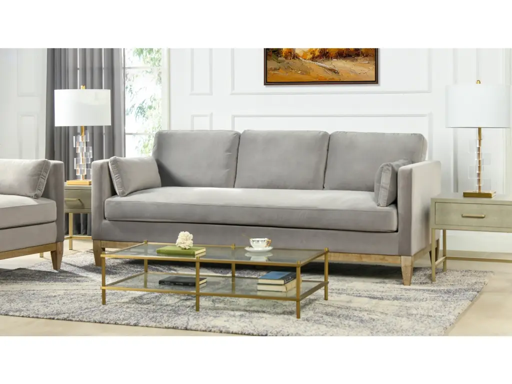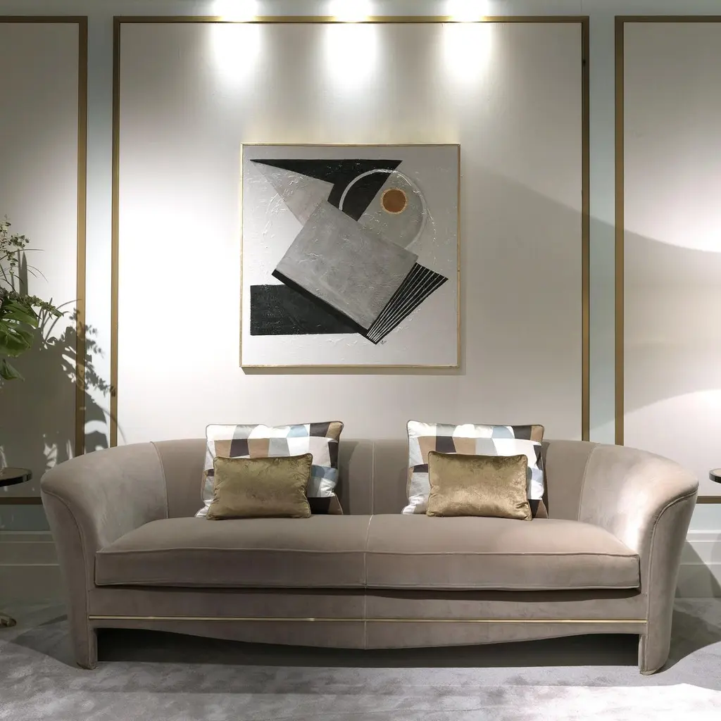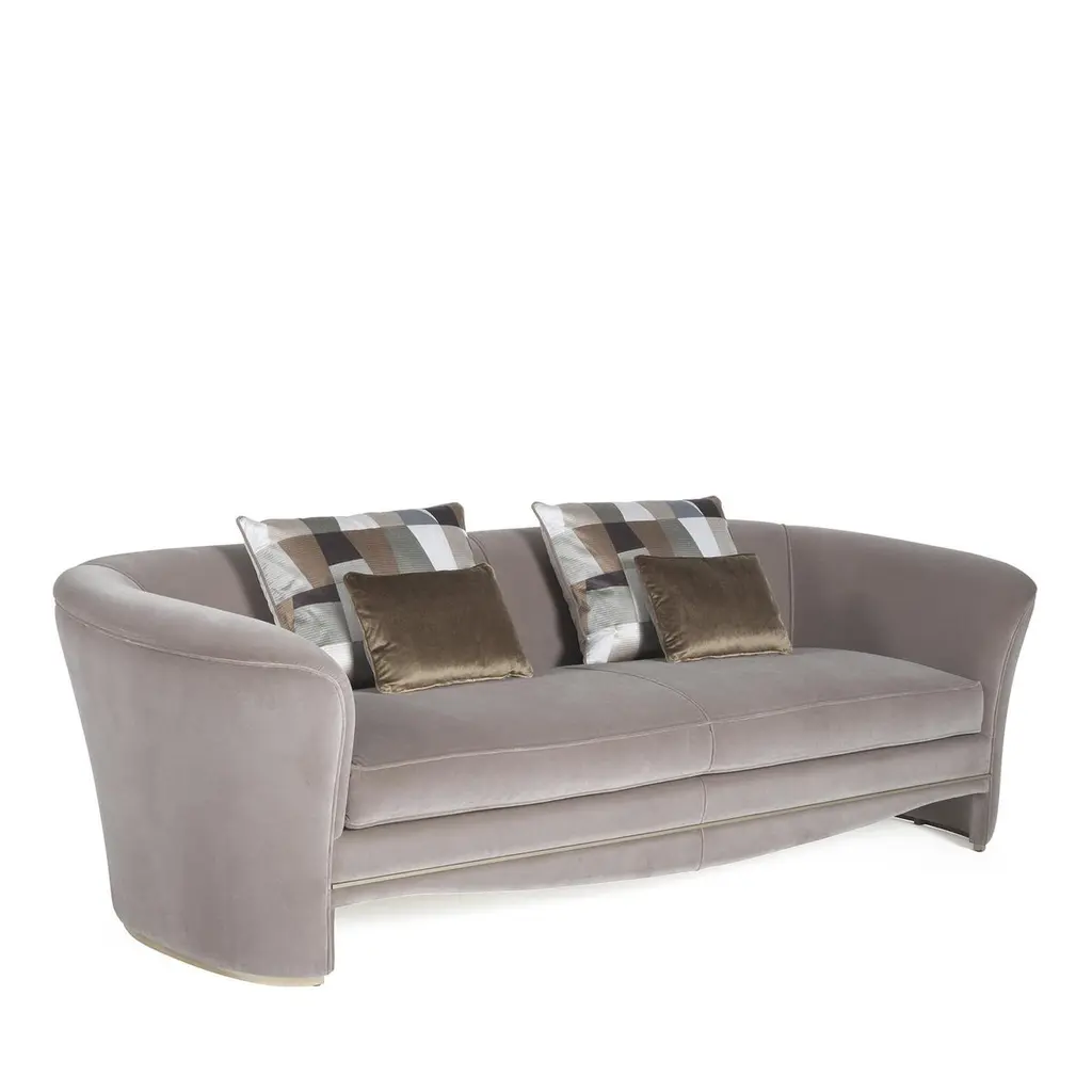 From the Jacob collection, this exceptional sofa offers maximum comfort and an elegant allure. A modern take on the Cabriole style, the curves of the broad back effortlessly flow into the sinuous arms, creating an embracing silhouette. The wood frame is padded with hypoallergenic polyurethane and upholstered in a soft lilac velvet for a luxurious feel that enhances its Minimalist design and the accompanying patchwork silk fabric pillows. This sofa will be the focal point of a modern or traditional living room, and is also available as a 2-seat, armchair, pouf, and other customizable sizes.
