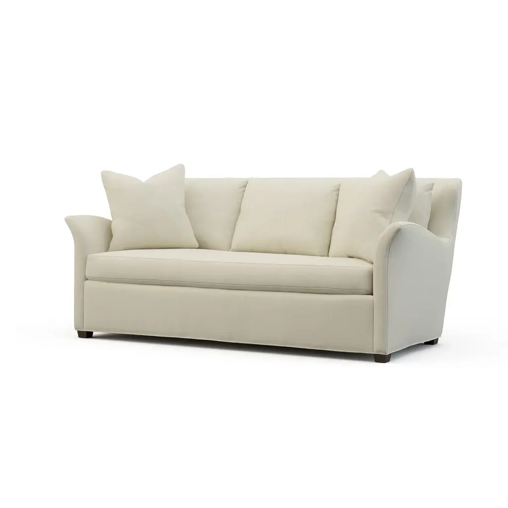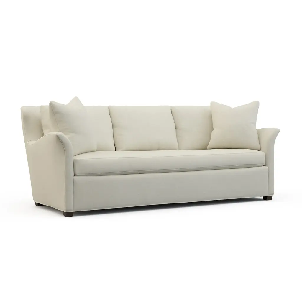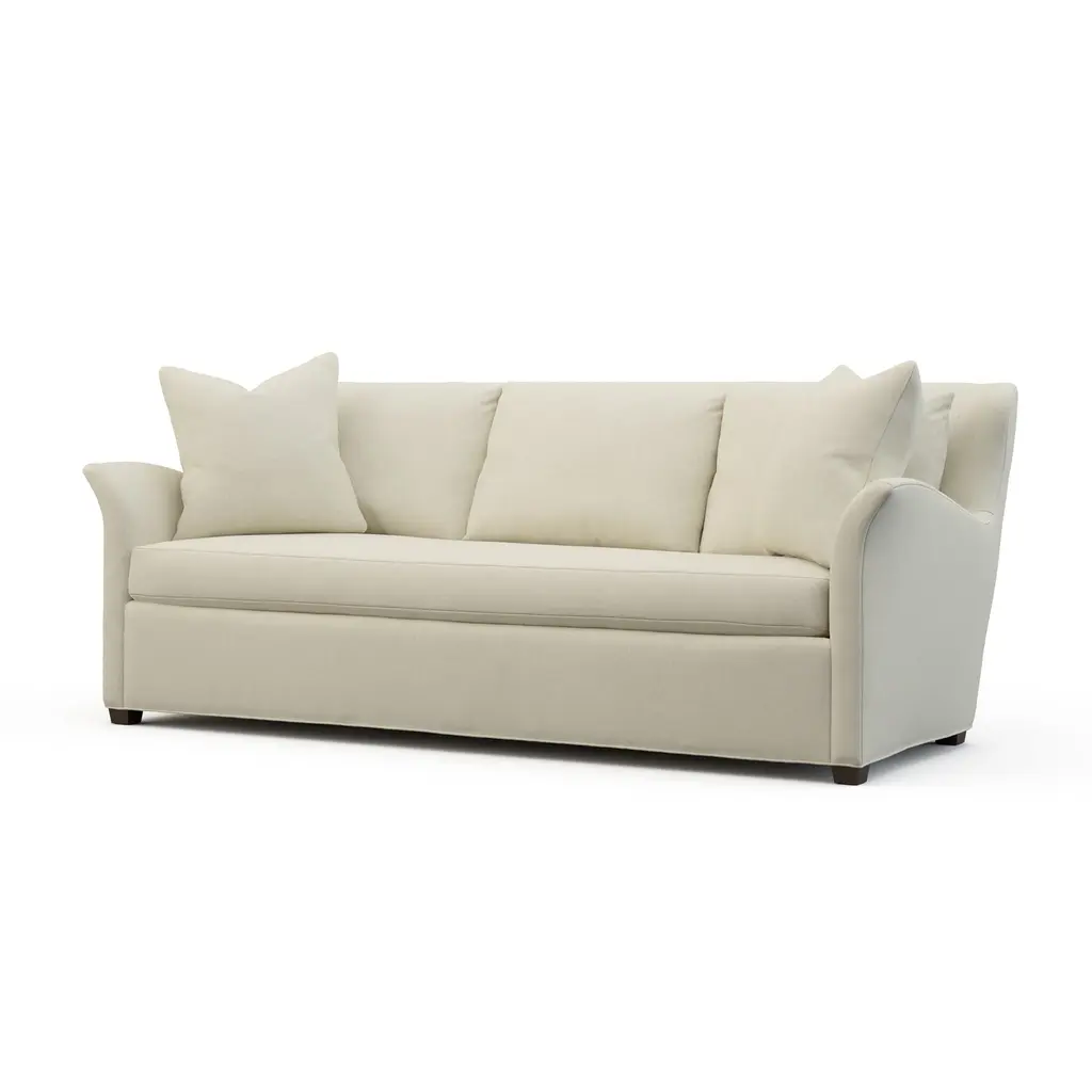 The Heron Sofa is a modern wingback sofa with splay arms, combining striking design with exceptional comfort. Exuding sophistication and relaxed luxury, it features a high back and sculptural shape that makes a bold statement in any room. If you're seeking a modern sofa, the Heron Sofa offers both style and comfort making it the ideal sofa for your space. Ships In 8-10 Weeks Three loose back pillows One loose seat cushion As Shown Fabric: Rayburn Oatmeal, Spillman Olive (lifestyle) As Shown Finish: Antique Walnut If you choose to purchase COM, once you have placed your order a customer service rep will contact you regarding where to send your fabric. Please note that current lead time is 17-19 weeks once your fabric arrives at the factory, and if unused fabric is under 1.5 yards, it cannot be sent back to you.This product can be special ordered in additional fabrics, leathers, finishes, and cushion fillings. Click here to email us for for additional information about special ordering.This image is for illustrative purposes only. The colors shown are accurate within the constraints of lighting, photography, and the color accuracy of your screen.