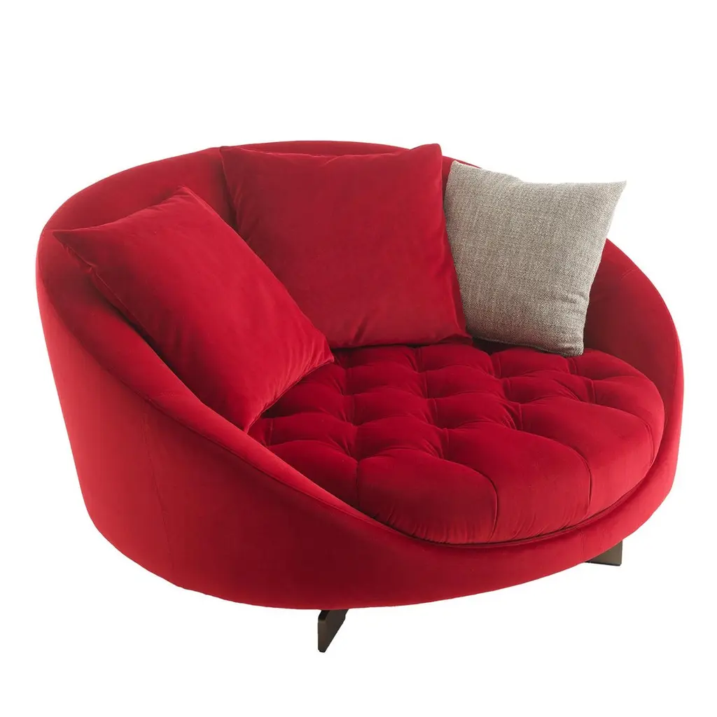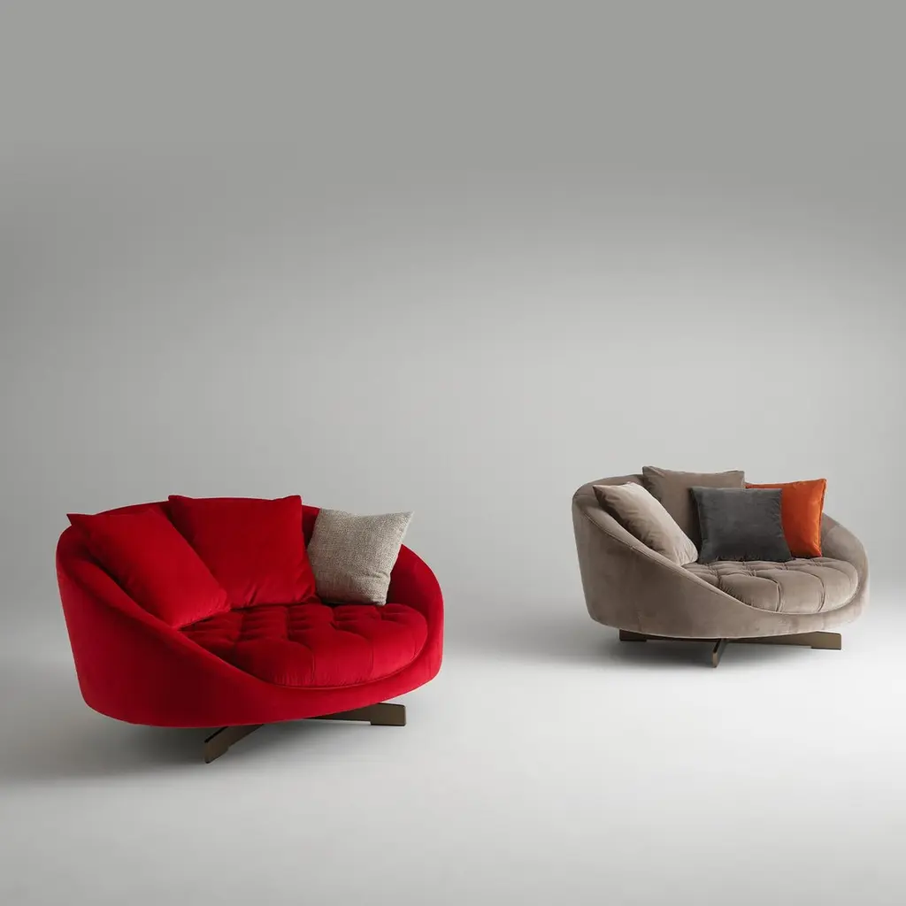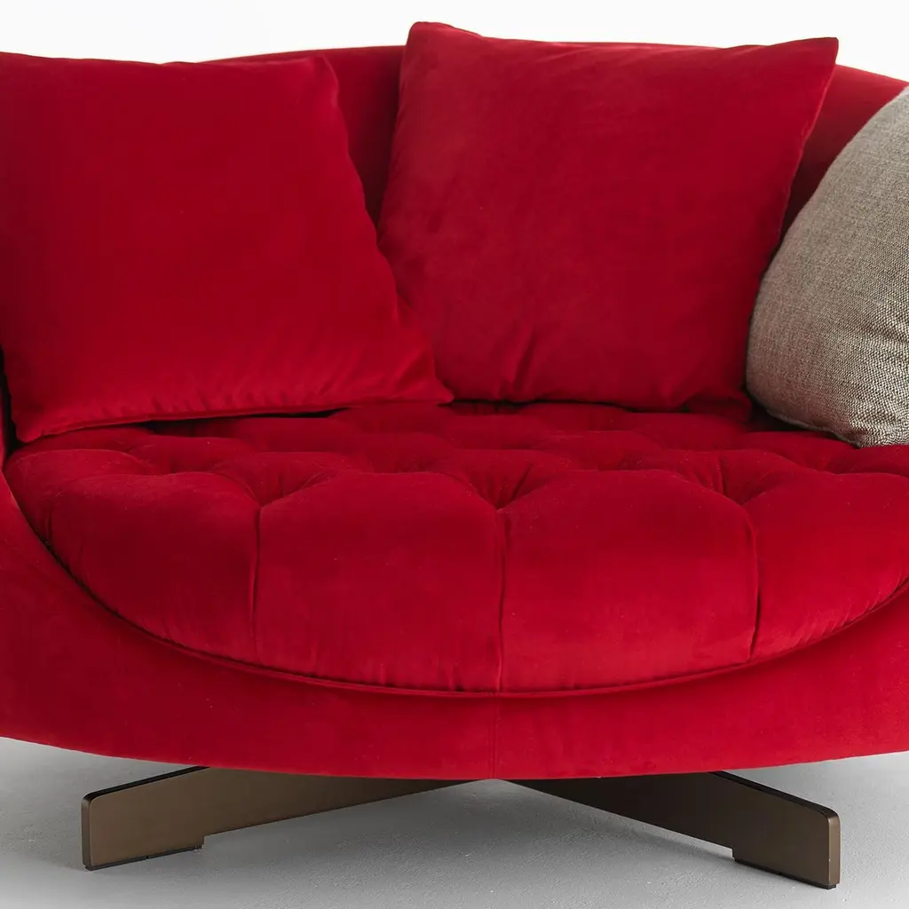 A stupendous cushioned sofa by Studio MA characterized by a soft and warm allure that is an enticing invitation to comfort and relaxation, this stunning piece will take center stage in a contemporary living room. Resting on a swivel base, it features a rounded shape enveloping a stunning tufted seat, entirely upholstered of red velvet. The cushions are not included and can be added upon request, please ask the Concierge for details.