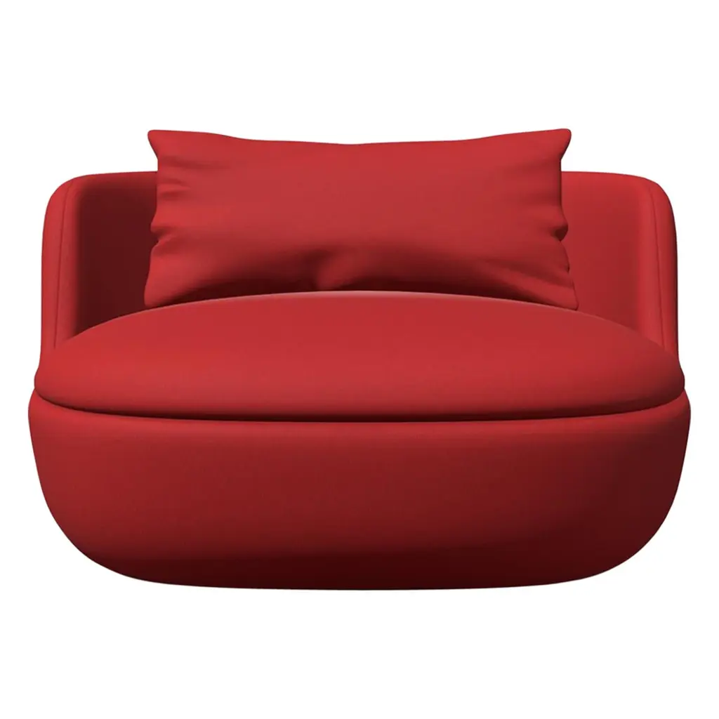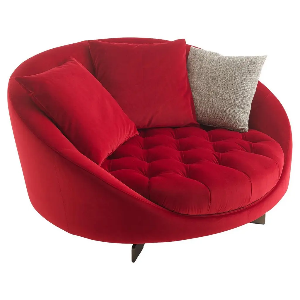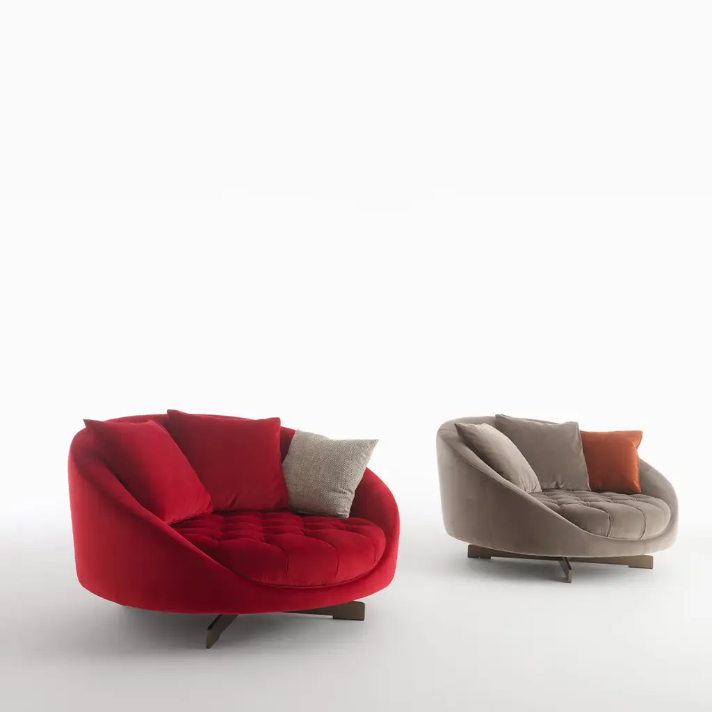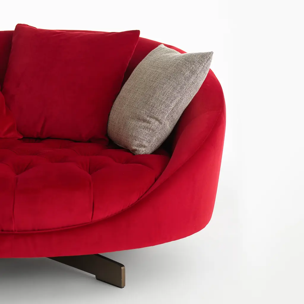 A stupendous cushioned sofa by Studio MA characterized by a soft and warm allure that is an enticing invitation to comfort and relaxation, this stunning piece will take center stage in a contemporary living room. Resting on a swivel base, it features a rounded shape enveloping a stunning tufted seat, entirely upholstered of red velvet. The cushions are not included and can be added upon request, please ask the Concierge for details.
