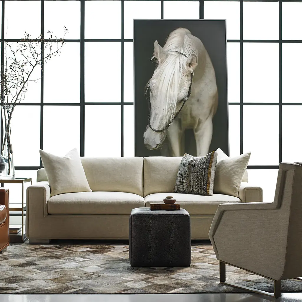 The Hinson collection also includes a chair (sold separately). Ships In 8-10 Weeks Two loose back pillows Two seat cushions As Shown Fabric: Crystal Natural If you choose to purchase COM, once you have placed your order a customer service rep will contact you regarding where to send your fabric. Please note that current lead time is 17-19 weeks once your fabric arrives at the factory, and if unused fabric is under 1.5 yards, it cannot be sent back to you.This product can be special ordered in additional fabrics, leathers, finishes, and cushion fillings. Click here to email us for for additional information about special ordering.This image is for illustrative purposes only. The colors shown are accurate within the constraints of lighting, photography, and the color accuracy of your screen.