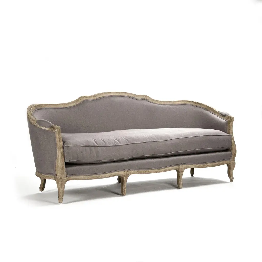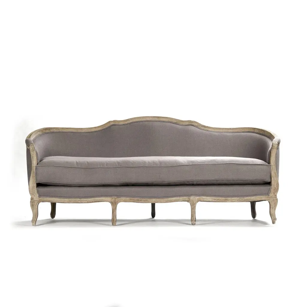 Curved back sofa upholstered in grey linen on limed grey oak frame.