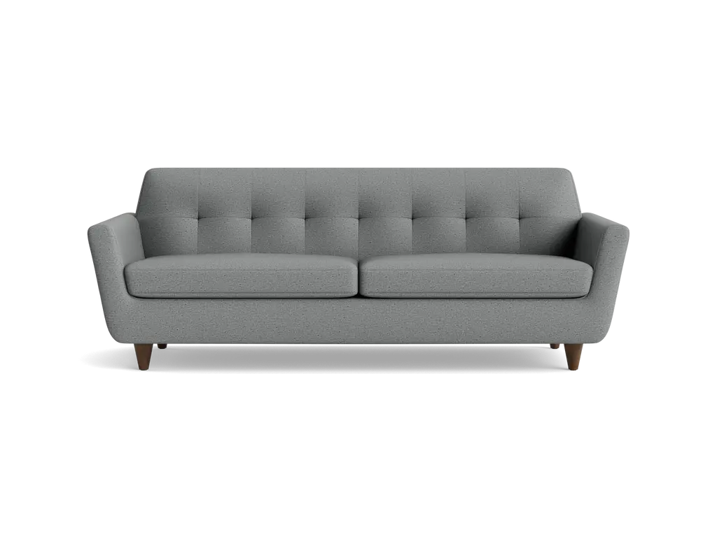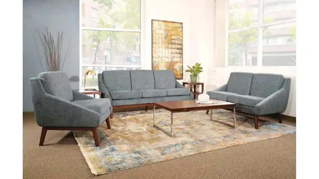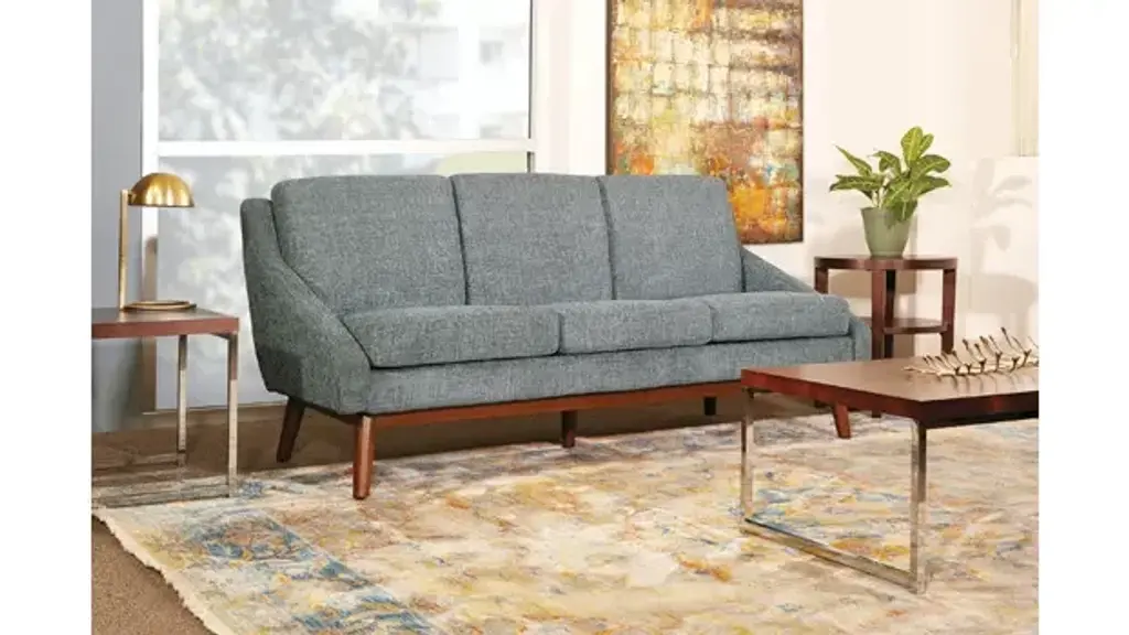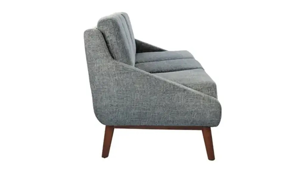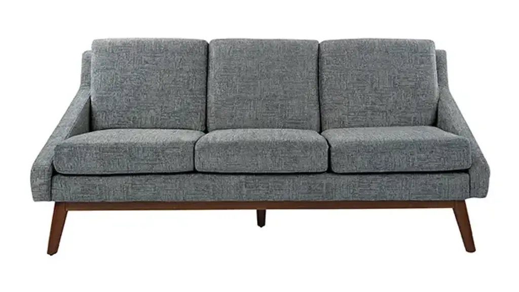 Mid Century modern looking furniture with solid wood legs stained to a coffe finish. Available in two fabric colors. Ships assembled simply screw the legs in on arrival.
