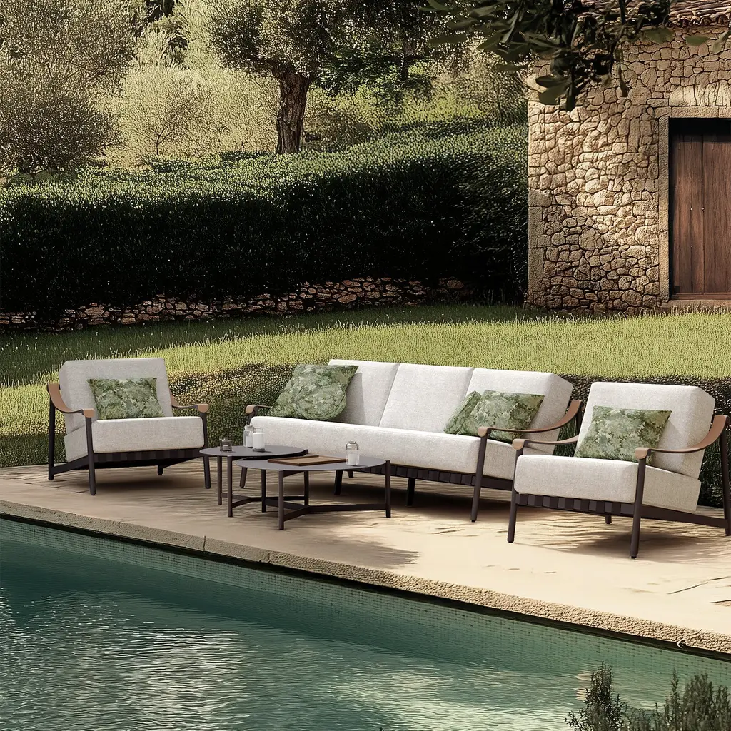 The Hudson Outdoor Collection by Lemieux et Cie brings sculptural modernism to the outdoors with an unexpected mix of materials. Luxurious faux all-weather leather arms, Italian strapping, and contoured aluminum frames create an airy, architectural profile that’s both refined and durable. Thoughtfully engineered with ergonomic comfort and the perfect pitch for relaxation and lounging, each piece is paired with custom deep cushions to offer elevated comfort and timeless style in any outdoor setting.