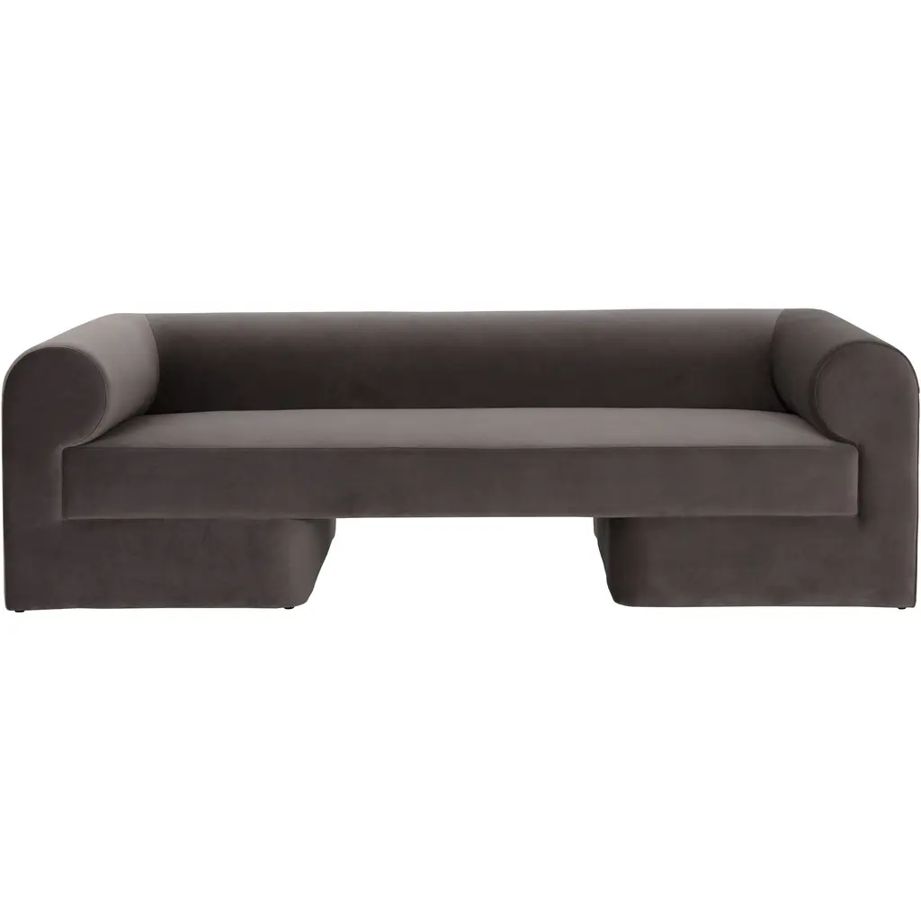A bold take on contemporary style, this sofa will stand out in any space. Features rounded back and arm rests for ultimate comfort. Fully upholstered in luxurious meg ash fabric. Pair with coordinating armchair to complete the look.