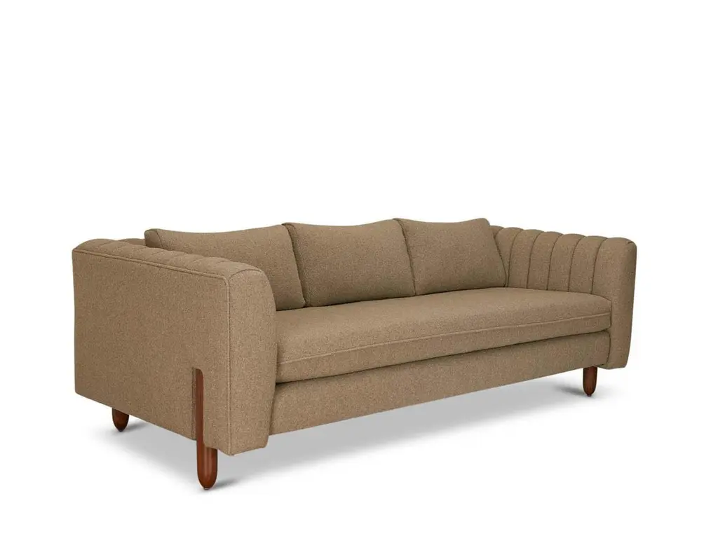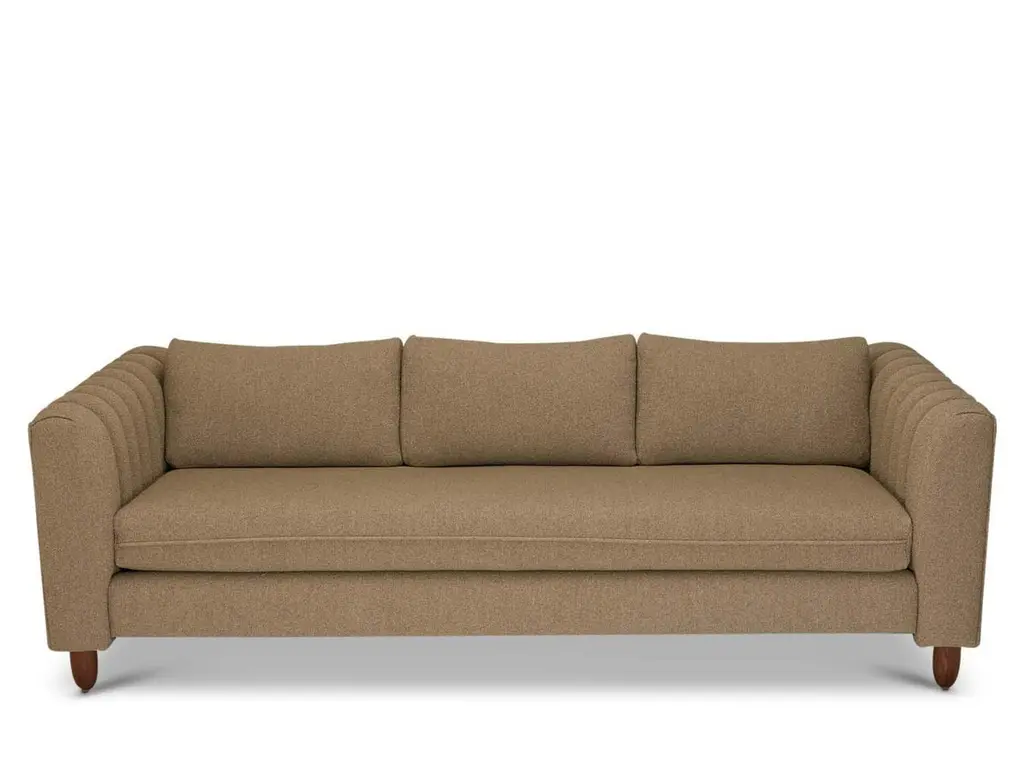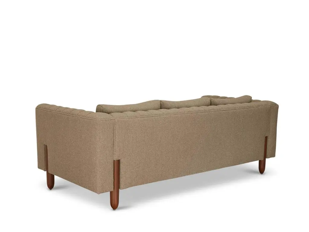 The Isherwood sofa features a channel tufted body with loose bolster cushions. The turned legs are made of solid white oak or American walnut and are inset on the sides revealing the leg detail. The Lawson-Fenning Collection is designed and handmade in Los Angeles, California.