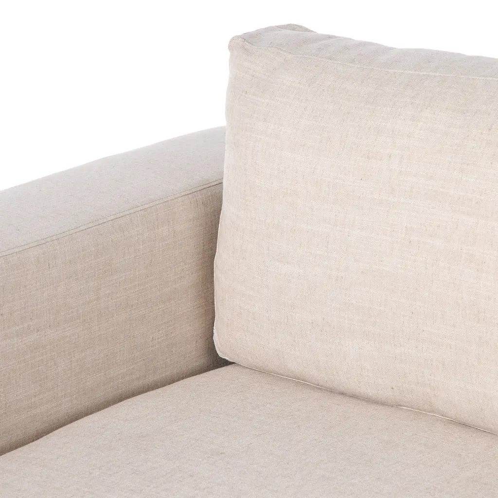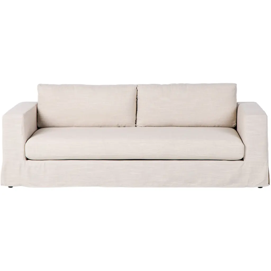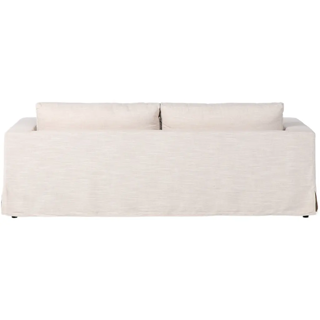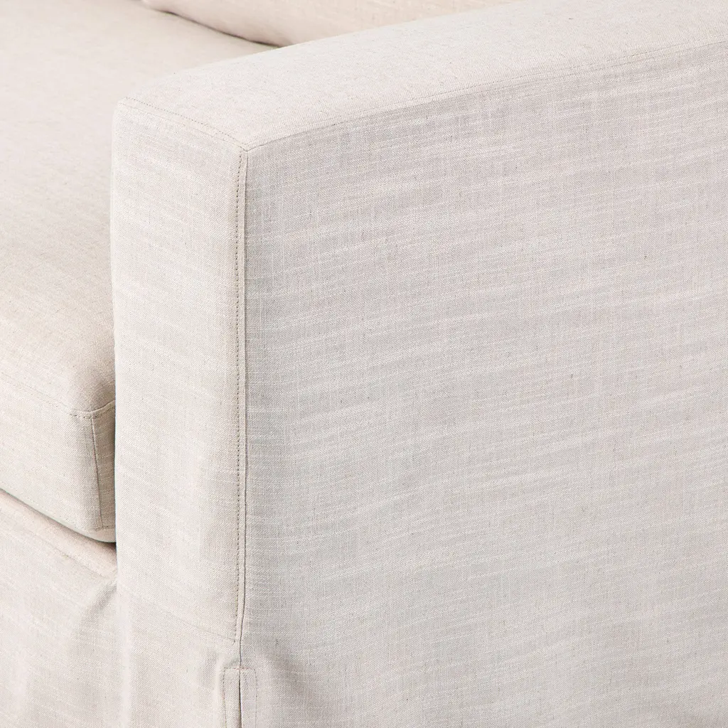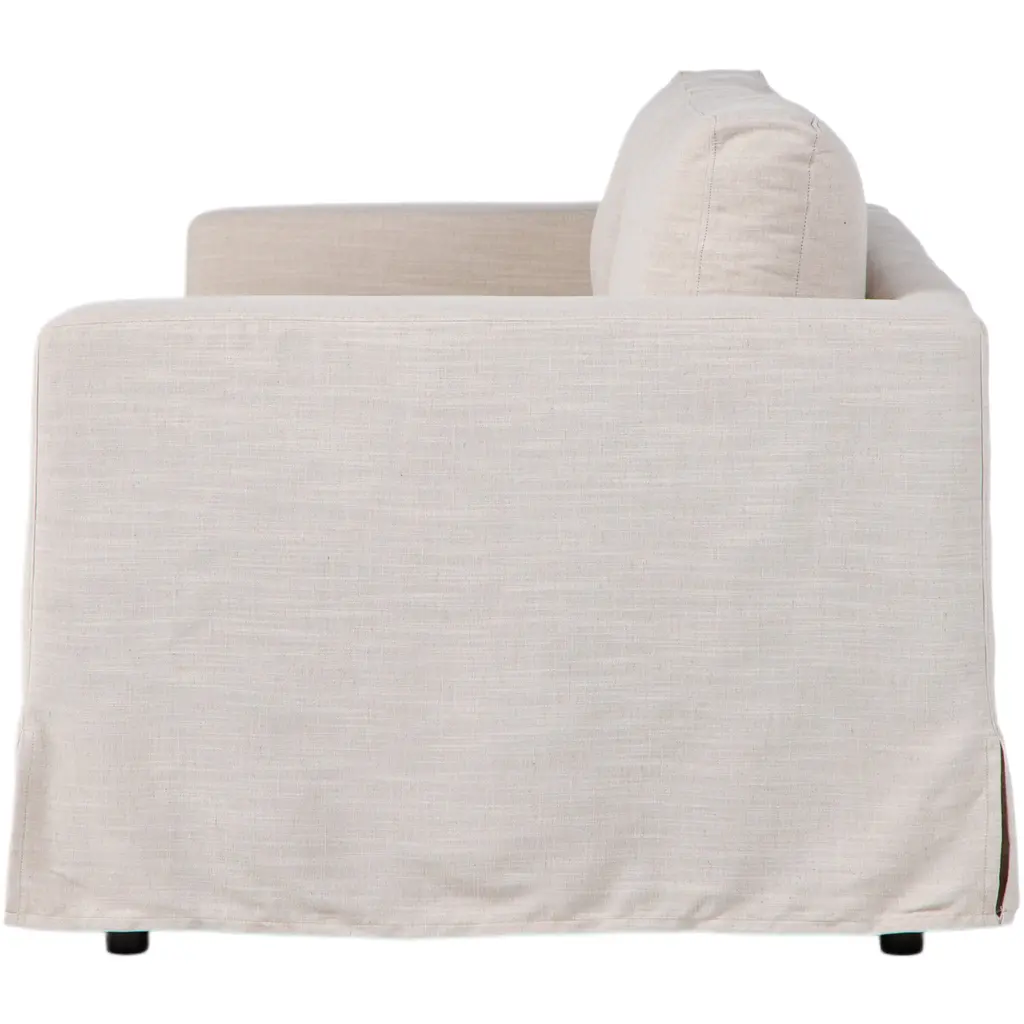 The Ismara Sofa- 95" is a perfect blend of comfort and style, designed to bring a relaxed elegance to any space. Its soft, slipcovered design features deep pleated details and a draped silhouette, highlighting the wide arms and oversized bench cushion. Upholstered in a poly/linen blend, this sofa combines inviting comfort with effortless style, making it a versatile addition to any living area. The slipcover is non-removable, ensuring a sleek and tailored look.
