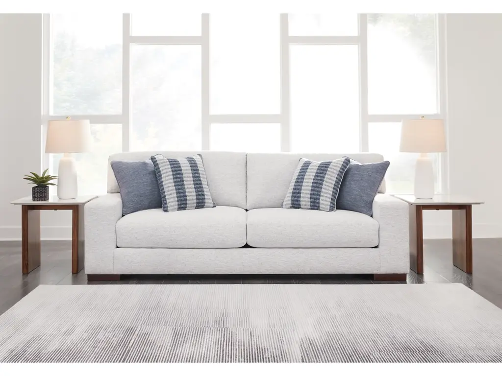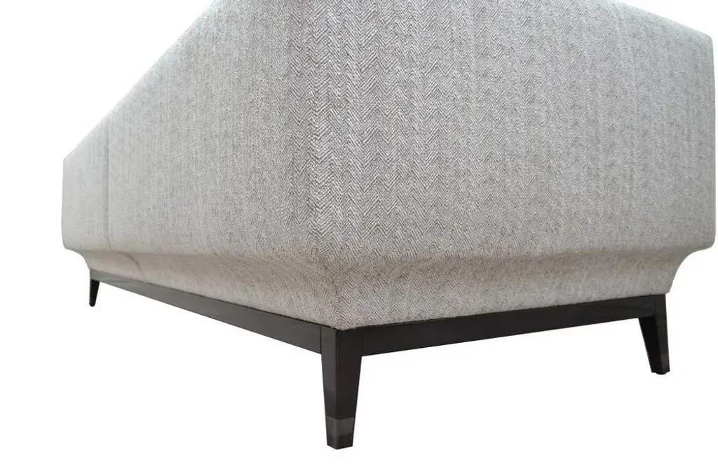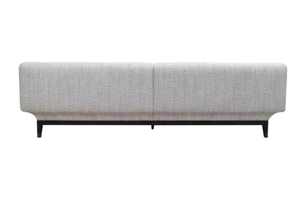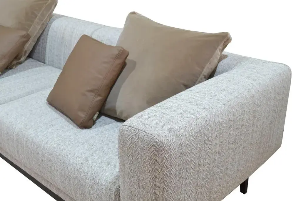 Exuding elegant aesthetic from every angle, this three-seat sofa of the Cavio Casa Collection is defined by simple geometric lines and a mid-century allure. The wooden structure is covered with parchment in a glossy mocha color that encloses seat and back in a continuous line transitioning to the armrests in an angled silhouette. Upholstered in ivory fabric to create a bold color contrast, this sofa will suit any interior, from traditional to contemporary. 4 decorative cushions are included.