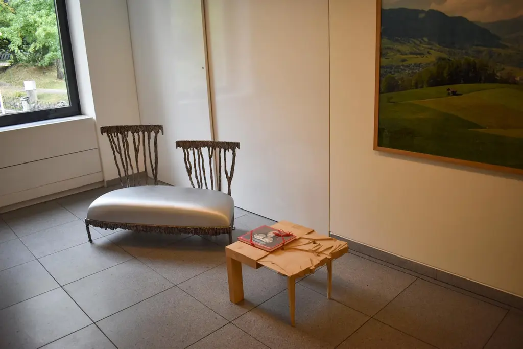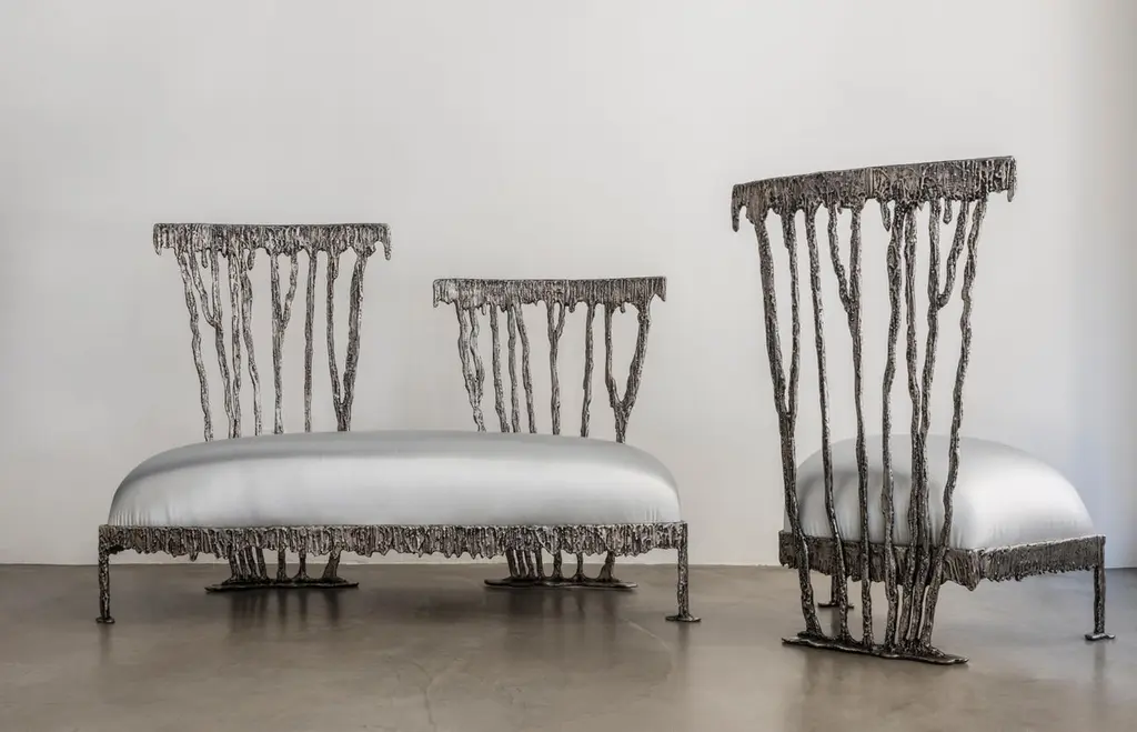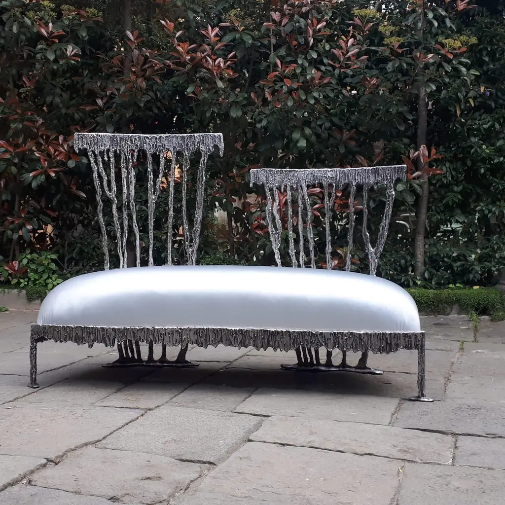 Two-seat sofa with a structure in sand casting with patinated aluminum finish for Dilmos Milano. The seat is covered with a silver soft fabric. Reproduces the interrupted moment, the suspension in space and time that is created when one makes a gesture, even a simple gesture like dripping paint.Signed by the designer. Size:cm 140 x 60 x 39-94 H.