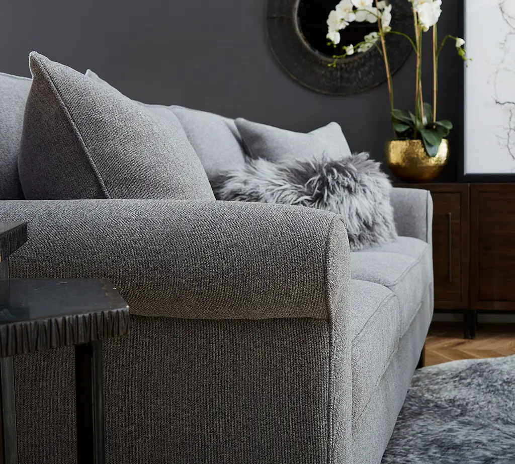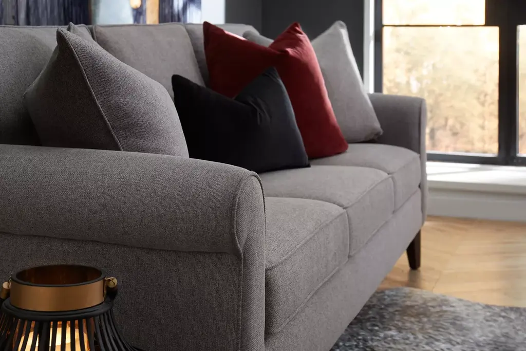 Our Jenna sofa blends simple, modern styling with defined lines for a tailored look. This comfy piece features a classic, clean silhouette and tapered legs in a dark walnut finish. Two plush, feather-filled toss pillows complete the look with cozy comfort.