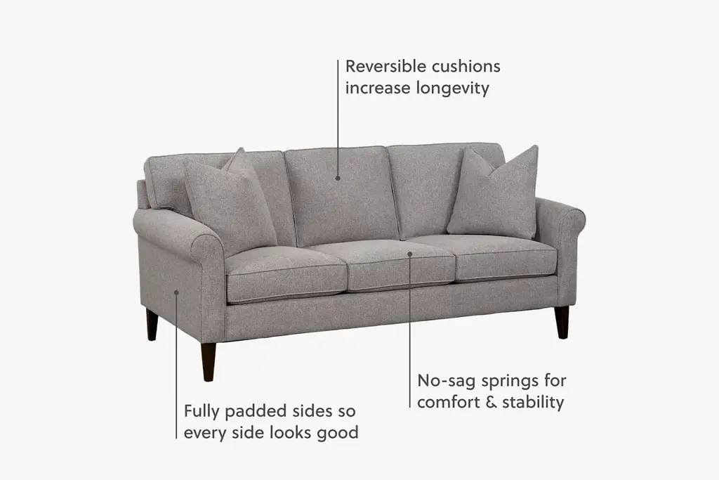Our Jenna sofa blends simple, modern styling with defined lines for a tailored look. This comfy piece features a classic, clean silhouette and tapered legs in a dark walnut finish. Two plush, feather-filled toss pillows complete the look with cozy comfort.