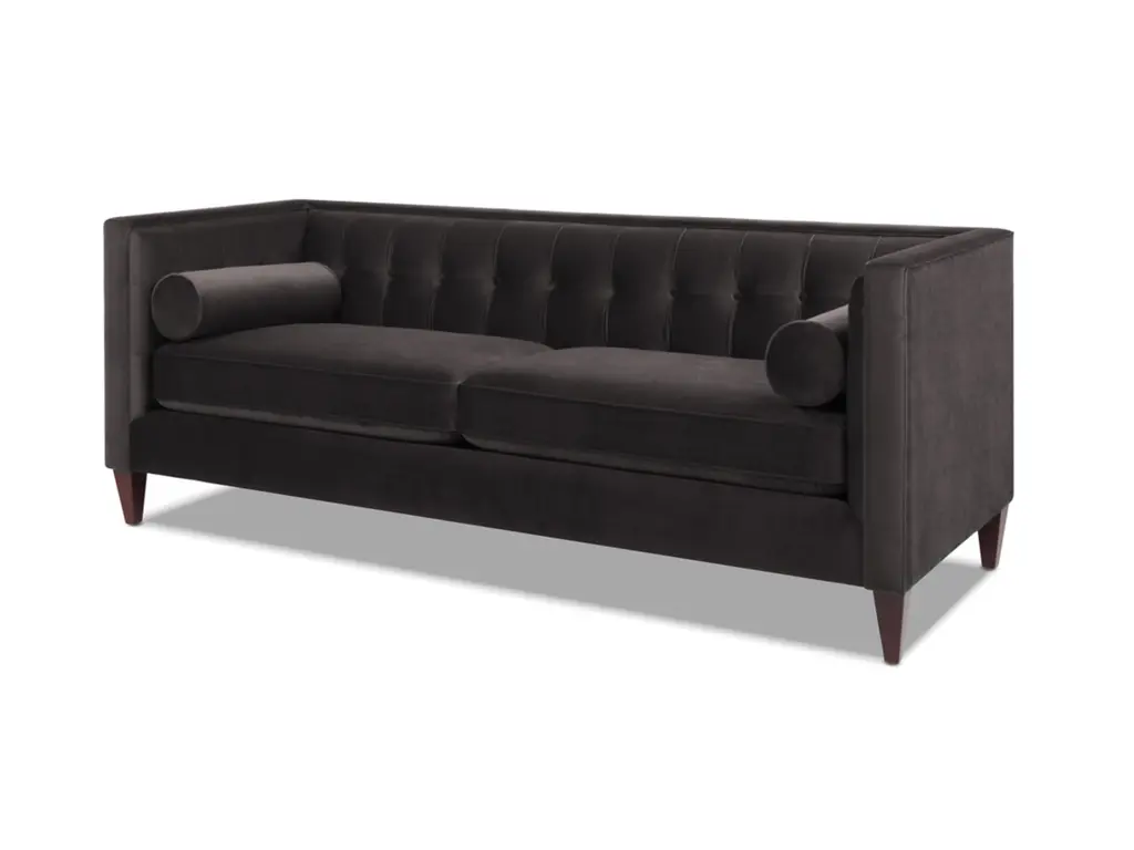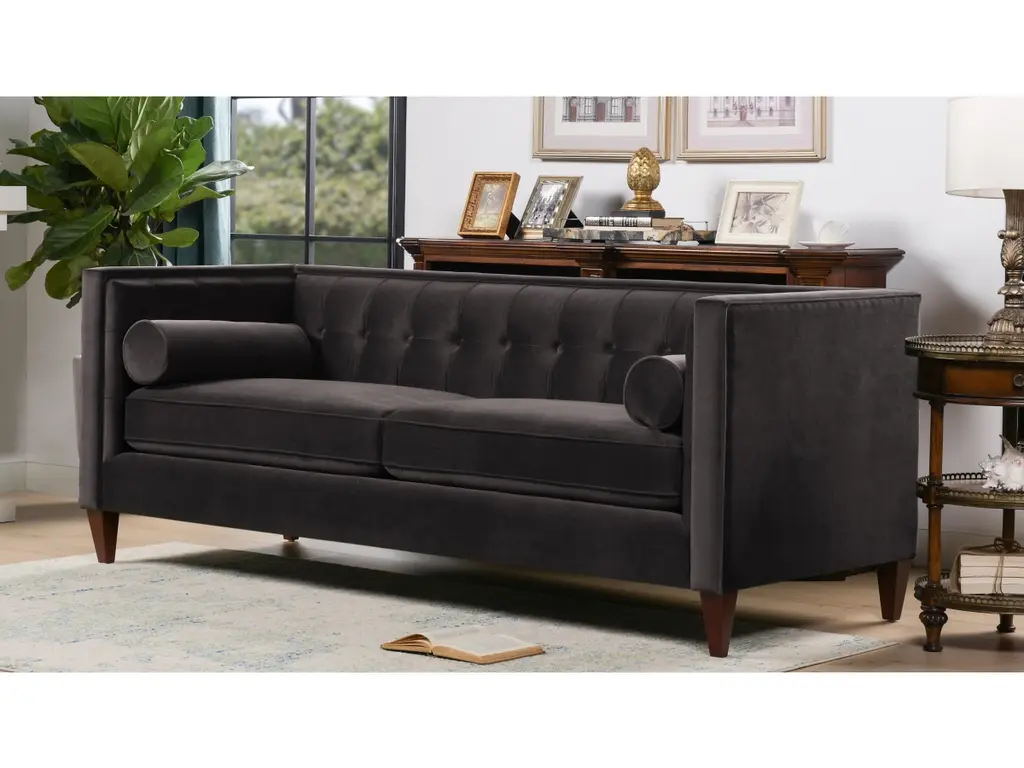For a bold, modern statement to your living room decor, look to the Jack Seating Collection by Jennifer Taylor Home. The traditional tuxedo silhouette gets a modern makeover in this perfectly square button-tufted design, with tapered wood legs and a geometric silhouette reminiscent of the Chesterfield style. The medium-firm seat cushions are completely removable and reversible, and are set off stylishly with two accent bolster pillows.