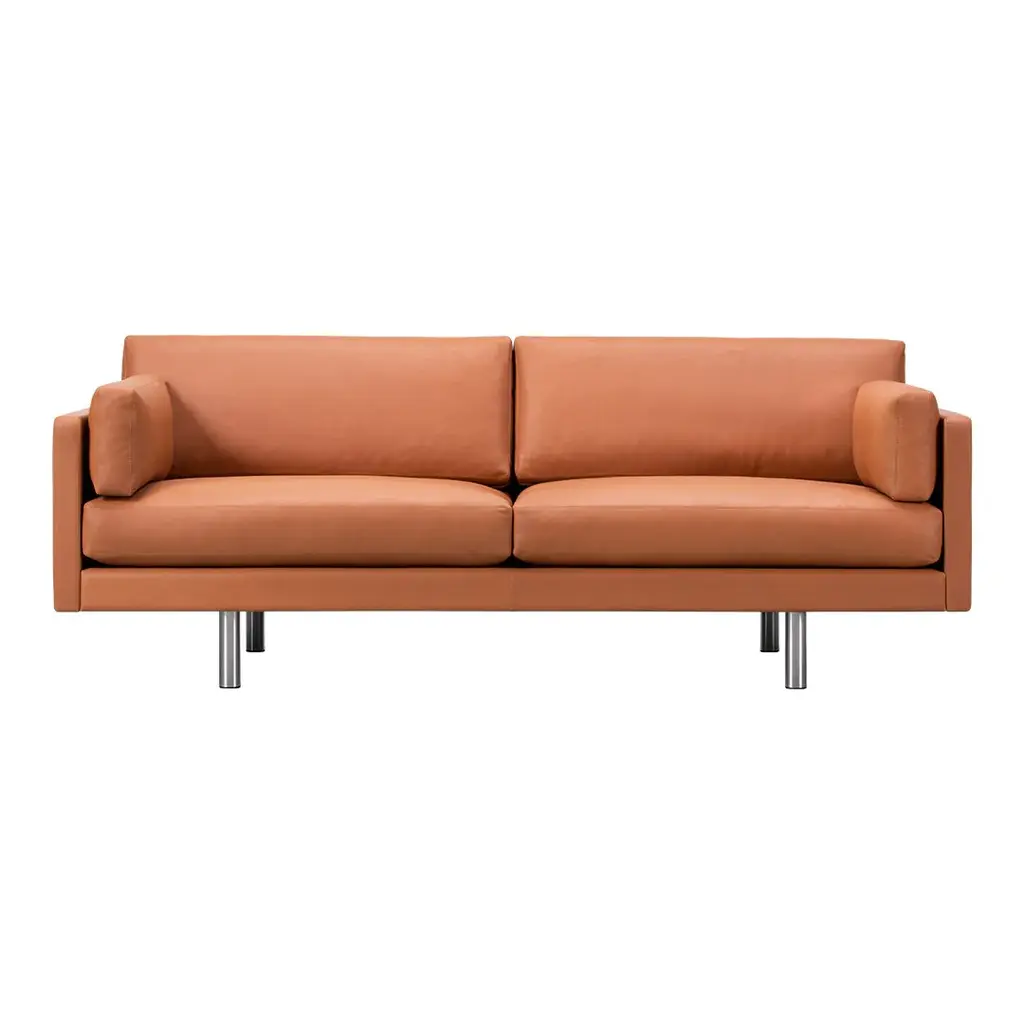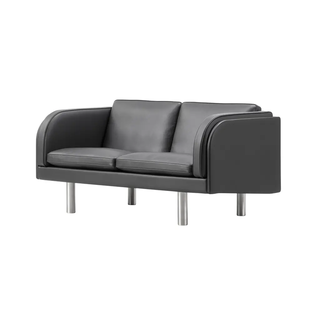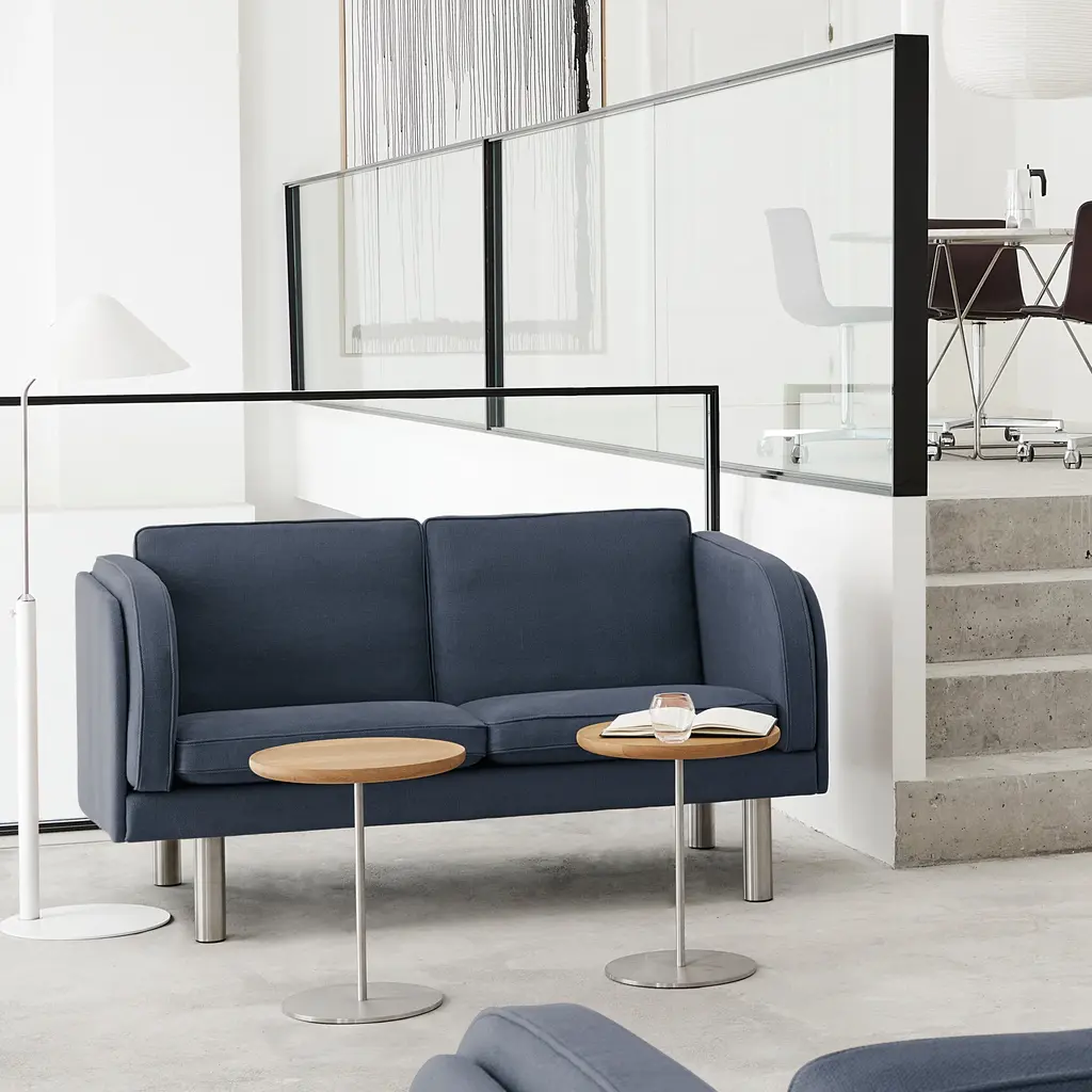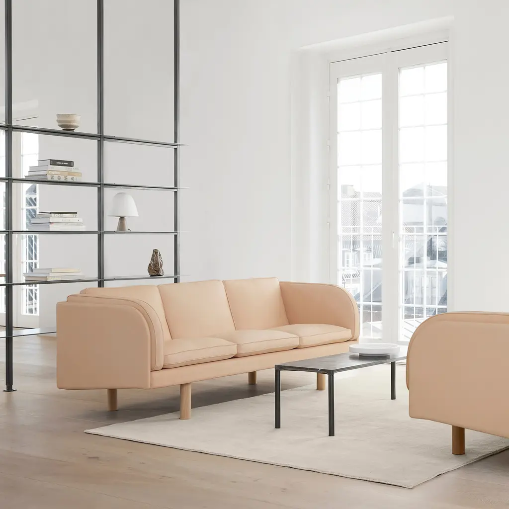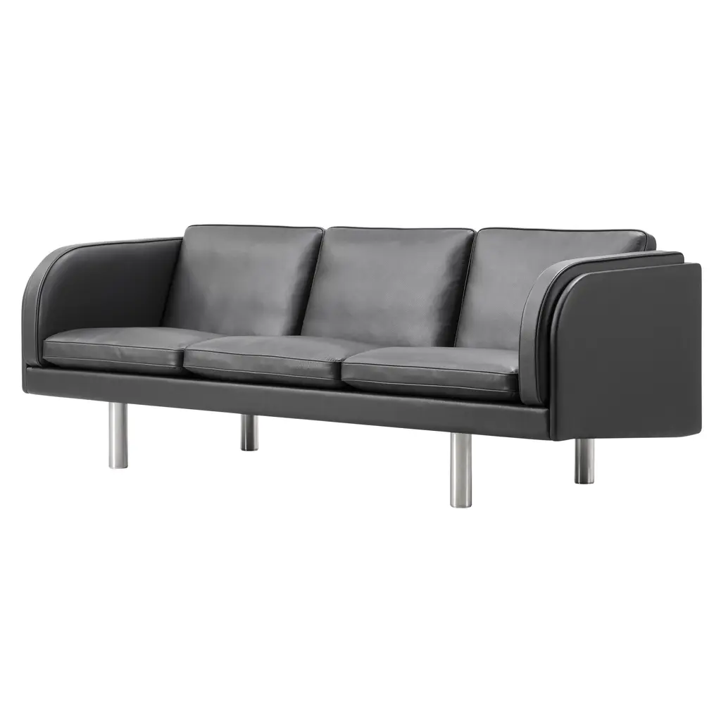 Defined by its curved armrests and compact silhouette, the JG Sofa 3-Seater offers a comfortable seating experience without occupying excessive space. The fully upholstered frame supports separate seat and back cushions, each featuring foam cores wrapped in down for enhanced softness. Built on a sturdy wooden inner frame, the sofa is supported by legs in solid wood or steel. Oak legs are detailed with a natural leather band, while the steel version includes a knurled accent.