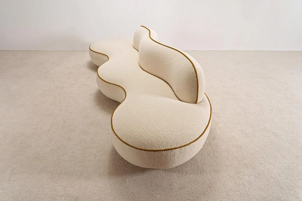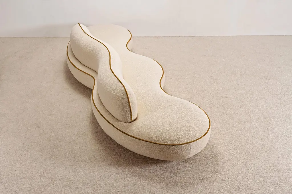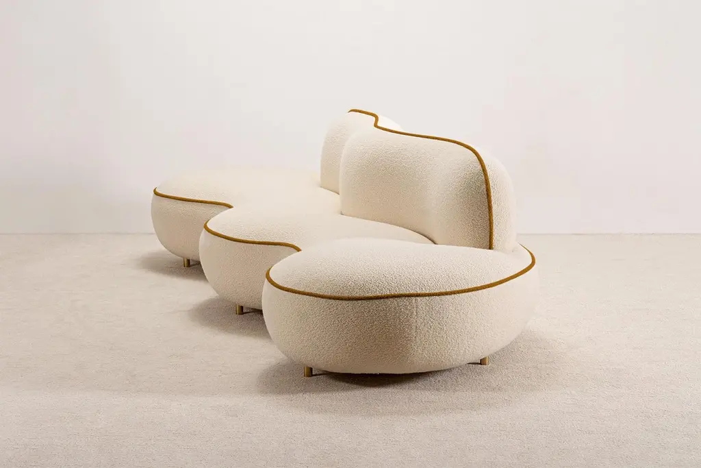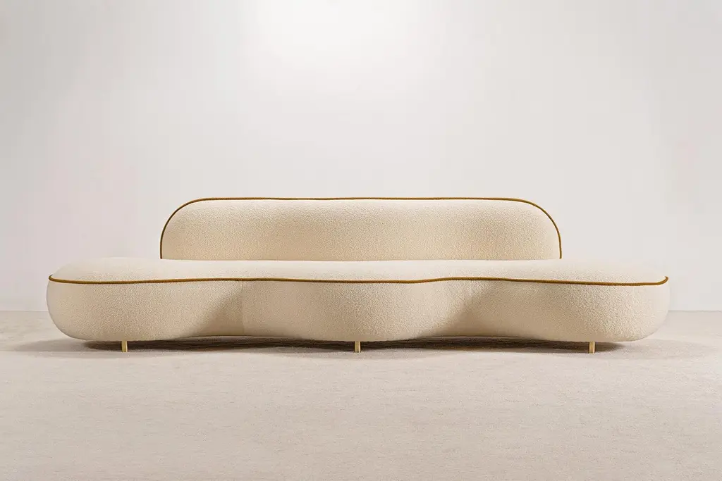 Jim Sofa XL Size By Proisy Studio.Numbered Edition.The Jim sofa stands as the centerpiece of Proisy Studio’s Modern Cowboy collection, a sculptural oversized curved sofa, 3 to 5-seater piece whose sweeping lines combine comfort, elegance, and craftsmanship. With its remarkable three meters (118 in) in length, Jim is conceived as a generous landscape of seating, designed to define rather than simply furnish a space.Its fluid silhouette, free of sharp angles, unfolds in a continuous curve that invites both conversation and repose. Jim’s sweeping line fosters a natural sense of dialogue and conviviality, a sofa designed not only for comfort, but for presence. Whether placed in a gallery-like setting or a private residence, its scale and rhythm transform the space, turning seating into a sculptural composition.Entirely handcrafted in France, Jim combines an upholstered solid beech wood frame with polished and varnished brass feet, subtly elevating its generous form. The bouclé wool fabric by the French house Nobilis enhances the tactile depth of the piece, echoing the studio’s devotion to materiality and texture.Jim is part of the Modern Cowboy collection, which revisits and pays tribute to the raw elegance of the American West, reinterpreted through a contemporary lens of refined French savoir-faire. Within this family of pieces, which includes the Jane lounge chairs, Jessie stools, and Bonnie daybed, Jim shares their aesthetic vocabulary, built on sculptural balance and material honesty, and stands as a synthesis of architecture, design, and comfort.Each Proisy Studio piece is conceived, drawn, and fully handmade in the brand’s workshops in France, by a dedicated team of artisans combining traditional upholstery and modern cabinetmaking techniques.All creations can be customized upon request, available in a wide selection of fabrics and finishes, as well as COM.The studio regularly collaborates with interior designers and collectors on bespoke adaptations, ensuring each project receives a tailored expression of Proisy Studio’s craftsmanship and architectural sensibility.MaterialsUpholstery on solid beech wood frame.Polished & varnished brass feet.Wool bouclé fabric from Maison Nobilis.DimensionsWidth: 118.11 in (300 cm)Height: 28.35 in (72 cm)Depth: 41.34 in (105 cm)Seat Height: 16.53 in (42 cm)Seat Depth: 22.83 in (58 cm)Weight: 154 lbs (70 kg)Further photos and videos available upon request.All our creations can be shipped worldwide via fully insured express air freight.
