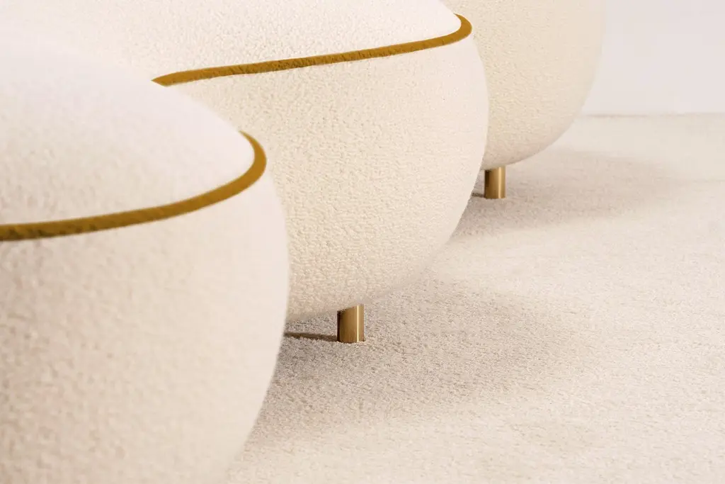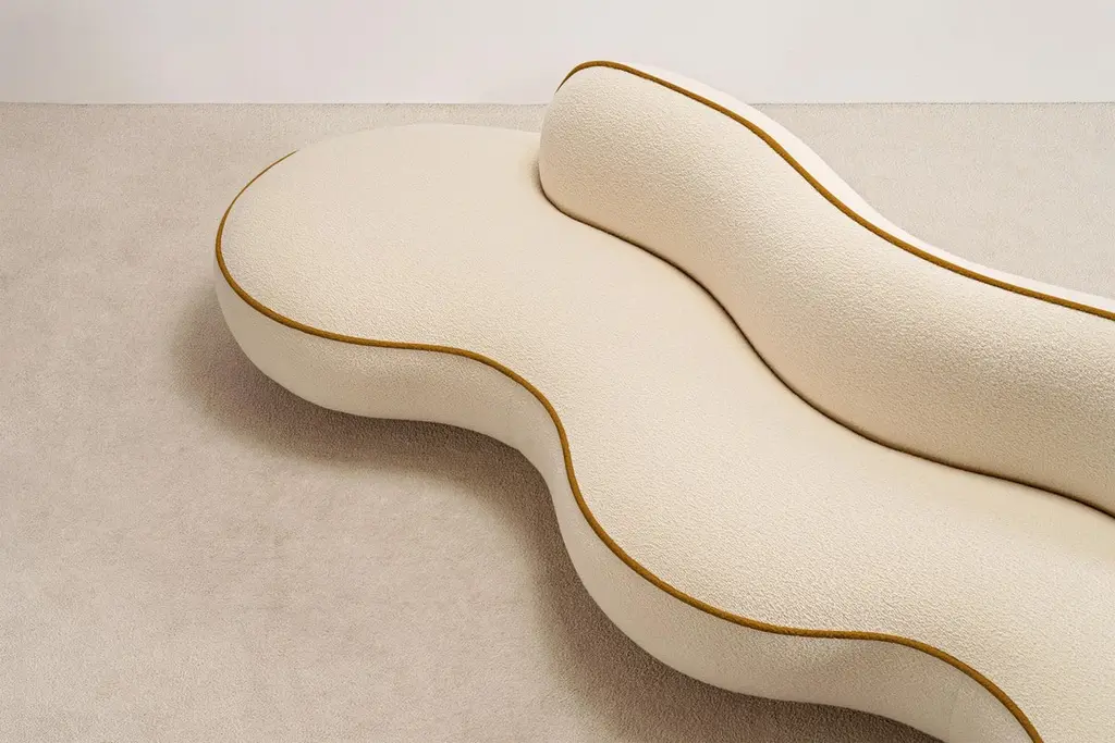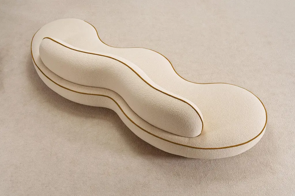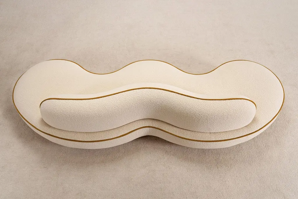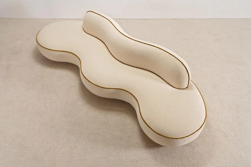 Jim Sofa XL Size By Proisy Studio.Numbered Edition.The Jim sofa stands as the centerpiece of Proisy Studio’s Modern Cowboy collection, a sculptural oversized curved sofa, 3 to 5-seater piece whose sweeping lines combine comfort, elegance, and craftsmanship. With its remarkable three meters (118 in) in length, Jim is conceived as a generous landscape of seating, designed to define rather than simply furnish a space.Its fluid silhouette, free of sharp angles, unfolds in a continuous curve that invites both conversation and repose. Jim’s sweeping line fosters a natural sense of dialogue and conviviality, a sofa designed not only for comfort, but for presence. Whether placed in a gallery-like setting or a private residence, its scale and rhythm transform the space, turning seating into a sculptural composition.Entirely handcrafted in France, Jim combines an upholstered solid beech wood frame with polished and varnished brass feet, subtly elevating its generous form. The bouclé wool fabric by the French house Nobilis enhances the tactile depth of the piece, echoing the studio’s devotion to materiality and texture.Jim is part of the Modern Cowboy collection, which revisits and pays tribute to the raw elegance of the American West, reinterpreted through a contemporary lens of refined French savoir-faire. Within this family of pieces, which includes the Jane lounge chairs, Jessie stools, and Bonnie daybed, Jim shares their aesthetic vocabulary, built on sculptural balance and material honesty, and stands as a synthesis of architecture, design, and comfort.Each Proisy Studio piece is conceived, drawn, and fully handmade in the brand’s workshops in France, by a dedicated team of artisans combining traditional upholstery and modern cabinetmaking techniques.All creations can be customized upon request, available in a wide selection of fabrics and finishes, as well as COM.The studio regularly collaborates with interior designers and collectors on bespoke adaptations, ensuring each project receives a tailored expression of Proisy Studio’s craftsmanship and architectural sensibility.MaterialsUpholstery on solid beech wood frame.Polished & varnished brass feet.Wool bouclé fabric from Maison Nobilis.DimensionsWidth: 118.11 in (300 cm)Height: 28.35 in (72 cm)Depth: 41.34 in (105 cm)Seat Height: 16.53 in (42 cm)Seat Depth: 22.83 in (58 cm)Weight: 154 lbs (70 kg)Further photos and videos available upon request.All our creations can be shipped worldwide via fully insured express air freight.