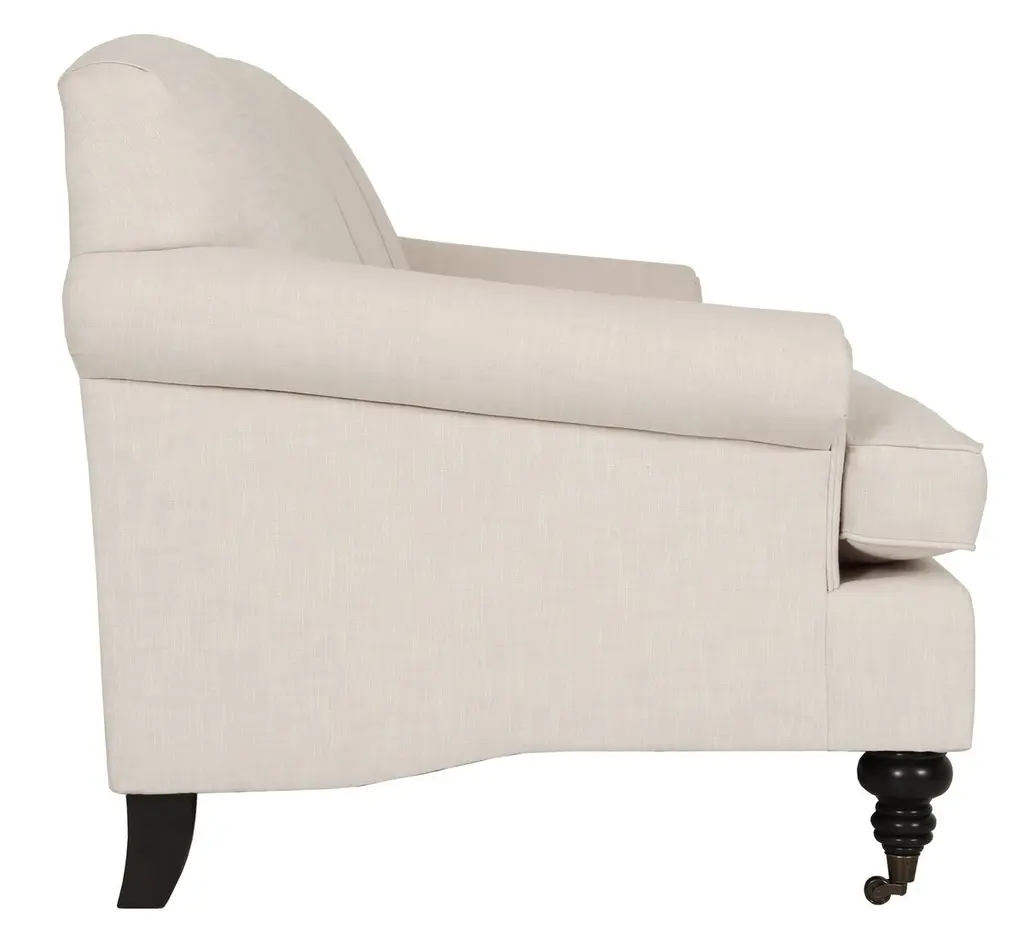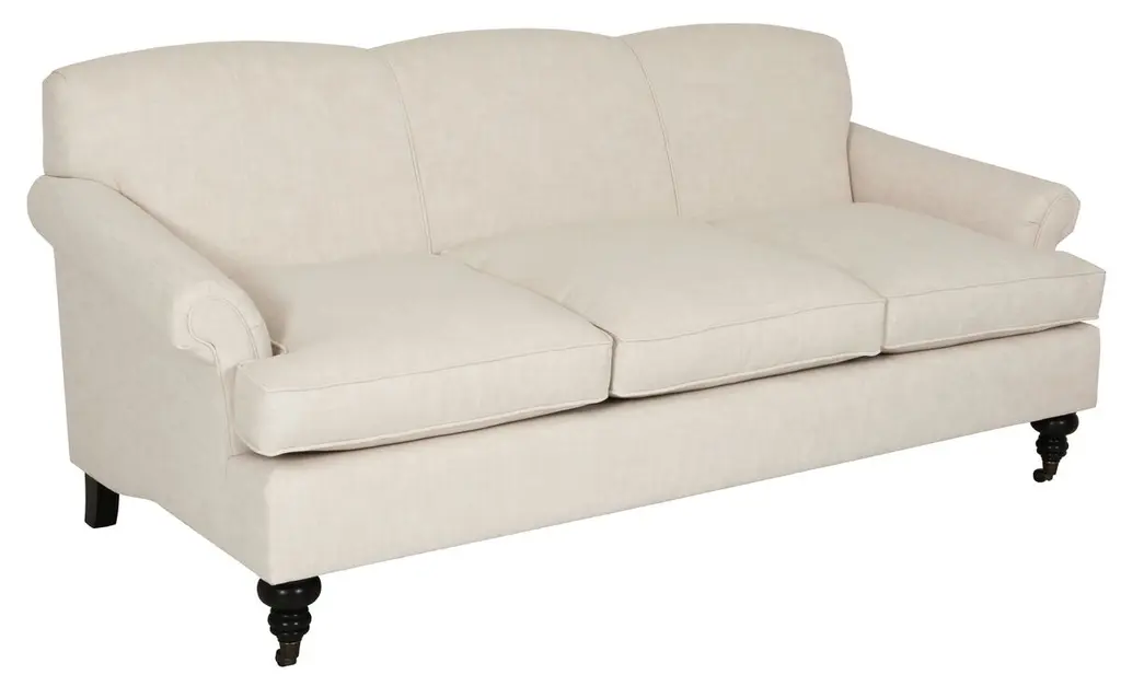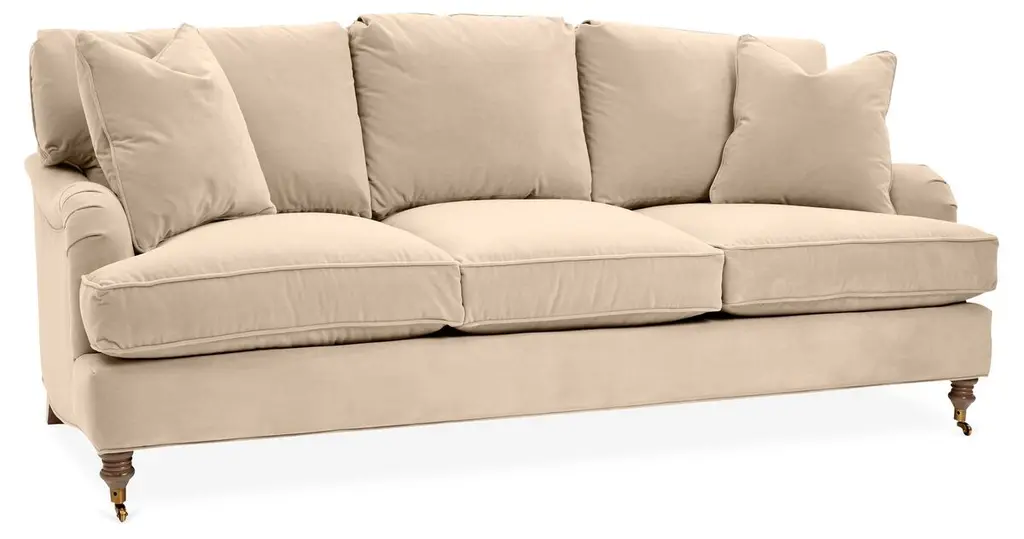 Available online exclusively at One Kings Lane: Grand styling and comfort come together in this roll-arm sofa. The piece is sumptuously upholstered in lapis-blue velvet with casters on the turned front legs to allow for easy mobility while protecting your floors. The seat fill of high-resiliency foam surrounded by feathers and down ensures long-lasting comfort. Handcrafted in Southern California.
