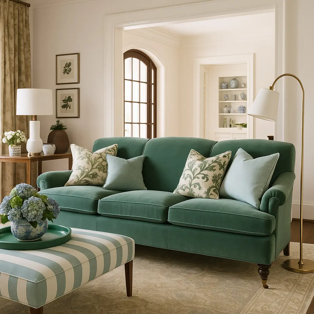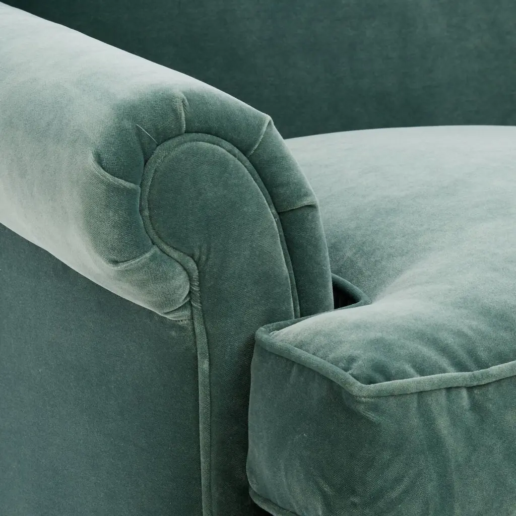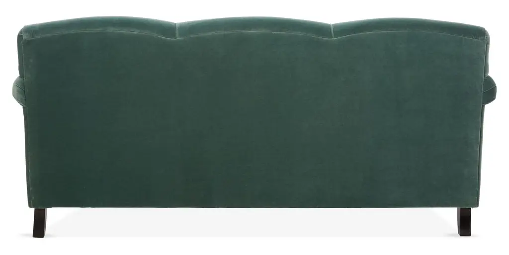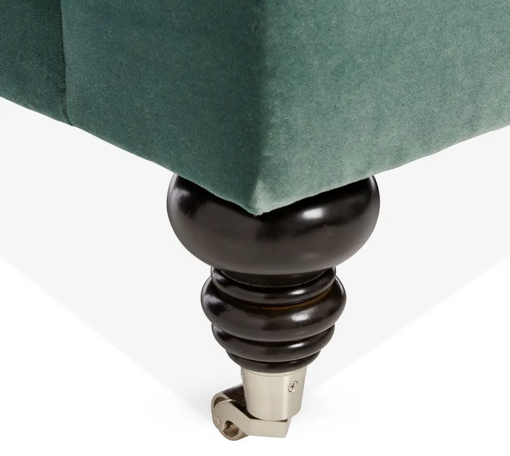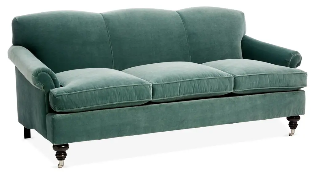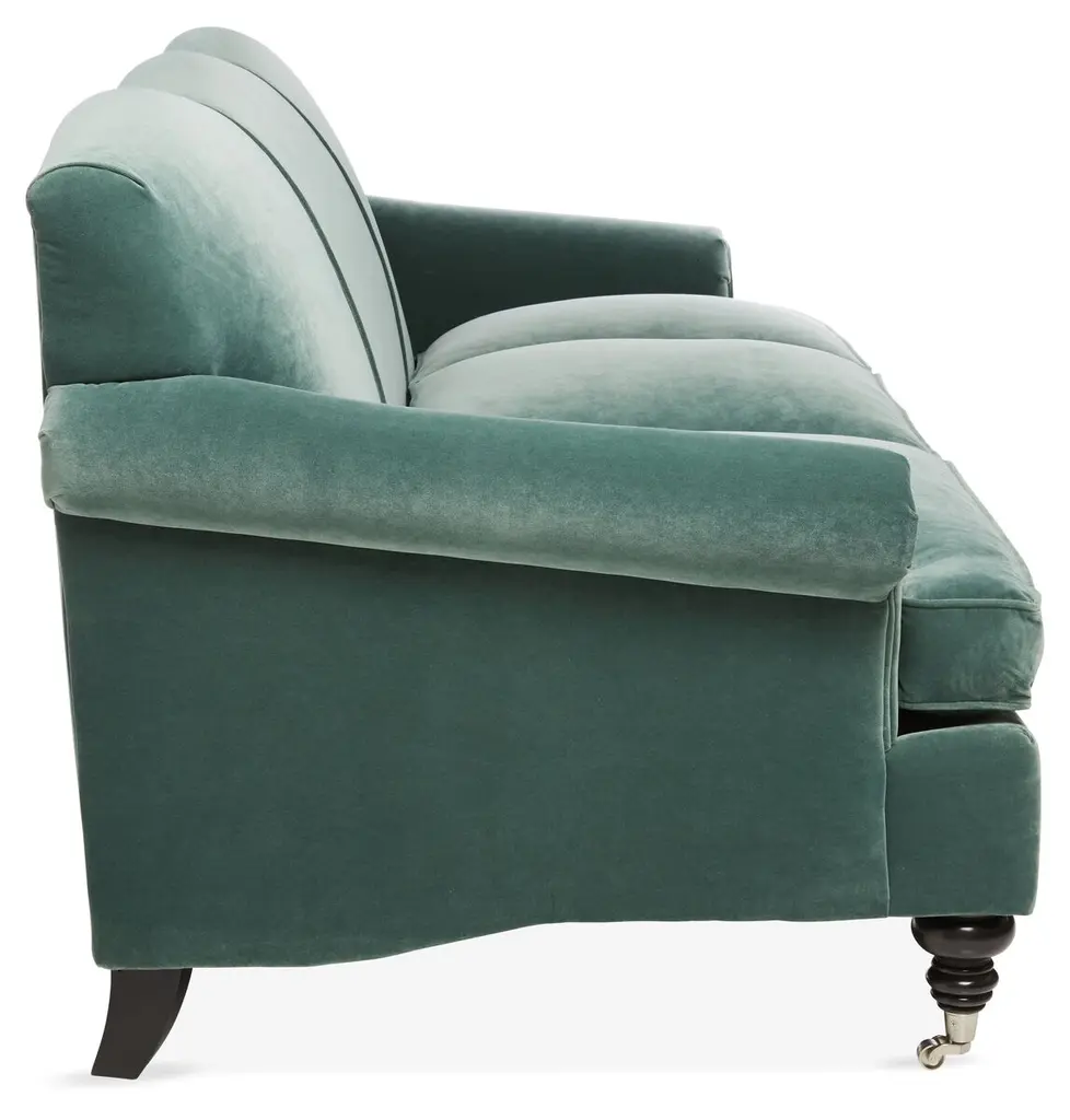 Available online exclusively at One Kings Lane: Grand styling and comfort come together in this roll-arm sofa. The piece is sumptuously upholstered in lapis-blue velvet with casters on the turned front legs to allow for easy mobility while protecting your floors. The seat fill of high-resiliency foam surrounded by feathers and down ensures long-lasting comfort. Handcrafted in Southern California.