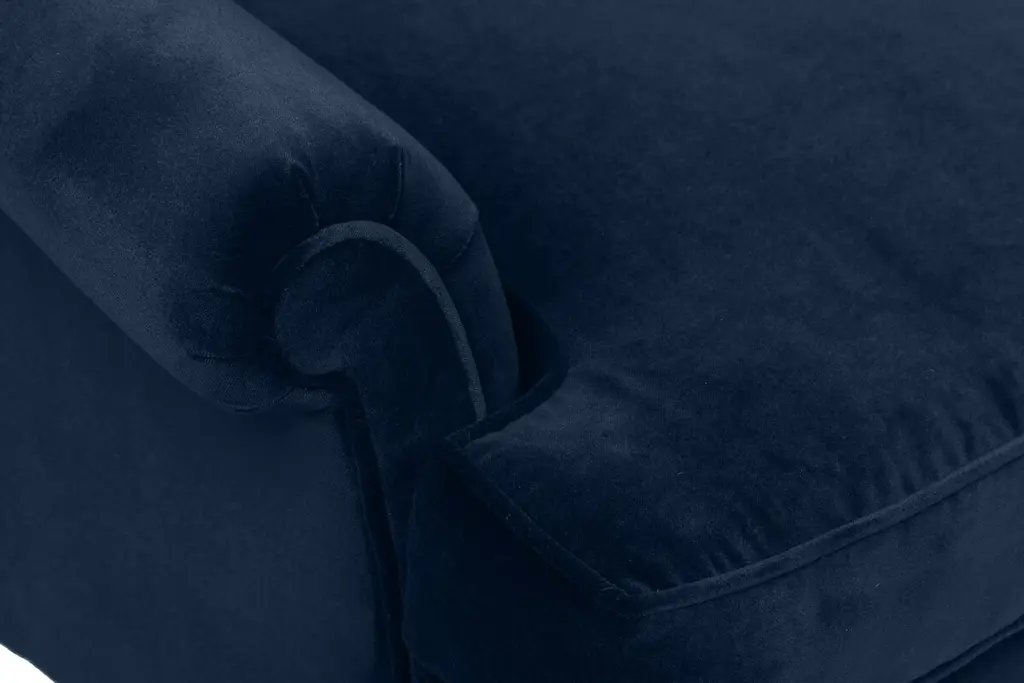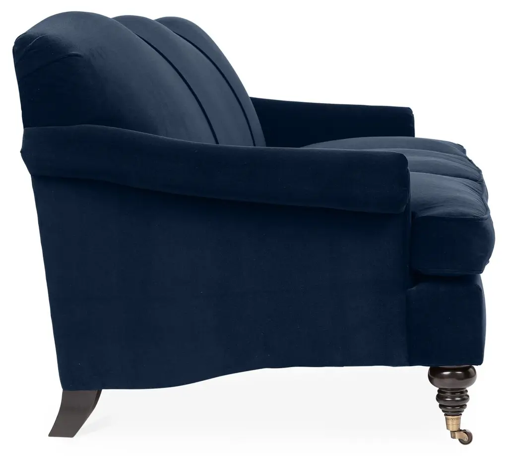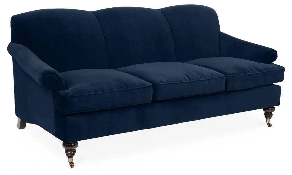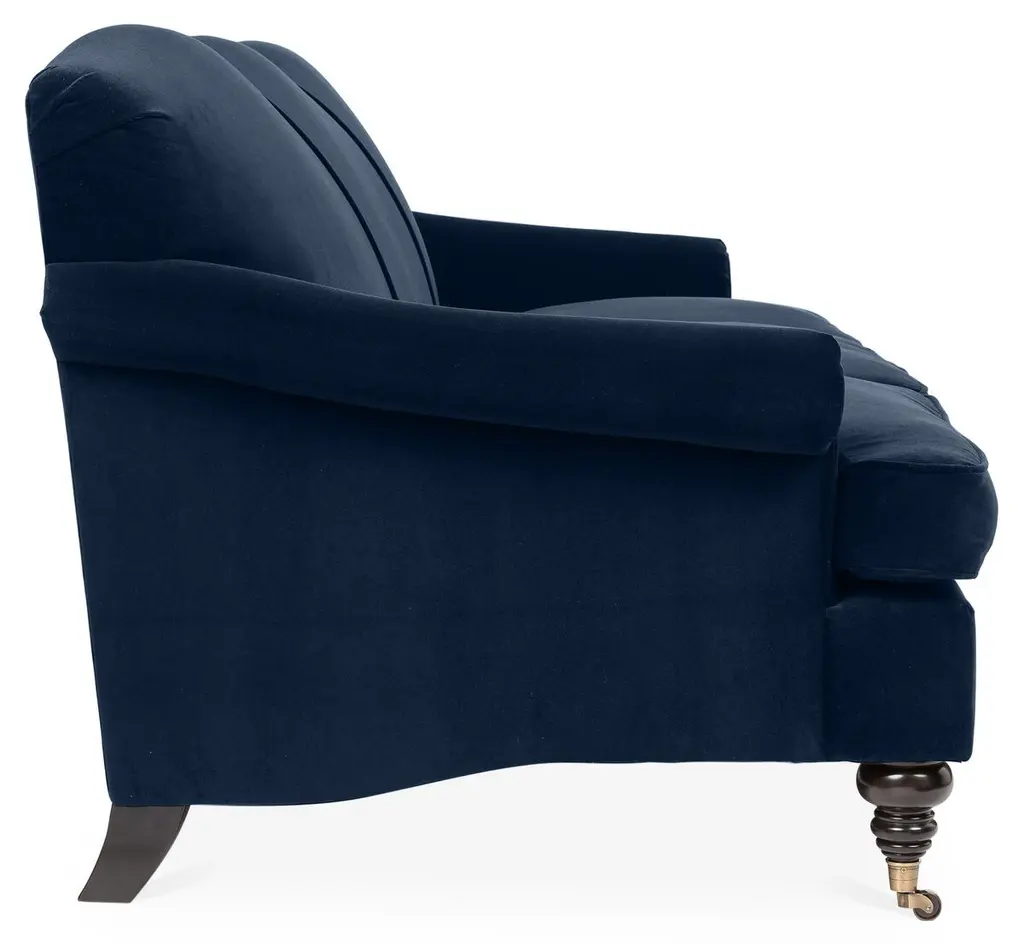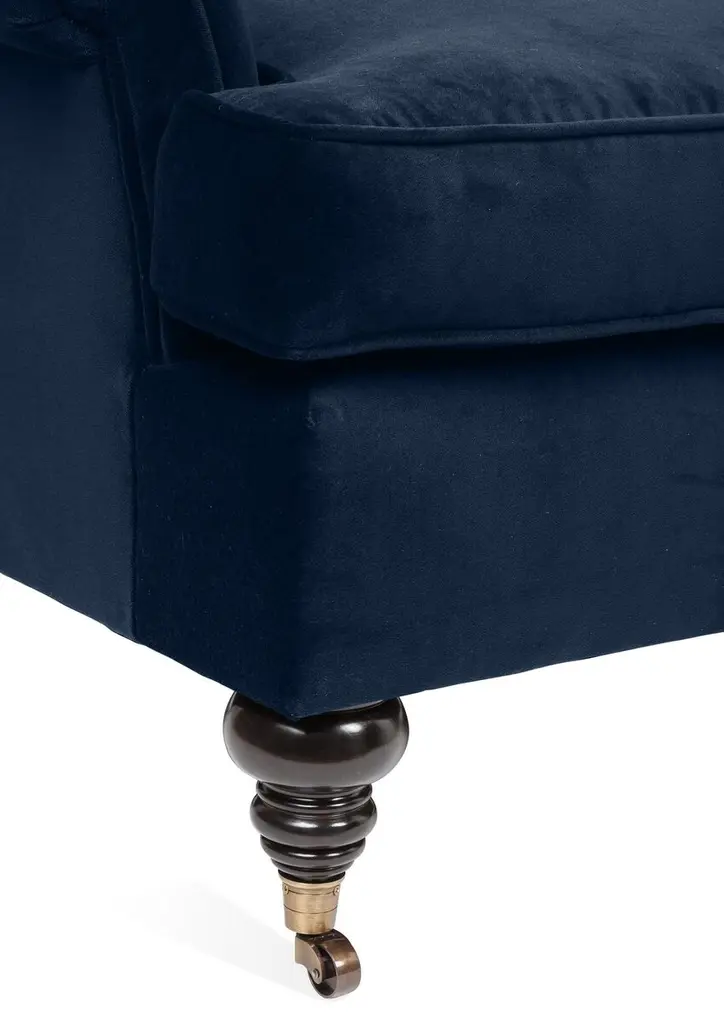 Available online exclusively at One Kings Lane: Grand styling and comfort come together in this roll-arm sofa. The piece is sumptuously upholstered in lapis-blue velvet with casters on the turned front legs to allow for easy mobility while protecting your floors. The seat fill of high-resiliency foam surrounded by feathers and down ensures long-lasting comfort. Handcrafted in Southern California.
