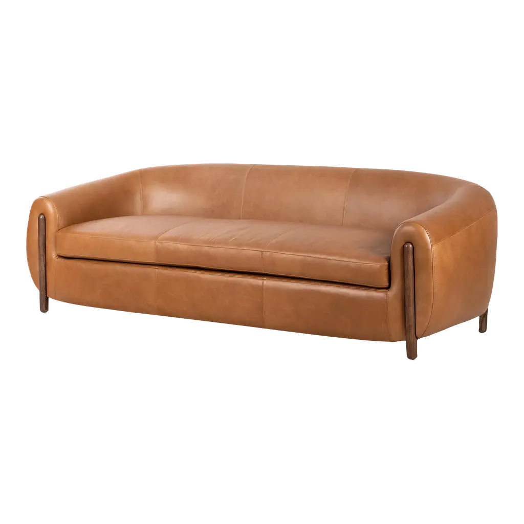 Elegant and modern, this three-seat sofa will be a precious addition to a contemporary interior, where the comfort of the seat and welcoming silhouette of the enveloping armrests and back will be an invitation to relax. Part of the Katana Collection, named after the traditional Japanese sword evoked in the gentle curve of the legs, this sofa is upholstered with leather by Penelope Oggi, the Tivano, a semi-aniline leather with a hand-buffed finishing and a stone-washed effect produced with European cattle.