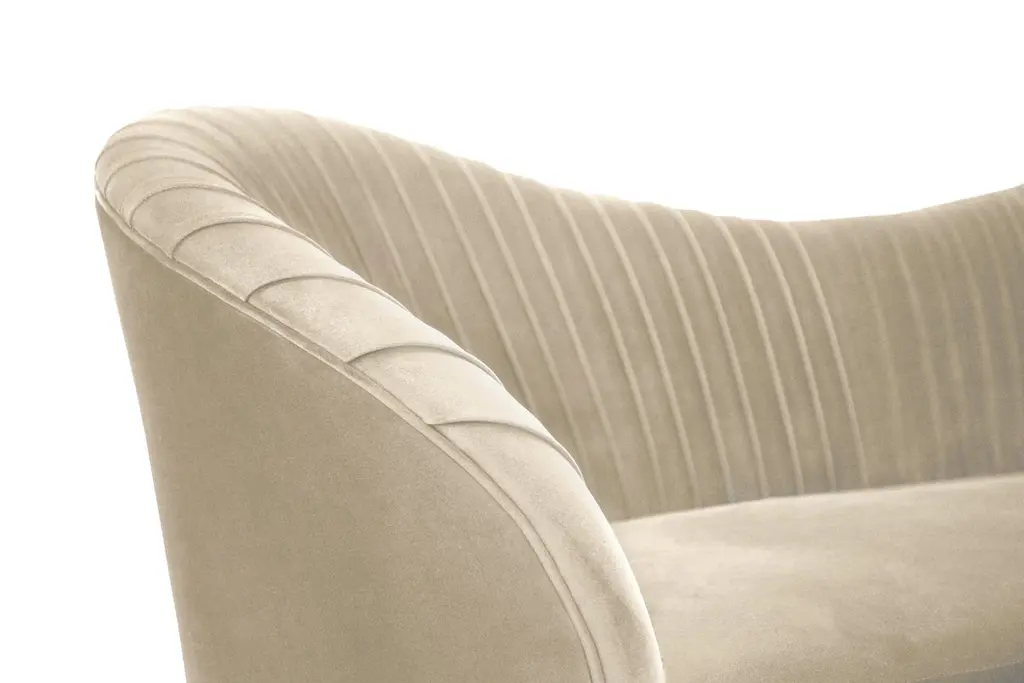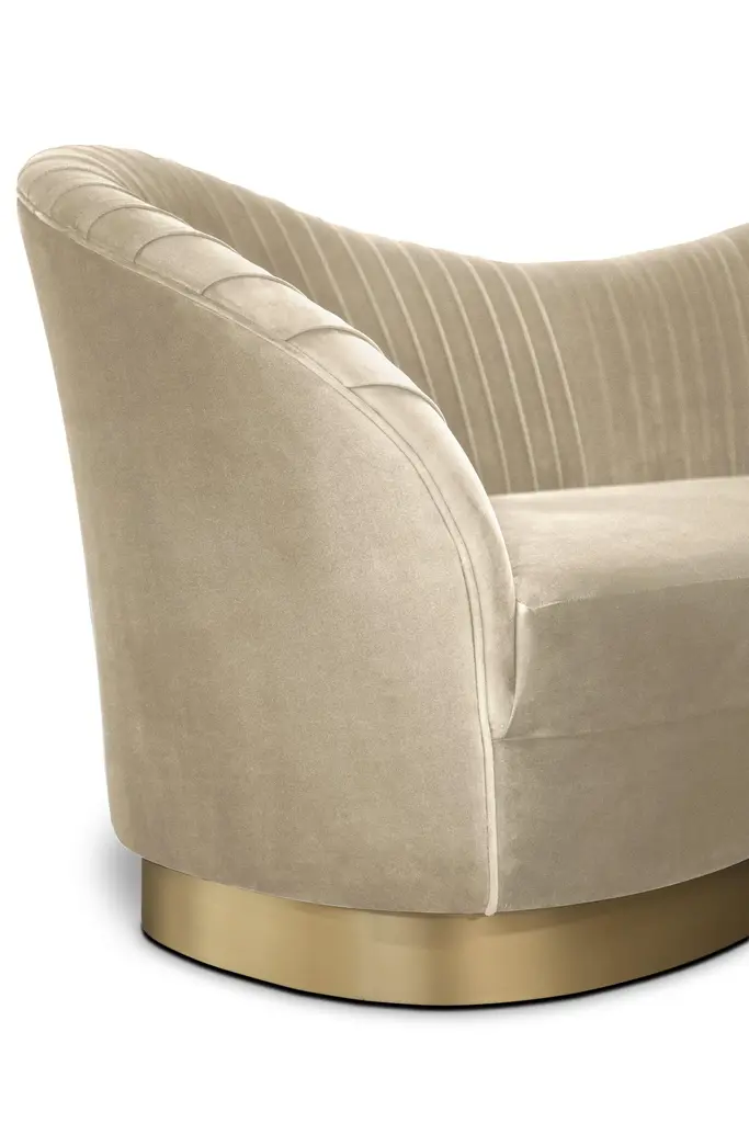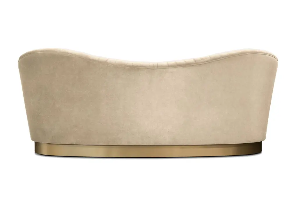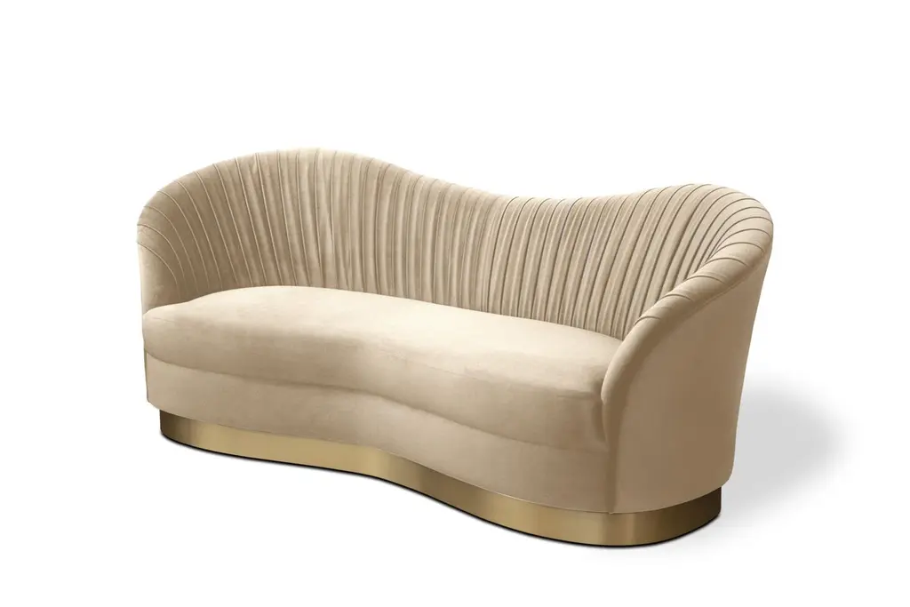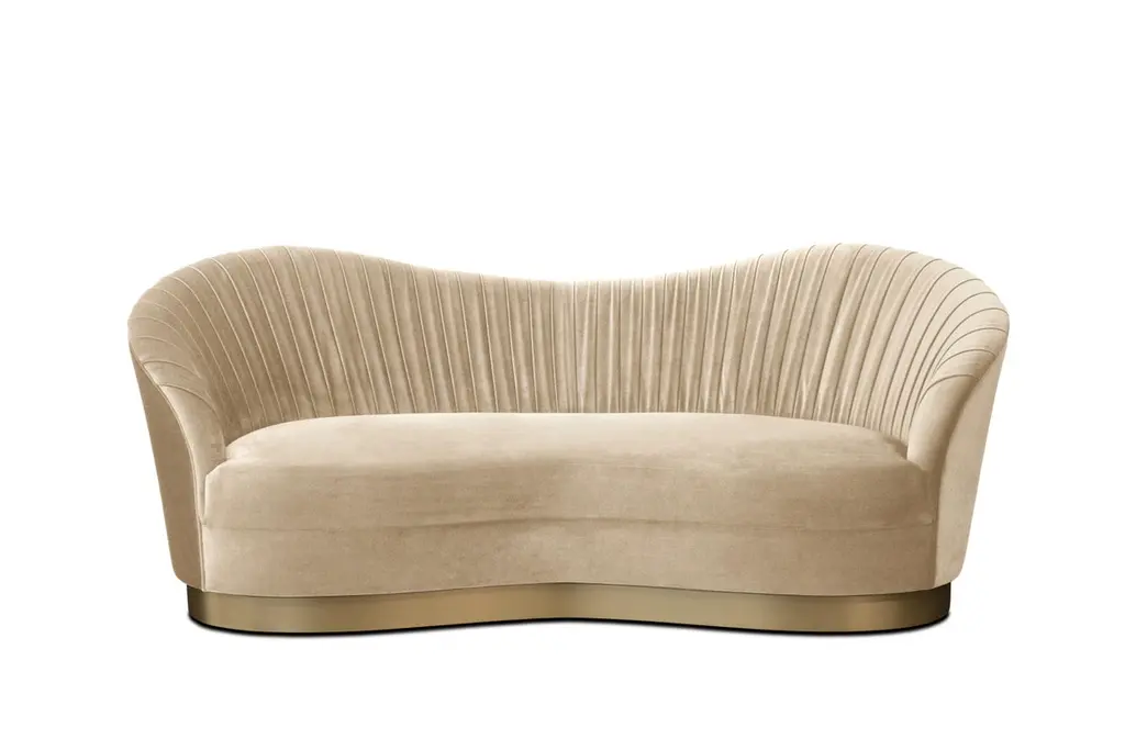 The lux and bodacious Kelly sofa is the cool girl sipping Cosmos in the dark corner of a chic NYC lounge. Her fluid curves are harmoniously matched by sumptuous pleated waves of soft upholstery fabric. Her tell is a striking metal band hugging the base of her curvaceous body, leaving you constantly searching for a golden glimpse of her copious beauty.Materials & Finishes: Upholstery: Lux Velvet Beige 0071 from the KOKET Textiles collectionBase: Polished Brass (High Gloss Finish)Clean & Care:Care for textiles by vacuuming or lightly brushing. Maintain textiles by keeping them away from direct sunlight. Rotate and flip cushions when vacuuming for even wear. The nap of high pile textiles such as velvets may become crushed or lose its original pile height. We recommend light steaming to lift the pile to its original height. The textile should also be brushed with a de-linting brush to maintain its pile. Water based or solvent cleaner may cause discoloration or staining. We recommend that stained or soiled textiles be professionally cleaned. Never use cleaners with alcohols or solvents on metals. Only use cotton or extra soft cloths. We recommend that tarnished metals be professionally cleaned. Clean polished metal or polished stainless with a damp cloth. Do not use commercial or heavy-duty polishes or waxes, as they may scratch or damage the finish. Polishes we do recommend are Brasso, Simichrome, or our favorite Flitz; these can be used without inflicting damage even for the unskilled user, unless the polished surface has a wax sealer coat. These polishes will remove the wax while polishing the metal, but the surface would then have to be re-waxed if it is on a metal that needs to be sealed.