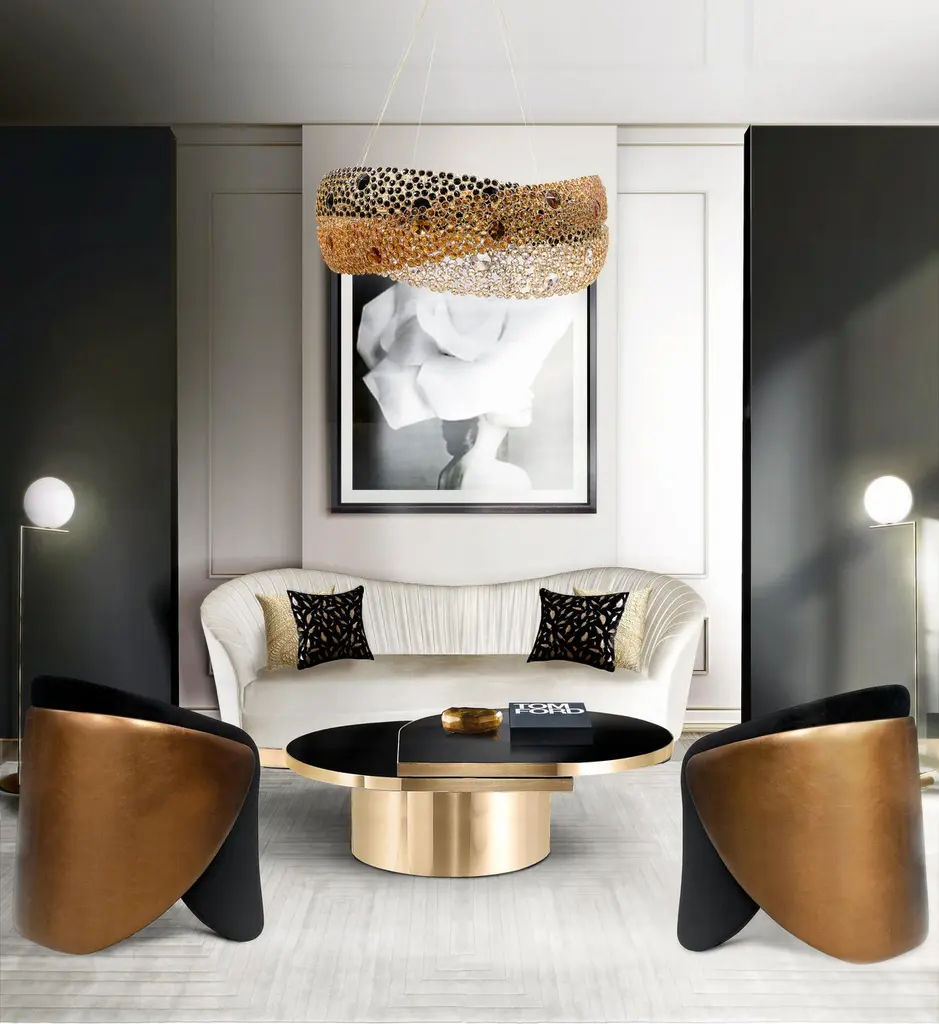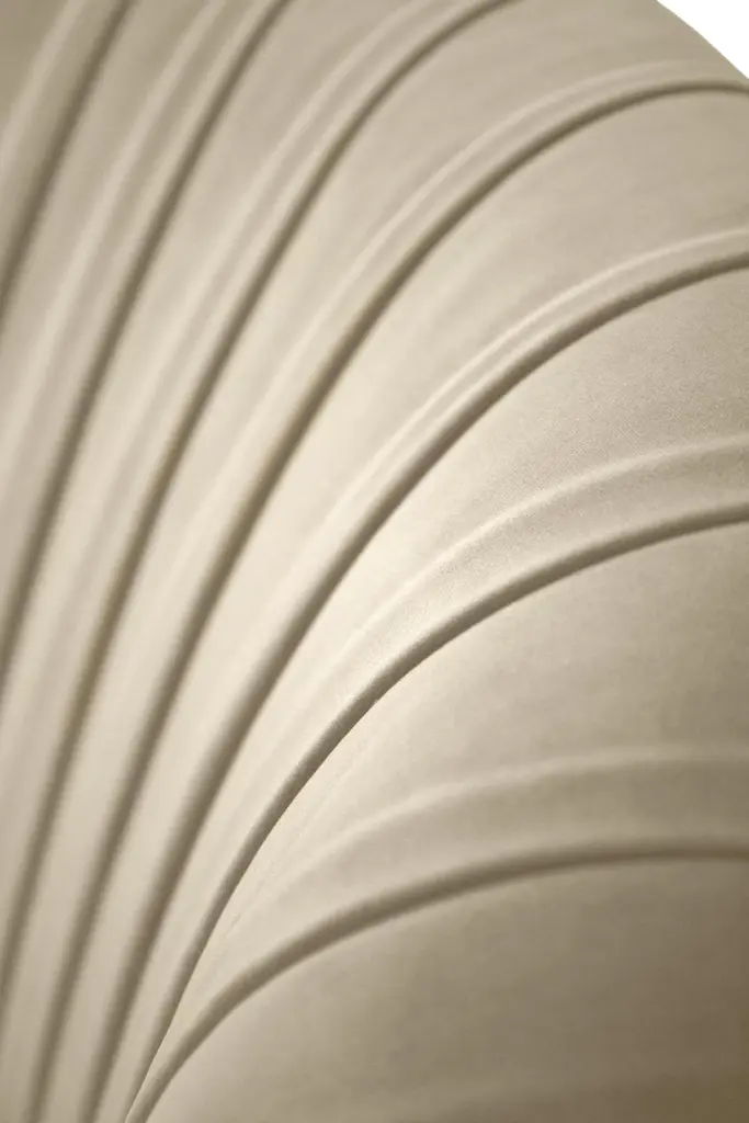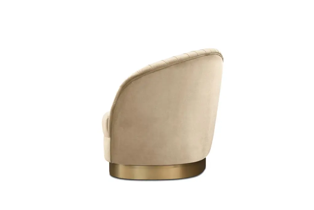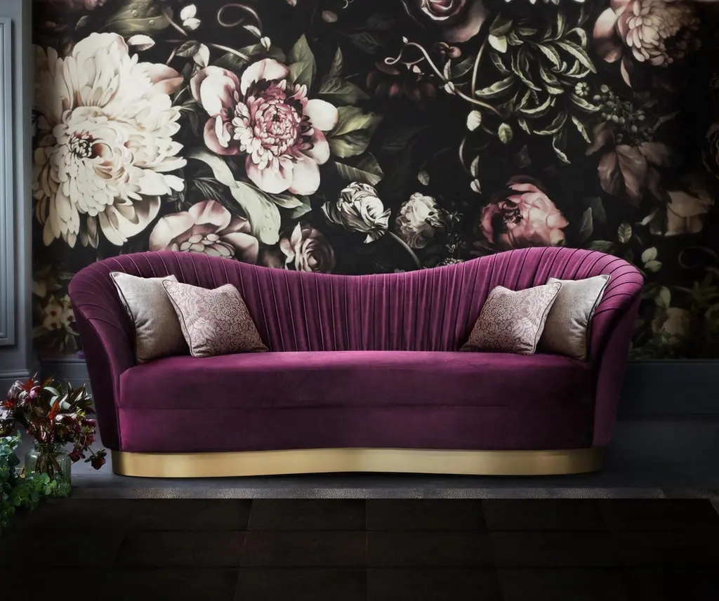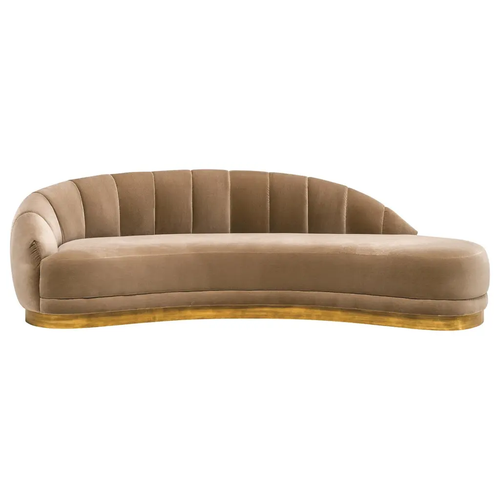 The lux and bodacious Kelly sofa is the cool girl sipping Cosmos in the dark corner of a chic NYC lounge. Her fluid curves are harmoniously matched by sumptuous pleated waves of soft upholstery fabric. Her tell is a striking metal band hugging the base of her curvaceous body, leaving you constantly searching for a golden glimpse of her copious beauty.Materials & Finishes: Upholstery: Lux Velvet Beige 0071 from the KOKET Textiles collectionBase: Polished Brass (High Gloss Finish)Clean & Care:Care for textiles by vacuuming or lightly brushing. Maintain textiles by keeping them away from direct sunlight. Rotate and flip cushions when vacuuming for even wear. The nap of high pile textiles such as velvets may become crushed or lose its original pile height. We recommend light steaming to lift the pile to its original height. The textile should also be brushed with a de-linting brush to maintain its pile. Water based or solvent cleaner may cause discoloration or staining. We recommend that stained or soiled textiles be professionally cleaned. Never use cleaners with alcohols or solvents on metals. Only use cotton or extra soft cloths. We recommend that tarnished metals be professionally cleaned. Clean polished metal or polished stainless with a damp cloth. Do not use commercial or heavy-duty polishes or waxes, as they may scratch or damage the finish. Polishes we do recommend are Brasso, Simichrome, or our favorite Flitz; these can be used without inflicting damage even for the unskilled user, unless the polished surface has a wax sealer coat. These polishes will remove the wax while polishing the metal, but the surface would then have to be re-waxed if it is on a metal that needs to be sealed.