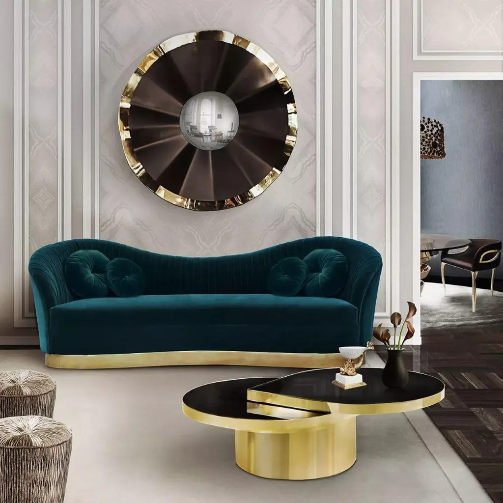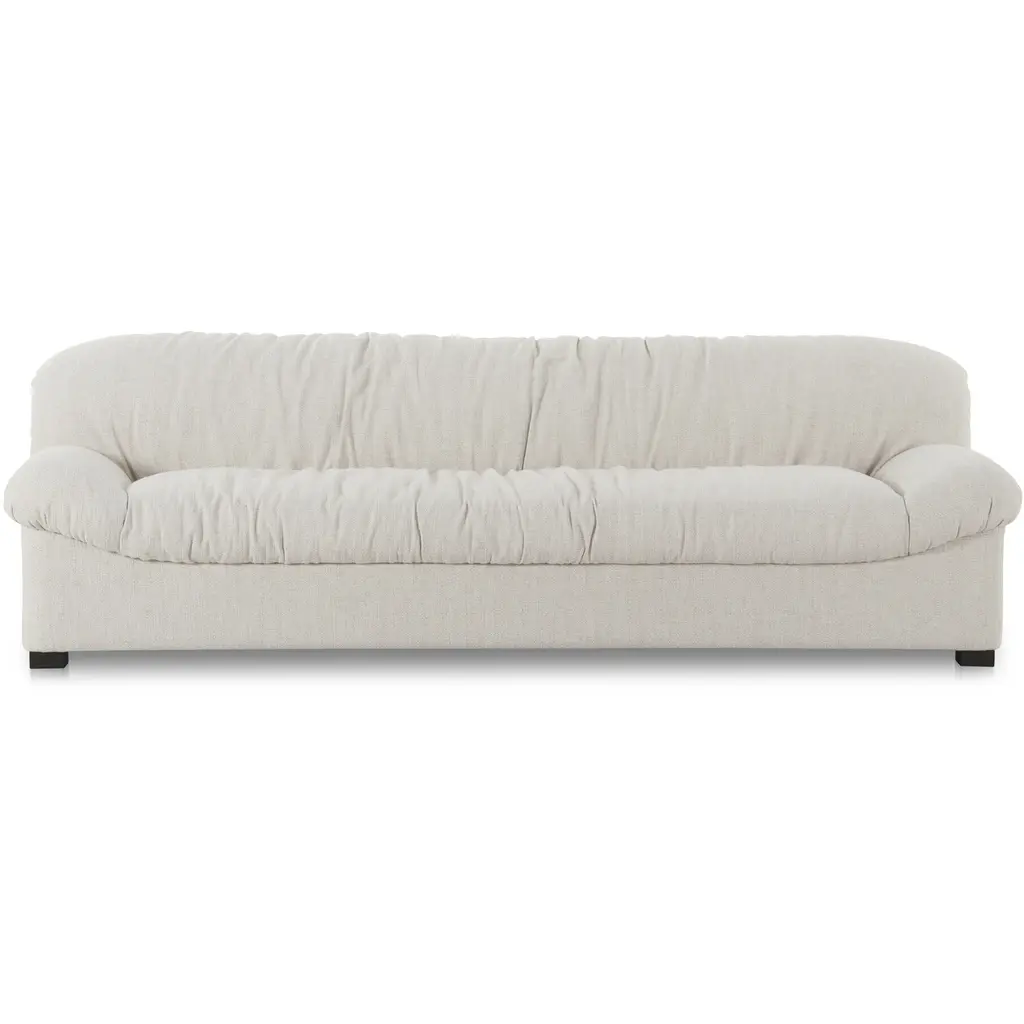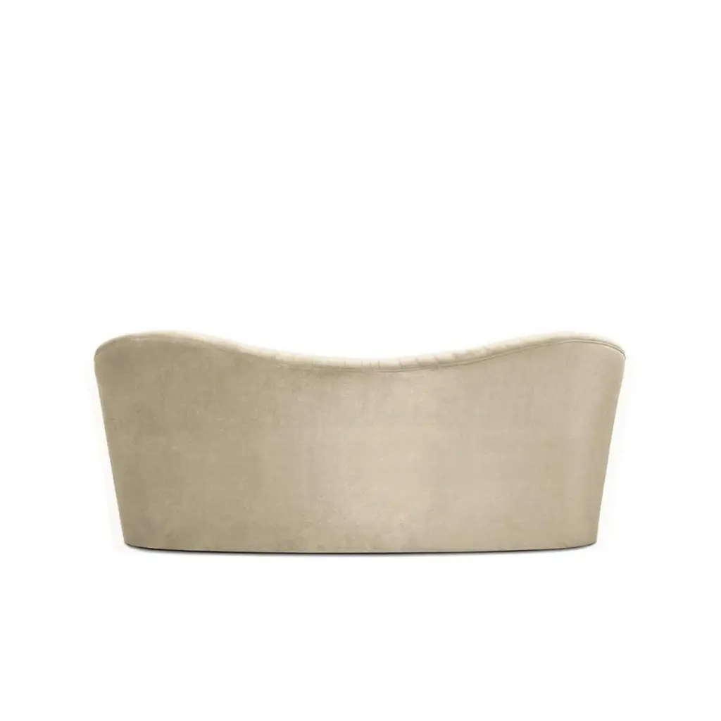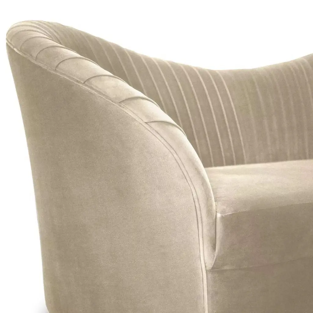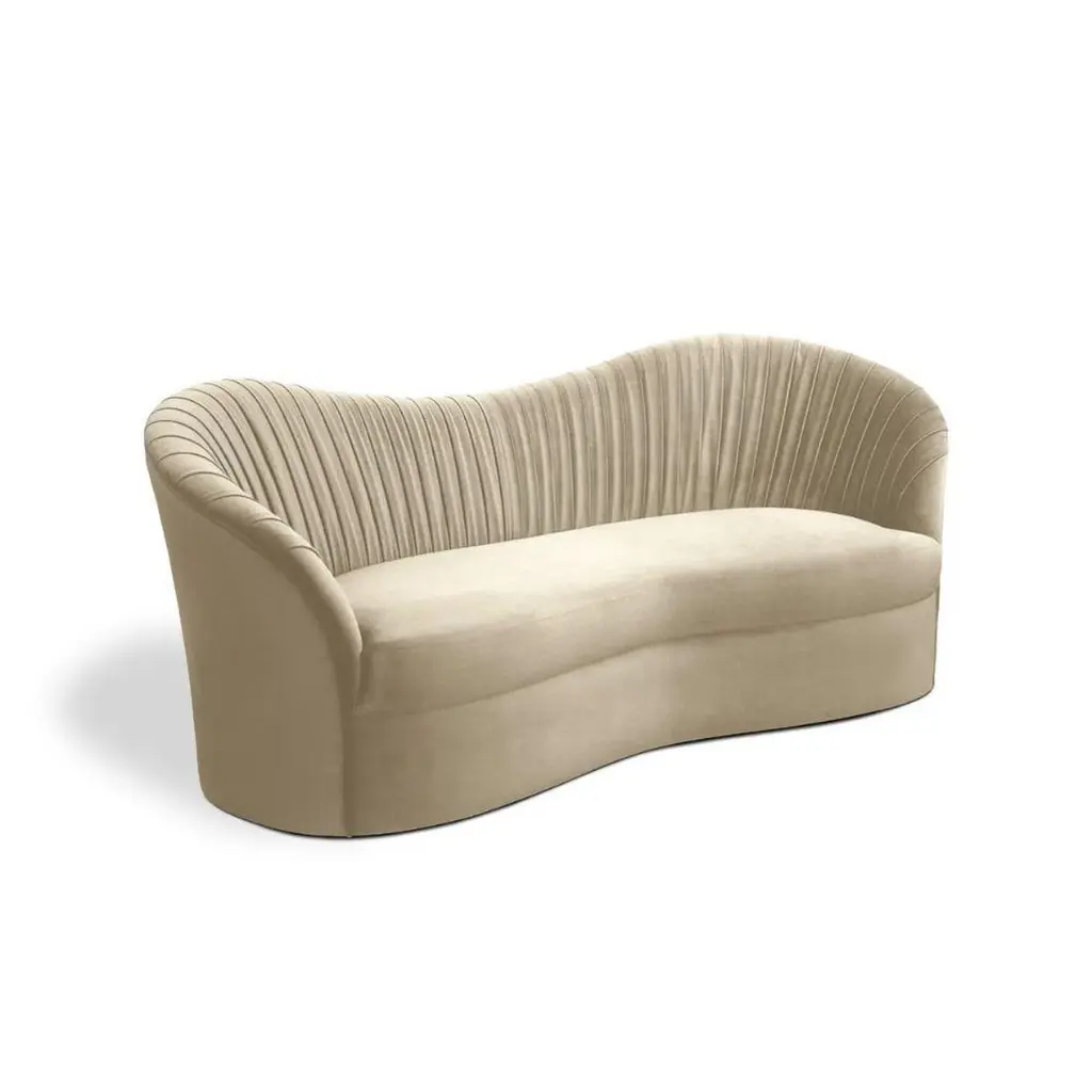 The lux and bodacious Kelly sofa is the cool girl sipping Cosmos in the dark corner of a chic NYC lounge. Her fluid curves are harmoniously matched by sumptuous pleated waves of soft upholstery fabric.Materials & Finishes:Upholstery: Lux Velvet Beige 0071 from the KOKETClean & Care:Care for textiles by vacuuming or lightly brushing. Maintain textiles by keeping them away from direct sunlight. Rotate and flip cushions when vacuuming for even wear. The nap of high pile textiles such as velvets may become crushed or lose its original pile height. We recommend light steaming to lift the pile to its original height. The textile should also be brushed with a de-linting brush to maintain its pile. Water based or solvent cleaner may cause discoloration or staining. We recommend that stained or soiled textiles be professionally cleaned.