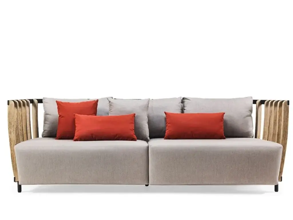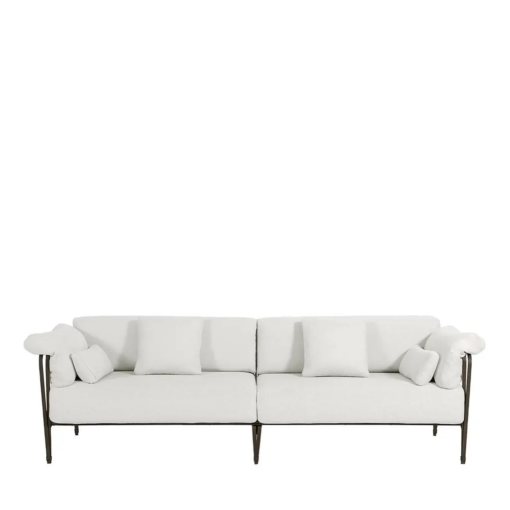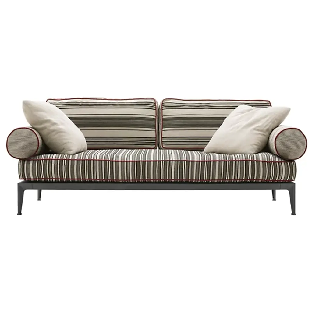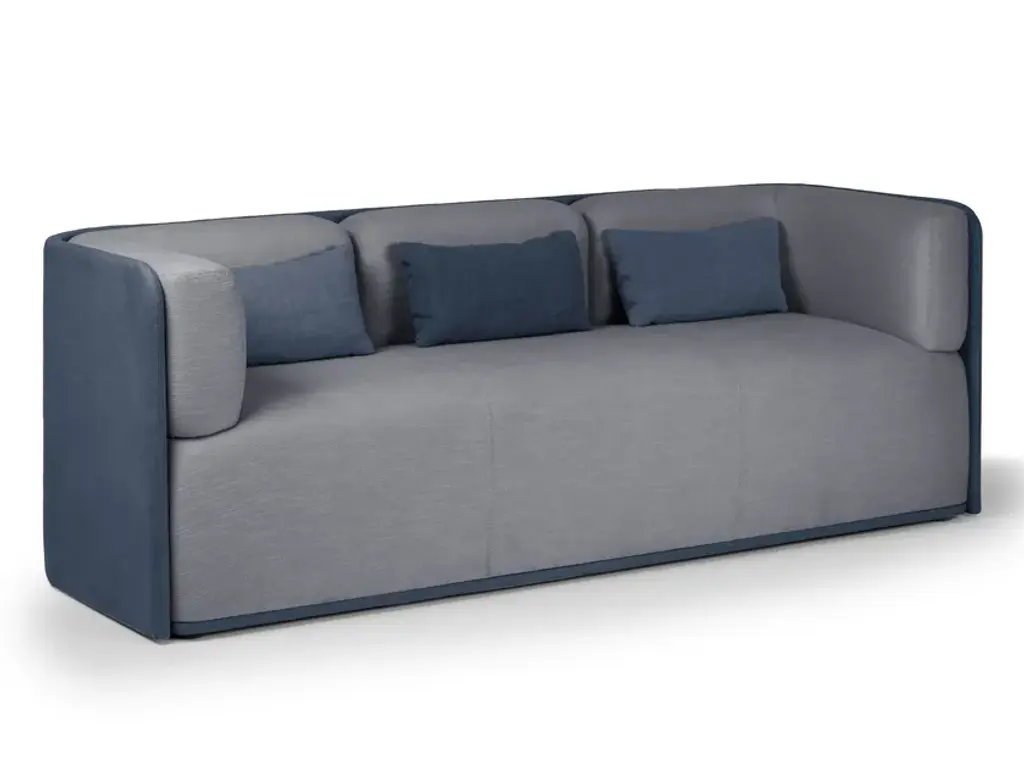 A clean and minimalist design of stunning geometric value, this gorgeous sofa embodies Angeletti Ruzza's essential lines. Resting on a gray-lacquered metal base with a captivating shape, it features two large seats with padded armrests and back cushions. The wood shell is softly padded with polyurethane foam and polyester fiber. Fabric of cat m. Cushions are filled with goose-feathers for a relaxing feel. Entirely upholstered in a blue fabric.