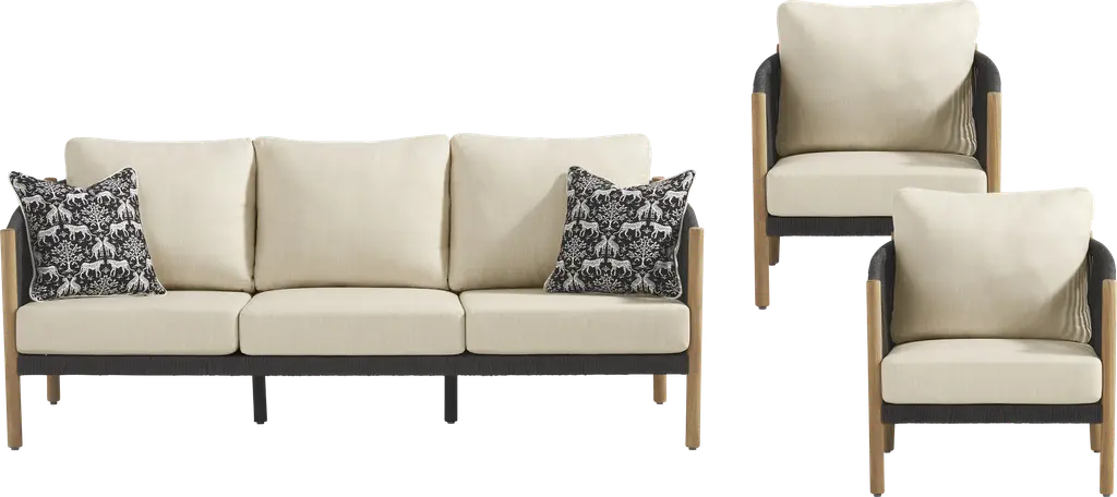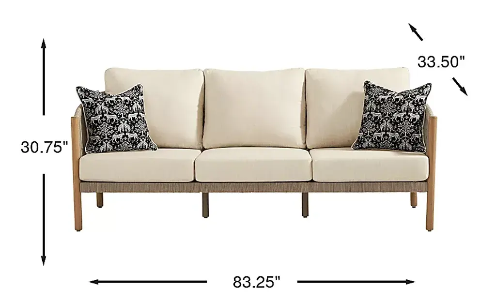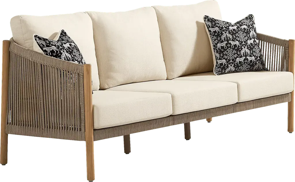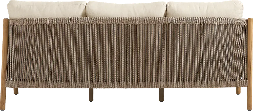 A wave of pure ease carries you into effortless bliss as the Koda collection nestles every moment in the indulgent luxury of a sailboat gliding through seas made of glass. All-weather rope in colorfast beige coils around a frame of rust resistant aluminum, running parallel to solid teak legs in a natural finish. Outdoor cushions in beige offer the perfect touch of durable softness.