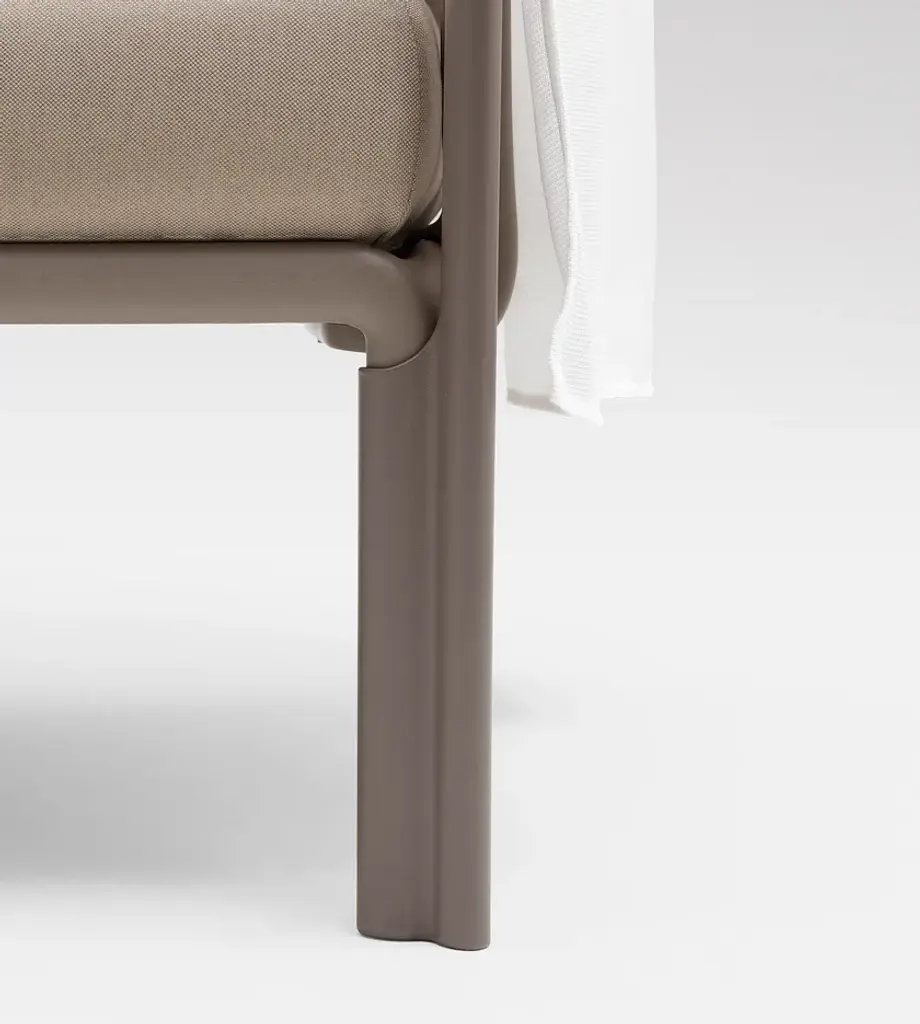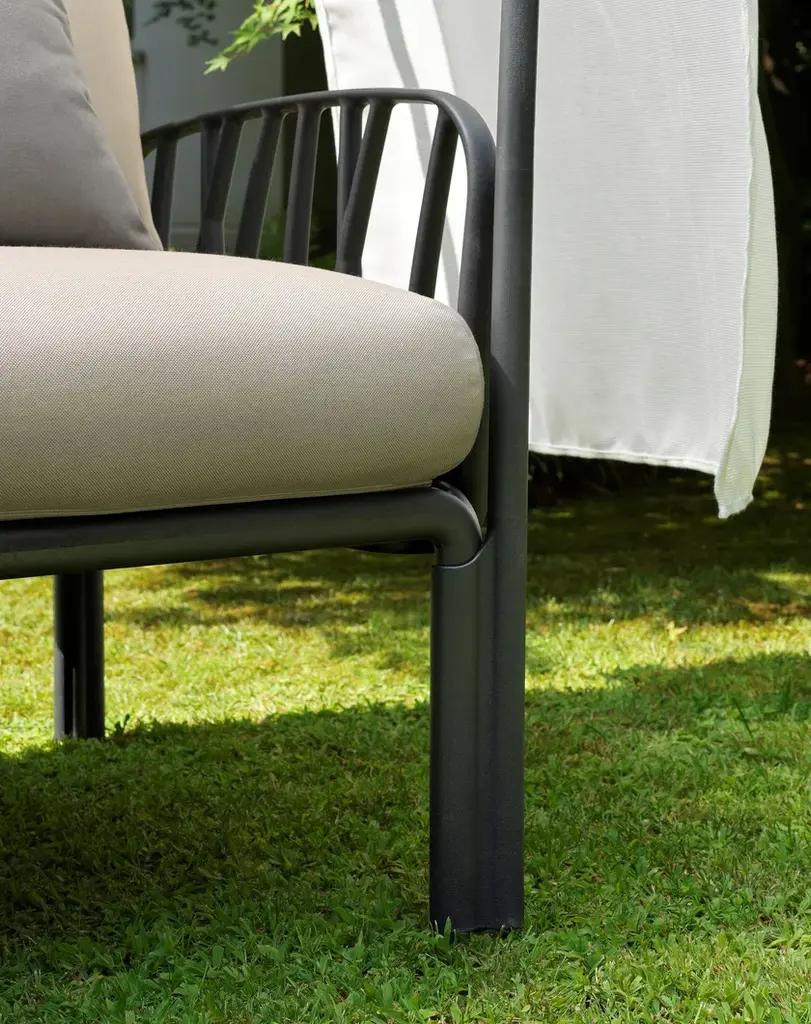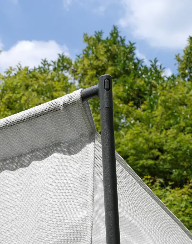 The new functional Komodo Ombra shade cover system, features a striking thread-like structure in fiberglass resin and fabric, with an ethereal shading effect. Extremely flexible, the structure gently sways in the wind. It can be attached to the Komodo 2 and 3-seater upholstered seating system. The technical fabric of the Velo cover is available in natural white.