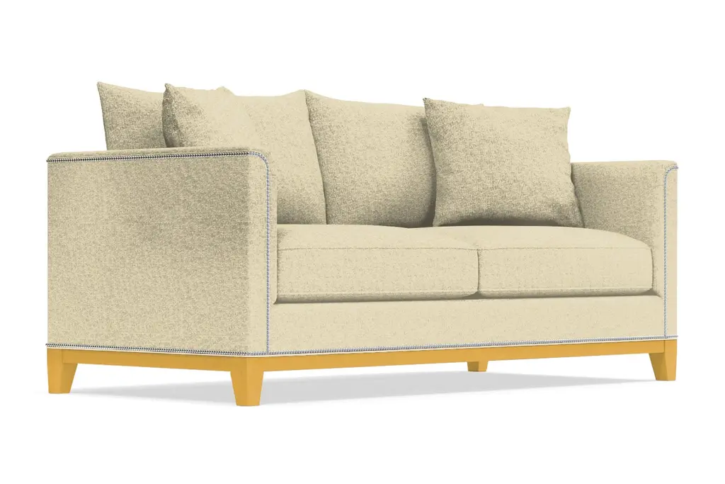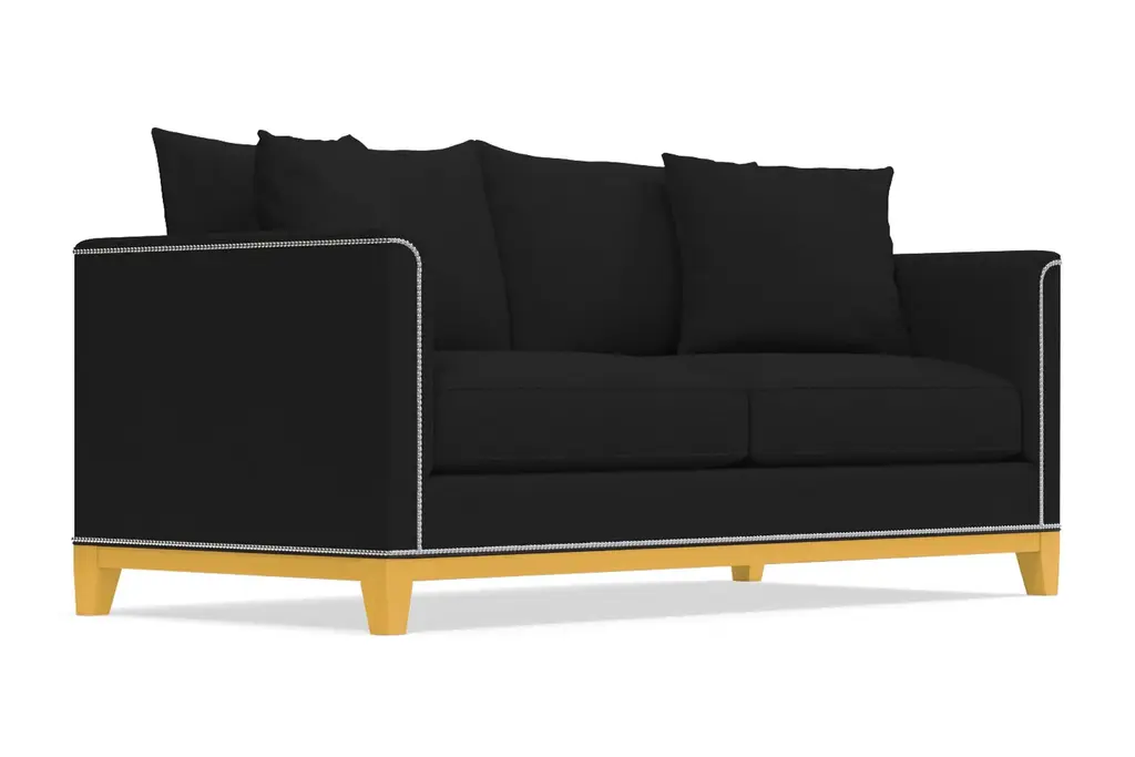 What a stud! Silver tone studs outline The La Brea Studded Sofa for a touch that adds a bit of an edge to the modern silhouette, and is made in the US. We give you the freedom to choose the color of the fabric as well as the leg finish - natural, pecan and espresso. This versatility lets you customize your room to look exactly how you envisioned it in your mind. Choose the crisp white fabric to complete your serene, all-white decor. Are you looking for a hue to add warmth to a family room or office? Try rich chocolate, charcoal or woven gravel. To create a matching living room set, be sure to browse other pieces in The La Brea collection for a cohesive look.