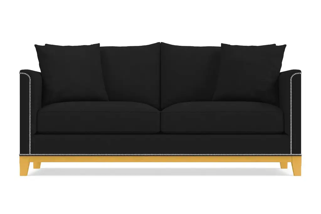 What a stud! Silver tone studs outline The La Brea Studded Sofa for a touch that adds a bit of an edge to the modern silhouette, and is made in the US. We give you the freedom to choose the color of the fabric as well as the leg finish - natural, pecan and espresso. This versatility lets you customize your room to look exactly how you envisioned it in your mind. Choose the crisp white fabric to complete your serene, all-white decor. Are you looking for a hue to add warmth to a family room or office? Try rich chocolate, charcoal or woven gravel. To create a matching living room set, be sure to browse other pieces in The La Brea collection for a cohesive look.