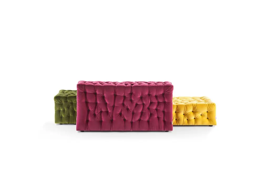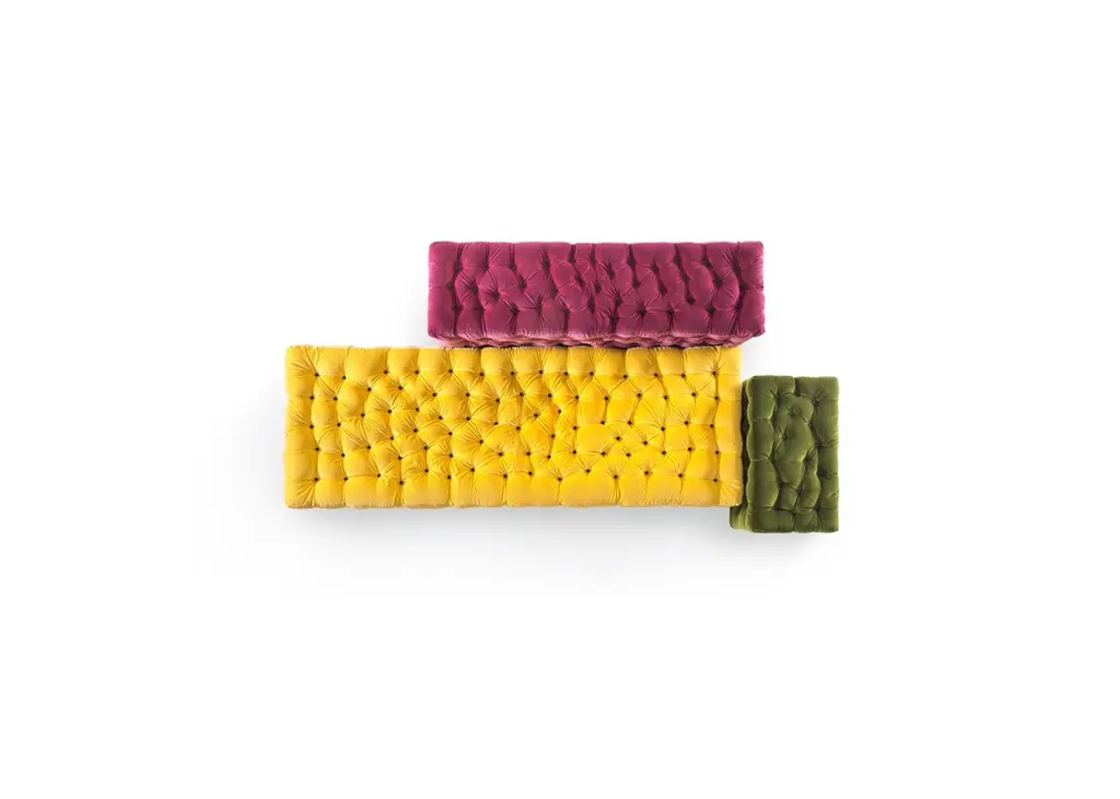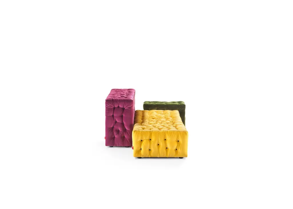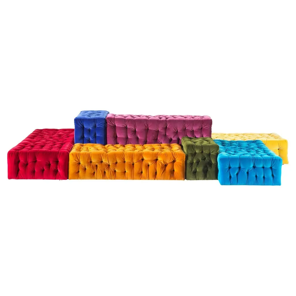 Modular sofa, made of eclectic modules, available in different sizes and colours, which can be continuously rearranged according to taste and needs.La Michetta by Gaetano Pesce for Meritalia is a sofa that does not conform to a predetermined style: it is an object made up of many objects, eclectic modules to be continuously played with and reorganized. The capitonné rises randomly, at times plunging and at times levitating, in contrast with the regularity of each rectangular or cubic module with wooden structure. The buttons mark the hollows of the surface and punctuate it, outlining a three-dimensional and irregular pattern that invites to explore the comfort of the seat.Limitless, even in its uses. The Michetta is for sitting down, for relaxing. Indeed, the very meaning of sitting down and relaxing is reconsidered, depending on whether the module is horizontal or vertical, if used as seat or backrest or armrest, single or multiple.Composition: 100% CottonPerformance: Durability/Fire test 70.000 Martindale (EN ISO 12947-2) BS 5852-cigaretteCare & Maintenance: Upholstery not removableWarning: Please be aware that the colour shades shown can appear different from the real fabric colours. It is advised torequest actual fabric samples before ordering.Care & MaintenanceTo preserve the appearance and colour of the fabric, it is recommended to use the vacuum cleaner with the appropriate accessory weekly. The dust left on the seats settles in the coating leaving marks.It is advisable to act on the stain as soon as possible. Most stains can be removed with a clean, humidified, wellwrung white cloth.Before proceeding with the cleaning, remove any excess liquid with a napkin or an absorbent cloth or any residues solidified with the vacuum cleaner avoiding pressing by penetrating the dirt into the fabric.If the stain persists, add only a small amount of neutral detergent, not directly on the lining, but on the damp cloth and gently rub. Try the operation first on an invisible part of the seat.Use pure soap-free water for the last wash. Do not soak the product.If the stain dates back a long time, it is advisable to turn to a professional.PaddingThe elements are padded in polyurethane and fiberfill.PackagingPackaging in cardboard box included.Packaging in cage to quote by volume.Packaging in wooden crate to quote by volumeAdditional information:Material: VelvetComposition 2Dimensions: 255 x 125 x 73 cmAvailable in other options: Composition 1, Composition 3, Composition 4, Composition 5, Composition 6, Composition 7, Composition 8