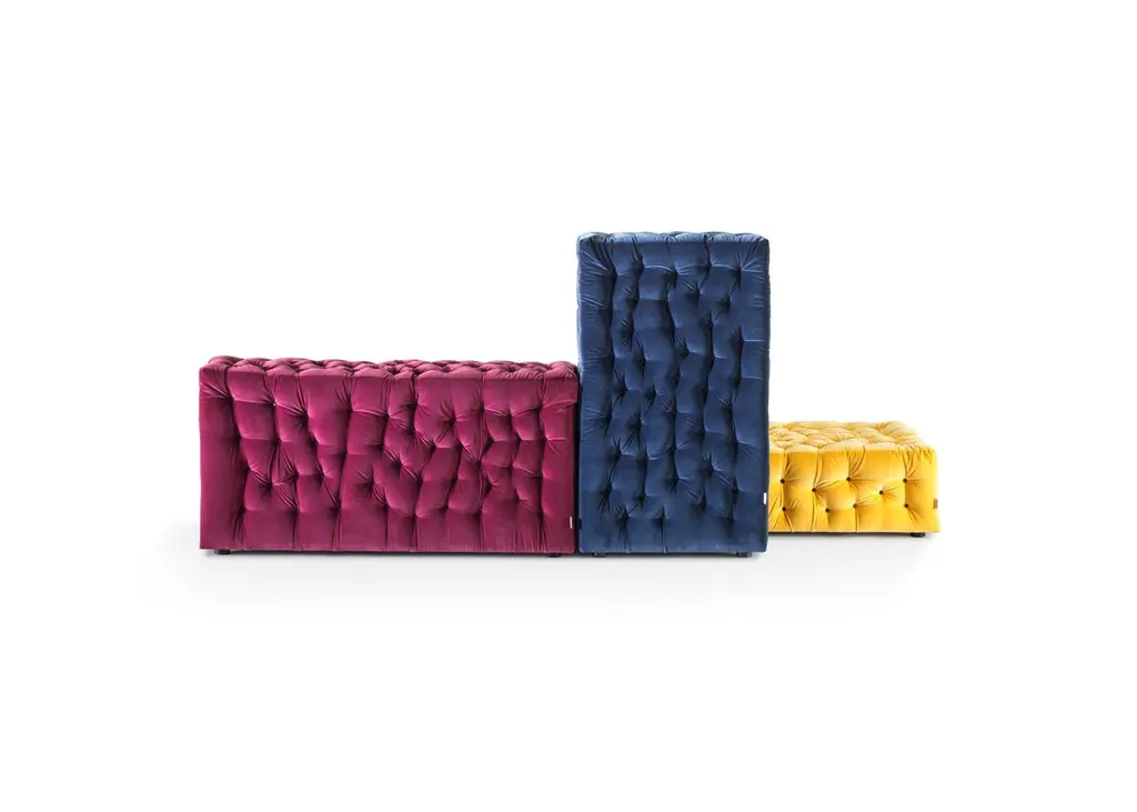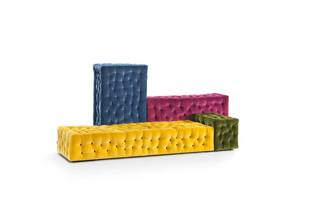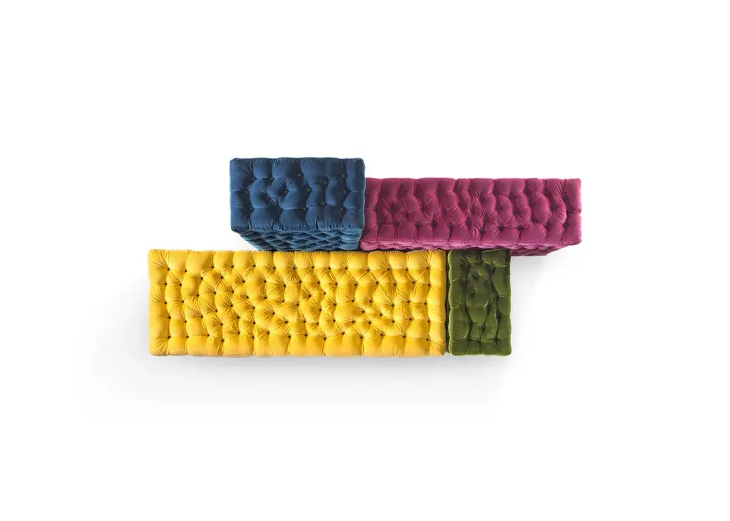 Modular sofa, made of eclectic modules, available in different sizes and colours, which can be continuously rearranged according to taste and needs.La Michetta by Gaetano Pesce for Meritalia is a sofa that does not conform to a predetermined style: it is an object made up of many objects, eclectic modules to be continuously played with and reorganized. The capitonné rises randomly, at times plunging and at times levitating, in contrast with the regularity of each rectangular or cubic module with wooden structure. The buttons mark the hollows of the surface and punctuate it, outlining a three-dimensional and irregular pattern that invites to explore the comfort of the seat.Limitless, even in its uses. The Michetta is for sitting down, for relaxing. Indeed, the very meaning of sitting down and relaxing is reconsidered, depending on whether the module is horizontal or vertical, if used as seat or backrest or armrest, single or multiple.Composition: 100% CottonPerformance: Durability/Fire test 70.000 Martindale (EN ISO 12947-2) BS 5852-cigaretteCare & Maintenance: Upholstery not removableWarning: Please be aware that the colour shades shown can appear different from the real fabric colours. It is advised torequest actual fabric samples before ordering.Care & MaintenanceTo preserve the appearance and colour of the fabric, it is recommended to use the vacuum cleaner with the appropriate accessory weekly. The dust left on the seats settles in the coating leaving marks.It is advisable to act on the stain as soon as possible. Most stains can be removed with a clean, humidified, wellwrung white cloth.Before proceeding with the cleaning, remove any excess liquid with a napkin or an absorbent cloth or any residues solidified with the vacuum cleaner avoiding pressing by penetrating the dirt into the fabric.If the stain persists, add only a small amount of neutral detergent, not directly on the lining, but on the damp cloth and gently rub. Try the operation first on an invisible part of the seat.Use pure soap-free water for the last wash. Do not soak the product.If the stain dates back a long time, it is advisable to turn to a professional.PaddingThe elements are padded in polyurethane and fiberfill.PackagingPackaging in cardboard box included.Packaging in cage to quote by volume.Packaging in wooden crate to quote by volumeAdditional information:Material: VelvetComposition 4Dimensions: 300 x 115 x 127 cmAvailable in other options: Composition 1, Composition 2, Composition 3, Composition 5, Composition 6, Composition 7, Composition 8