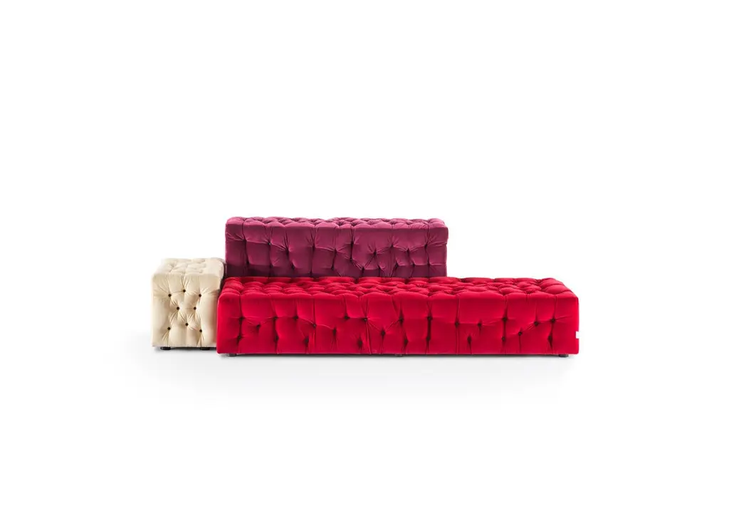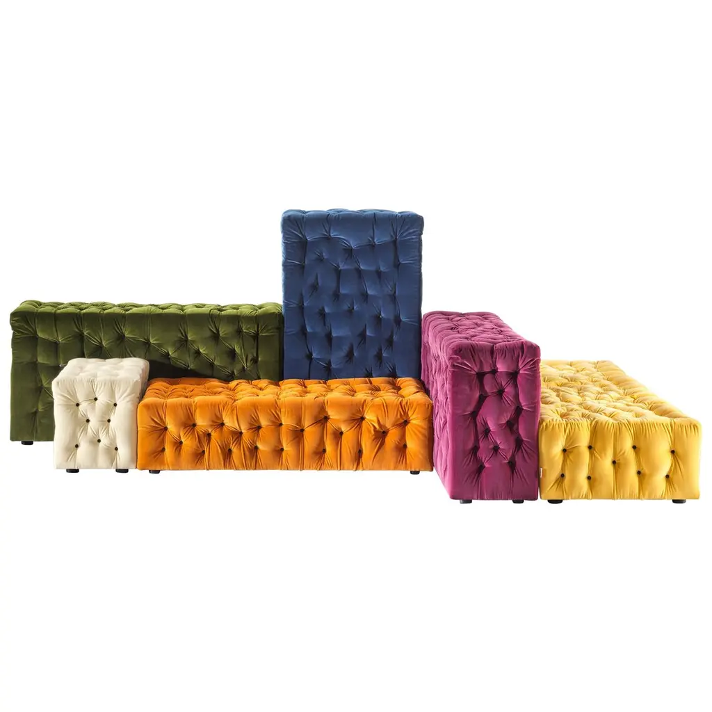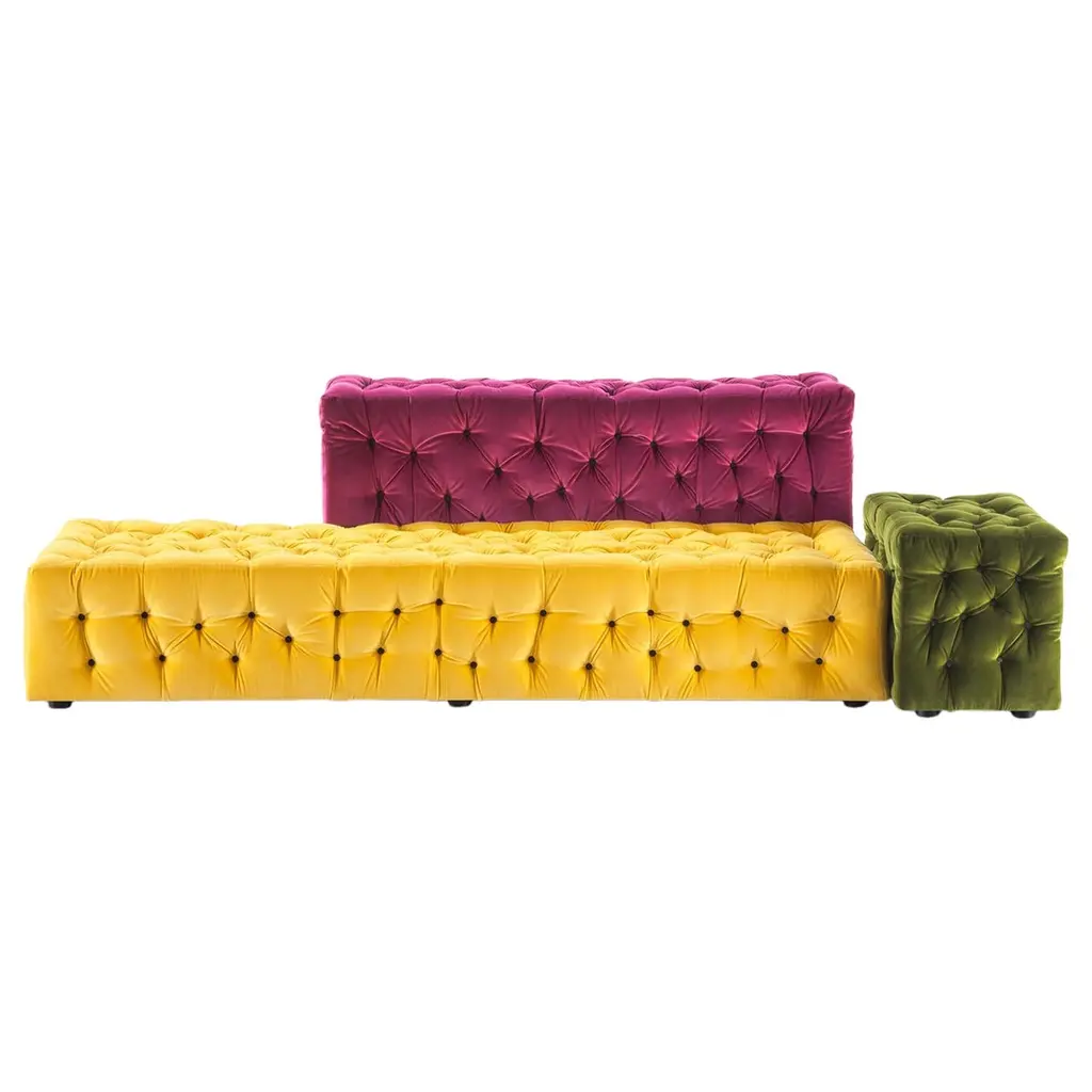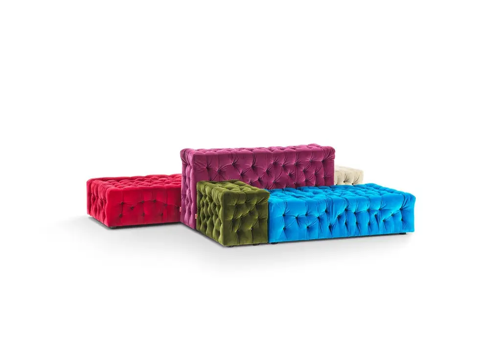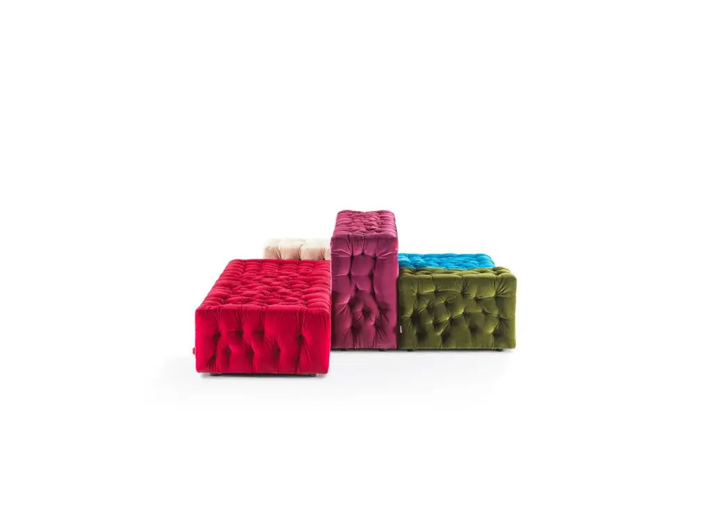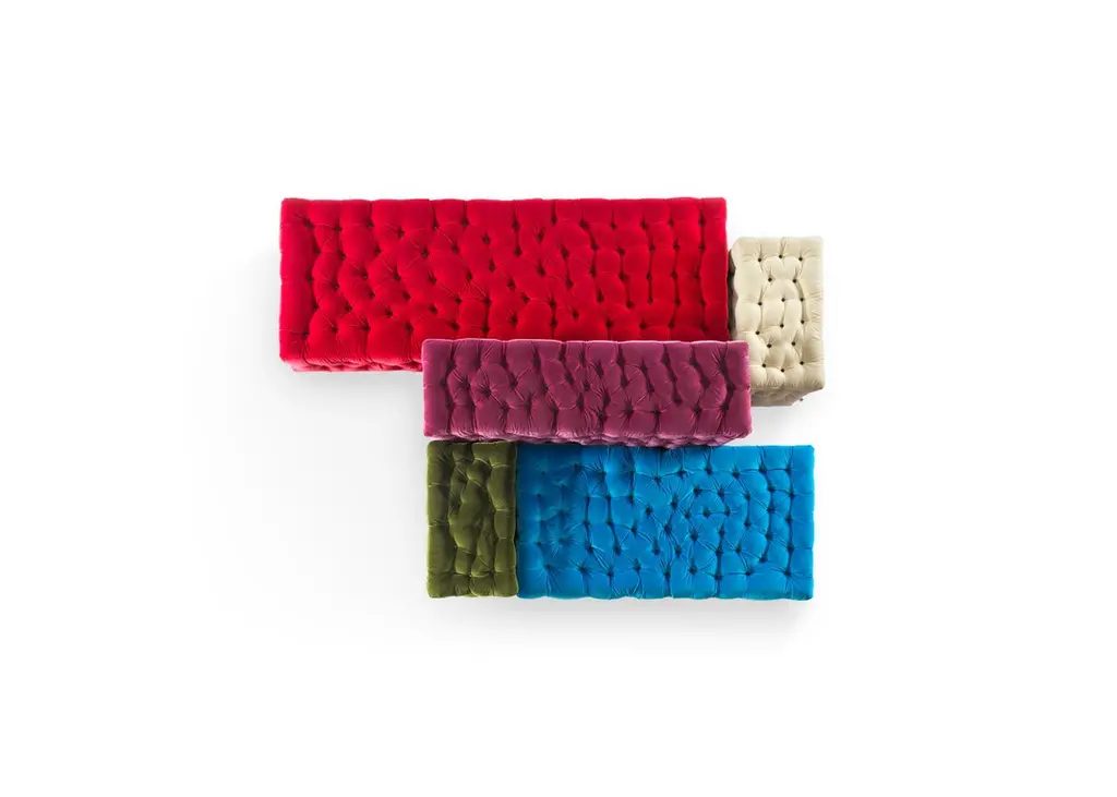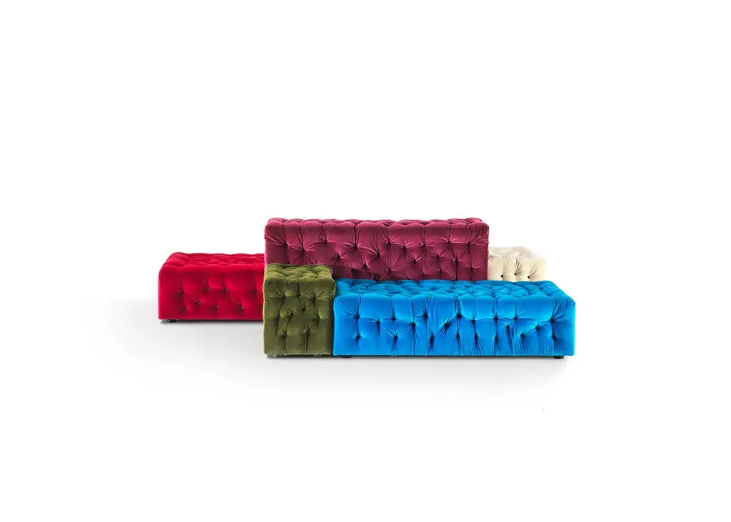 Modular sofa, made of eclectic modules, available in different sizes and colours, which can be continuously rearranged according to taste and needs.La Michetta by Gaetano Pesce for Meritalia is a sofa that does not conform to a predetermined style: it is an object made up of many objects, eclectic modules to be continuously played with and reorganized. The capitonné rises randomly, at times plunging and at times levitating, in contrast with the regularity of each rectangular or cubic module with wooden structure. The buttons mark the hollows of the surface and punctuate it, outlining a three-dimensional and irregular pattern that invites to explore the comfort of the seat.Limitless, even in its uses. The Michetta is for sitting down, for relaxing. Indeed, the very meaning of sitting down and relaxing is reconsidered, depending on whether the module is horizontal or vertical, if used as seat or backrest or armrest, single or multiple.Composition: 100% CottonPerformance: Durability/Fire test 70.000 Martindale (EN ISO 12947-2) BS 5852-cigaretteCare & Maintenance: Upholstery not removableWarning: Please be aware that the colour shades shown can appear different from the real fabric colours. It is advised torequest actual fabric samples before ordering.Care & MaintenanceTo preserve the appearance and colour of the fabric, it is recommended to use the vacuum cleaner with the appropriate accessory weekly. The dust left on the seats settles in the coating leaving marks.It is advisable to act on the stain as soon as possible. Most stains can be removed with a clean, humidified, wellwrung white cloth.Before proceeding with the cleaning, remove any excess liquid with a napkin or an absorbent cloth or any residues solidified with the vacuum cleaner avoiding pressing by penetrating the dirt into the fabric.If the stain persists, add only a small amount of neutral detergent, not directly on the lining, but on the damp cloth and gently rub. Try the operation first on an invisible part of the seat.Use pure soap-free water for the last wash. Do not soak the product.If the stain dates back a long time, it is advisable to turn to a professional.PaddingThe elements are padded in polyurethane and fiberfill.PackagingPackaging in cardboard box included.Packaging in cage to quote by volume.Packaging in wooden crate to quote by volumeAdditional information:Material: VelvetComposition 5Dimensions: 255 x 190 x 73 cmAvailable in other options: Composition 1, Composition 2, Composition 3, Composition 4, Composition 6, Composition 7, Composition 8