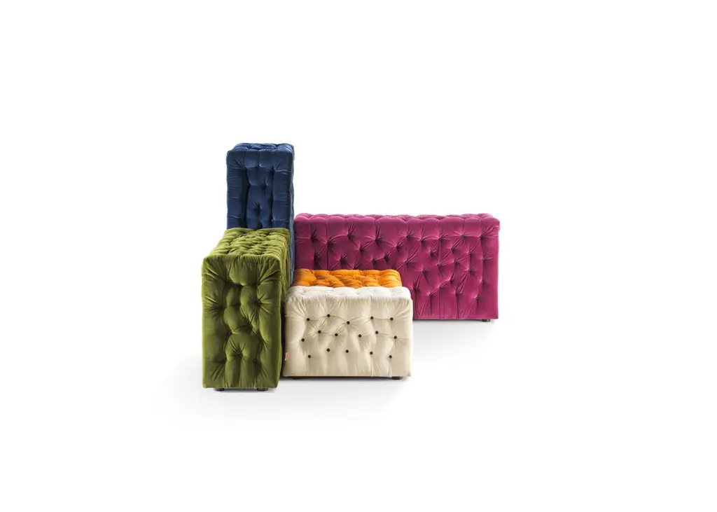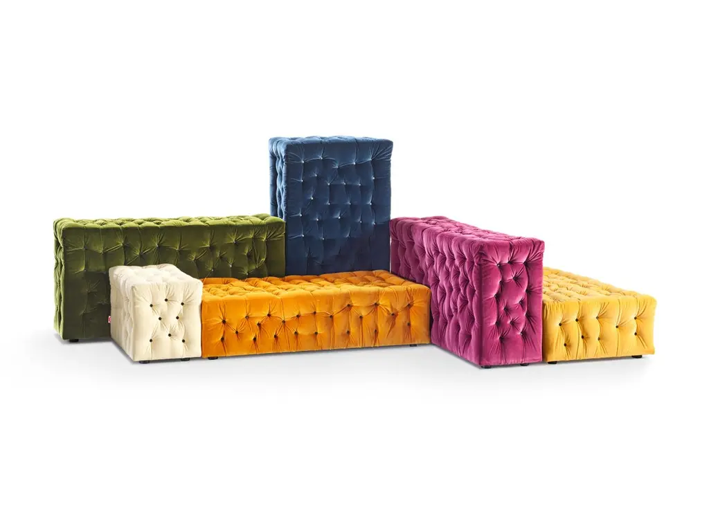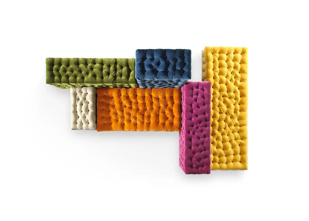 Modular sofa, made of eclectic modules, available in different sizes and colours, which can be continuously rearranged according to taste and needs.La Michetta by Gaetano Pesce for Meritalia is a sofa that does not conform to a predetermined style: it is an object made up of many objects, eclectic modules to be continuously played with and reorganized. The capitonné rises randomly, at times plunging and at times levitating, in contrast with the regularity of each rectangular or cubic module with wooden structure. The buttons mark the hollows of the surface and punctuate it, outlining a three-dimensional and irregular pattern that invites to explore the comfort of the seat.Limitless, even in its uses. The Michetta is for sitting down, for relaxing. Indeed, the very meaning of sitting down and relaxing is reconsidered, depending on whether the module is horizontal or vertical, if used as seat or backrest or armrest, single or multiple.Composition: 100% CottonPerformance: Durability/Fire test 70.000 Martindale (EN ISO 12947-2) BS 5852-cigaretteCare & Maintenance: Upholstery not removableWarning: Please be aware that the colour shades shown can appear different from the real fabric colours. It is advised torequest actual fabric samples before ordering.Care & MaintenanceTo preserve the appearance and colour of the fabric, it is recommended to use the vacuum cleaner with the appropriate accessory weekly. The dust left on the seats settles in the coating leaving marks.It is advisable to act on the stain as soon as possible. Most stains can be removed with a clean, humidified, wellwrung white cloth.Before proceeding with the cleaning, remove any excess liquid with a napkin or an absorbent cloth or any residues solidified with the vacuum cleaner avoiding pressing by penetrating the dirt into the fabric.If the stain persists, add only a small amount of neutral detergent, not directly on the lining, but on the damp cloth and gently rub. Try the operation first on an invisible part of the seat.Use pure soap-free water for the last wash. Do not soak the product.If the stain dates back a long time, it is advisable to turn to a professional.PaddingThe elements are padded in polyurethane and fiberfill.PackagingPackaging in cardboard box included.Packaging in cage to quote by volume.Packaging in wooden crate to quote by volumeAdditional information:Material: VelvetComposition 7Dimensions: 338 x 215 x 127 cmAvailable in other options: Composition 1, Composition 2, Composition 3, Composition 4, Composition 5, Composition 6, Composition 8