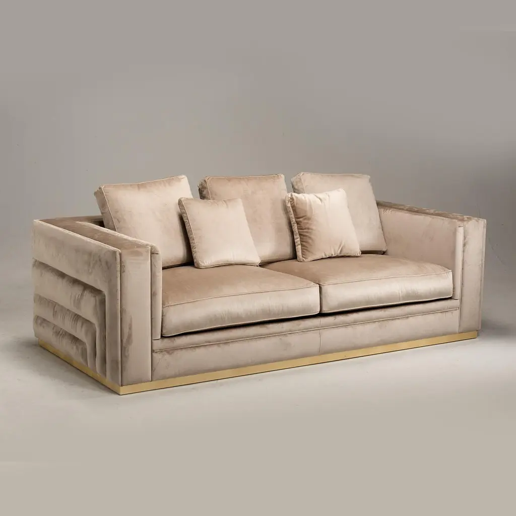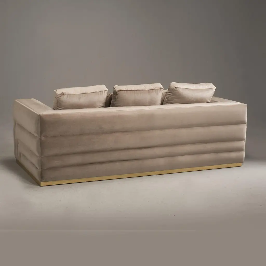The Labyrinth sofa combines old with new to bring a cosmopolitan touch to any contemporary living space. Boasting clean lines to create a geometric silhouette, this glamorous sofa is upholstered in ultra-soft velvety fabric. Set on a square gold base and finished with linear side quilting for a refined touch.