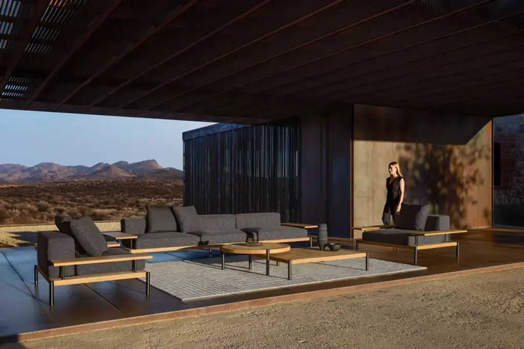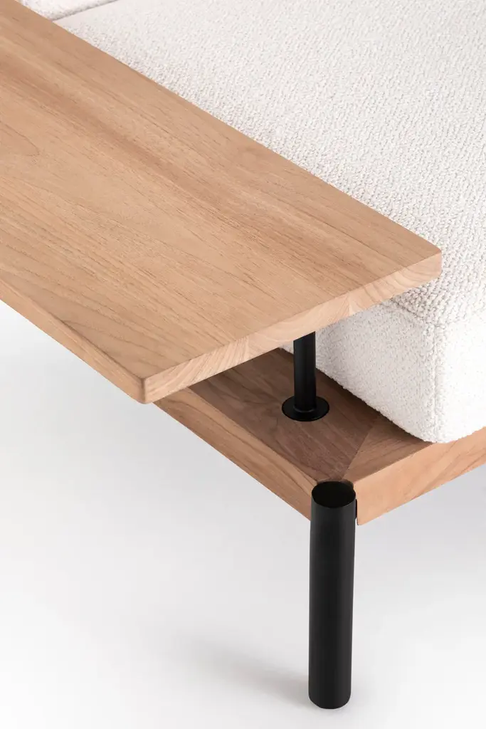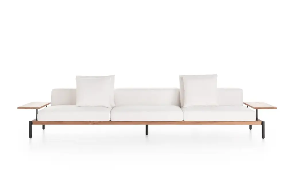Lademadera is a sofa with removable technical upholstery for outdoor use, teak wood and black powder-coated aluminium base. Lademadera is a collection designed by Francesco Meda and David Quincoces for Gandiablasco that applies the beauty of teak wood to outdoor furniture. The collection was born out of the desire to introduce a collection made completely out of wood into the Gandiablasco universe, whose aesthetic appeal and feel matched with that of the brand, whose primary material has always been aluminium. Lademadera base is natural teak wood and black powder-coated aluminium: two 100% recyclable materials that are highly durable and resistant. In fact, the teak used is entirely untreated, something which would be unnecessary due to its many beneficial properties and its lack of ageing.The teak wood used in the production of Lademadera has the Otazen seal of approval and comes from the company's production centers in Java (Indonesia). Otazen is a benchmark in the sector whose manufacturing process is based on European quality standards, integrating and respecting the craftsmanship of the areas where it operates. The raw material used to make Lademadera is FSC (Forest Stewardship Council) and V-Legal (Indonesian Legal Wood) certified, which demonstrates its commitment to the environment. In addition, in order to ensure a sustainable life cycle for the wood, Otazen selects teak from controlled plantations that follow strict reforestation procedures.Many of the phases of the manufacturing process of Lademadera are manual. This begins with the selection of the most suitable pieces of wood according to the required measurements. Once selected, they are industrially cut into strips of the required size and dried in an oven to adjust the internal humidity before machining. Subsequently, the pieces are laminated to obtain the final semi-components. From this point on, the assembly process is carried out by hand to obtain the desired final piece. The next phase is also done by hand, and consists of sanding the wood in three stages to achieve a perfect finish.The collection is made up of 5 items: 3 sofas (one-, two- and three-seaters) and two coffee tables in different heights so that they can be overlapped. They all exemplify a design philosophy that respects the environment that they are placed in; they blend in seamlessly. Both the seats and the backrests of the sofas are made of Gravidry® filtering polyurethane foam rubber with a layer of padding on the surface. The different upholstered elements have removable covers, and thanks to the foam's draining capacity, it dries rapidly without the need to remove the covers. They are also made with technical outdoor fabrics from brands such as Kvadrat, Sunbrella and Dedar Milano, as well as fabrics made from 100% recycled and recyclable PET from the brand Reviva. The backrests also have an internal aluminium structure that provides strength and firmness.