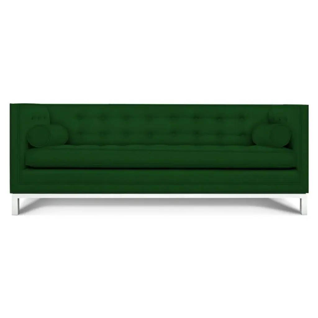 Signature Style.Our Lampert Sofa hits all the right notes—the high tuxedo back gives it an elegant yet formal presence, while the bolsters make it super comfy. Explore our custom upholstery program—you can't go wrong with velvet. Our favorite combinations? Venice Peacock with white base evokes Hollywood glamour, Brussels Charcoal lends a little uptown swank, or Venice Emerald with black base oozes moody Chinoise elegance. Mix and match your favorite fabrics and finishes to suit your style. 85" W, 34" D, 32" H Seat height: 18", Seat depth: 22" Arm height: 32" Solid maple base with water-based wood finish stain Fiber padding materials comprised of 100% recycled polyester Benchmade in the USA Tight back, loose cushion Professional cleaning recommended