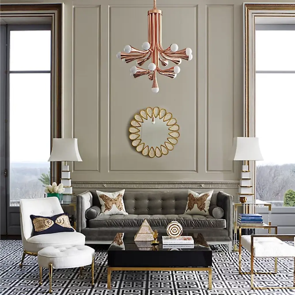 Fine tailoring of plush velvet makes the Jonathan Adler Lampert Sofa a comfortably glamorous place to lounge. It features a tall tuxedo back with button tufting across all inner surfaces that is both precise and revealing of the sofa's softness. Both available fabrics are paired with a White-finished metal base. Includes 2 matching bolster pillows.