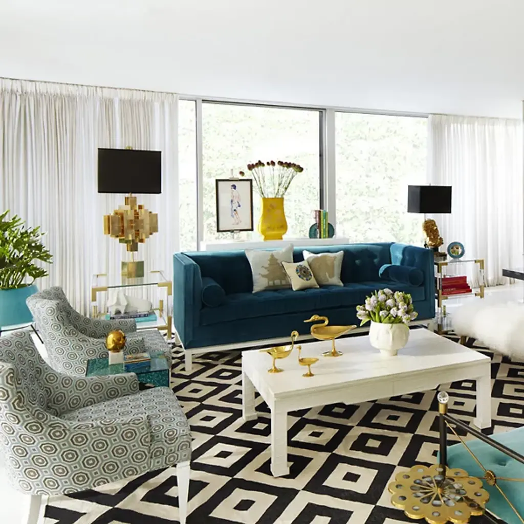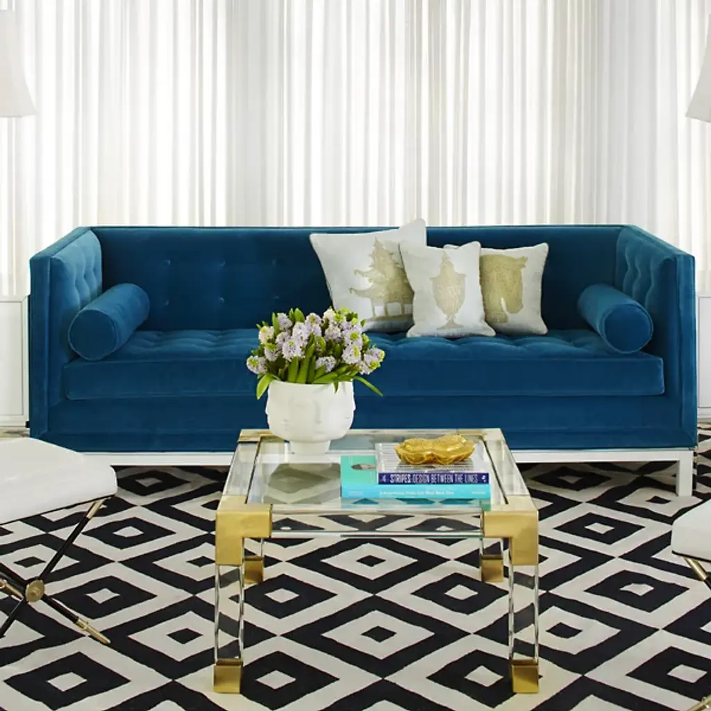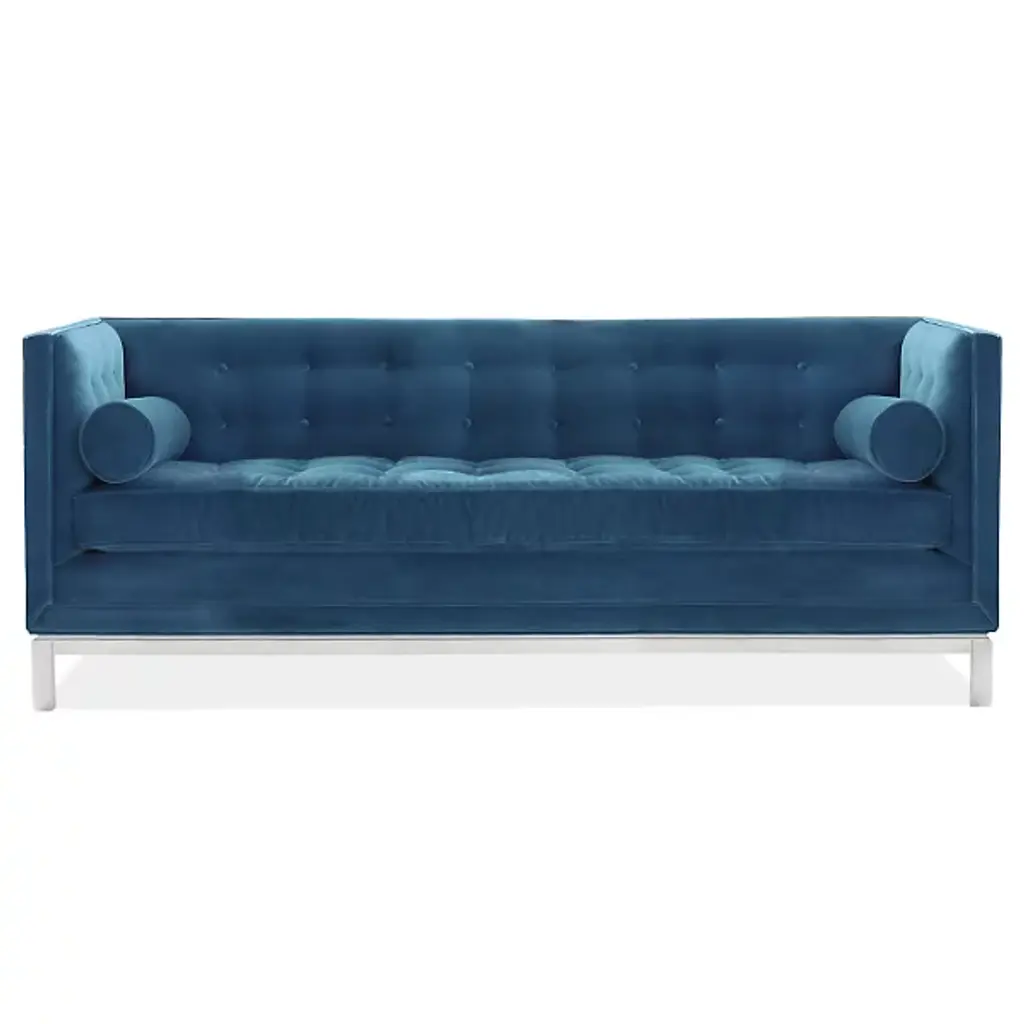 Fine tailoring of plush velvet makes the Jonathan Adler Lampert Sofa a comfortably glamorous place to lounge. It features a tall tuxedo back with button tufting across all inner surfaces that is both precise and revealing of the sofa's softness. Both available fabrics are paired with a White-finished metal base. Includes 2 matching bolster pillows.