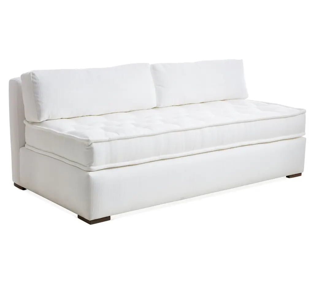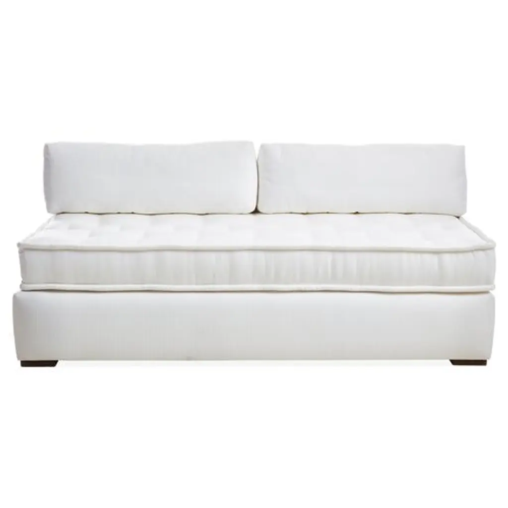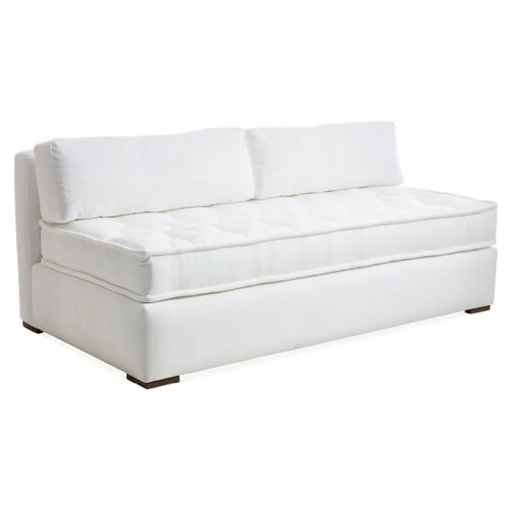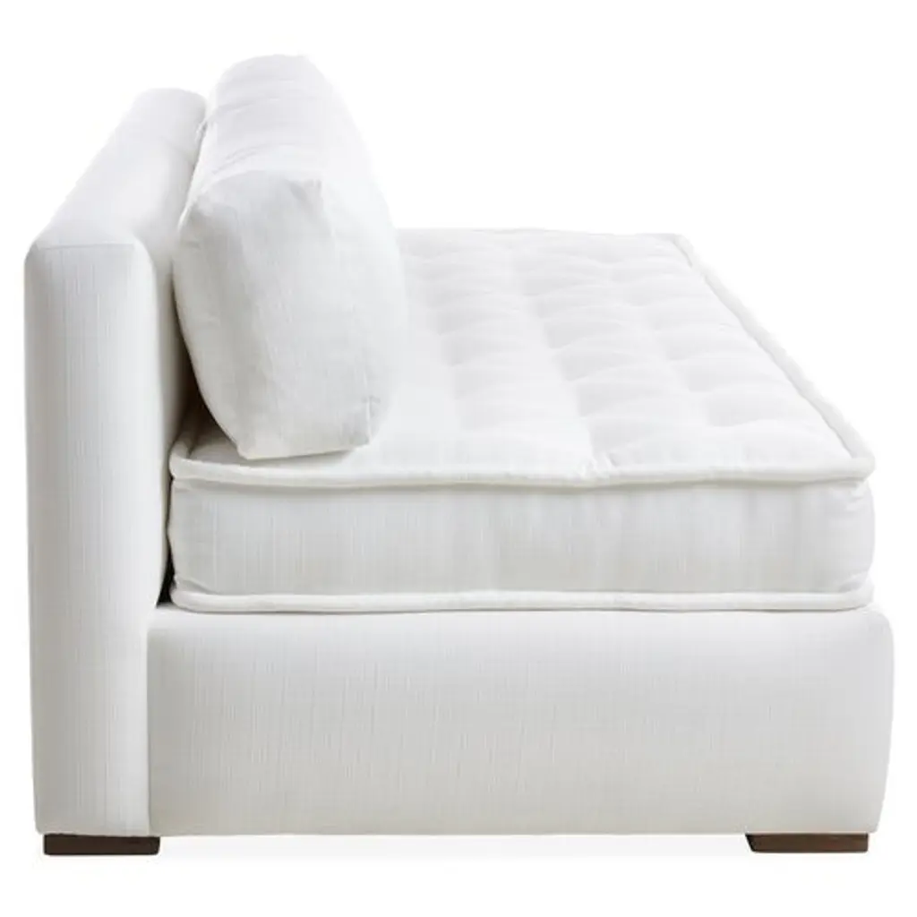 Designed by us and available only at One Kings Lane: Boasting a clean-lined, armless silhouette, this sofa is framed in reclaimed alder and set on block feet. Stylish on its own or as a module in a sectional, its fully upholstered body and tufted box-style seat cushion are covered in a durable woven fabric that mimics the look and feel of linen, while an ample fill of foam wrapped with Dacron and Trillium ensures long-lasting comfort. Two rectangular back cushions complete this design.