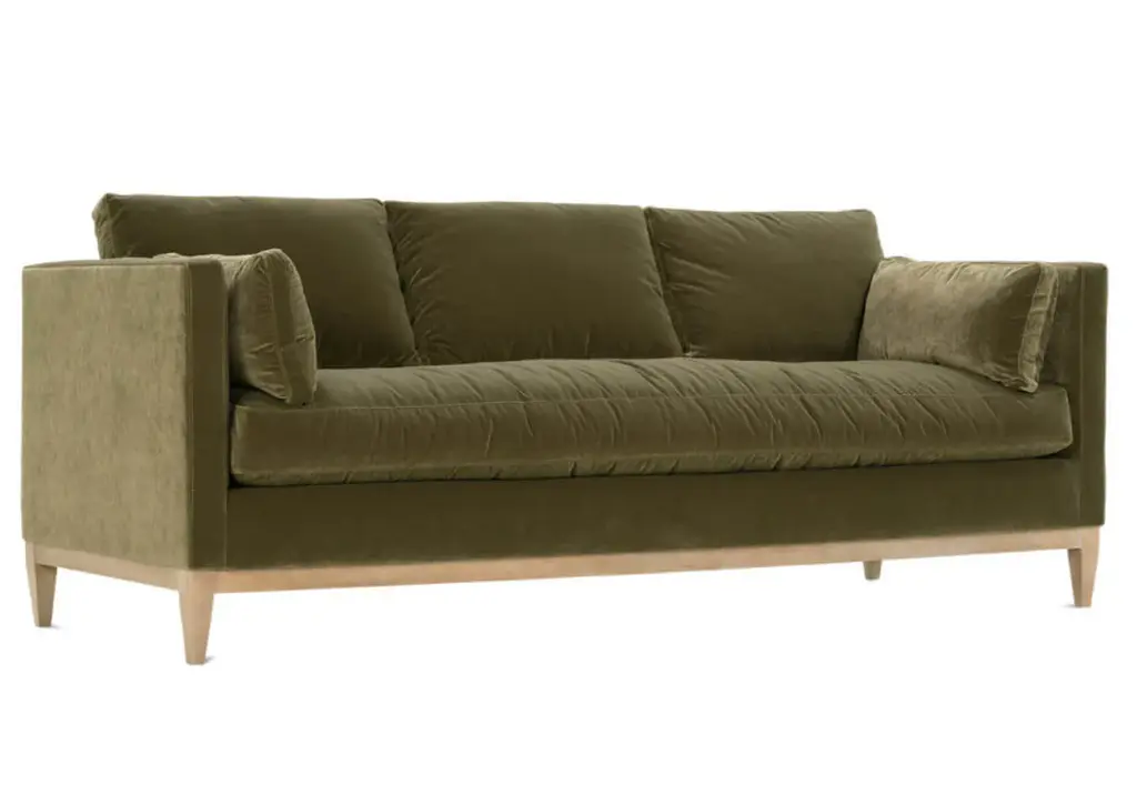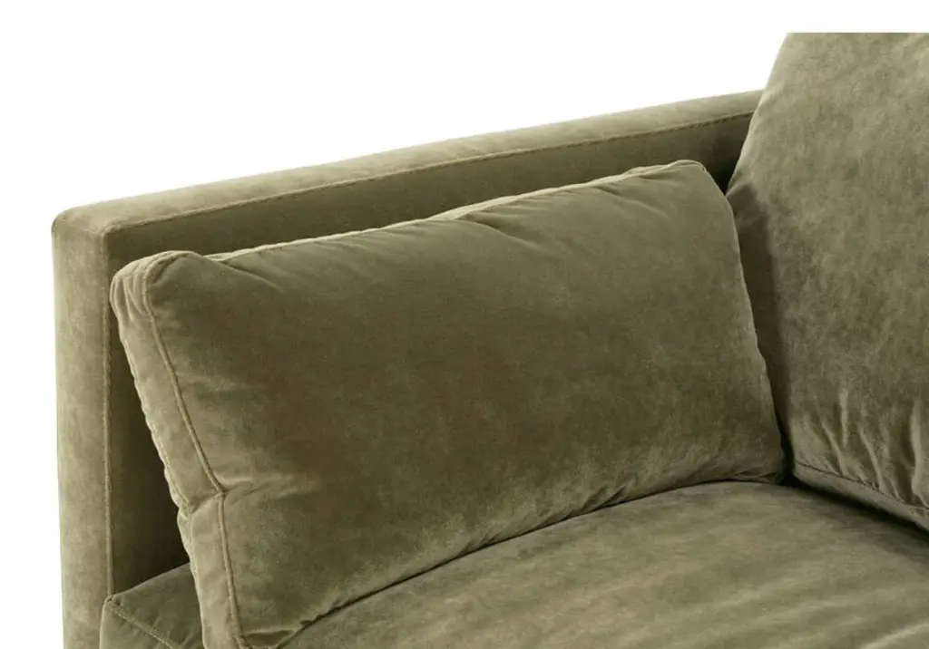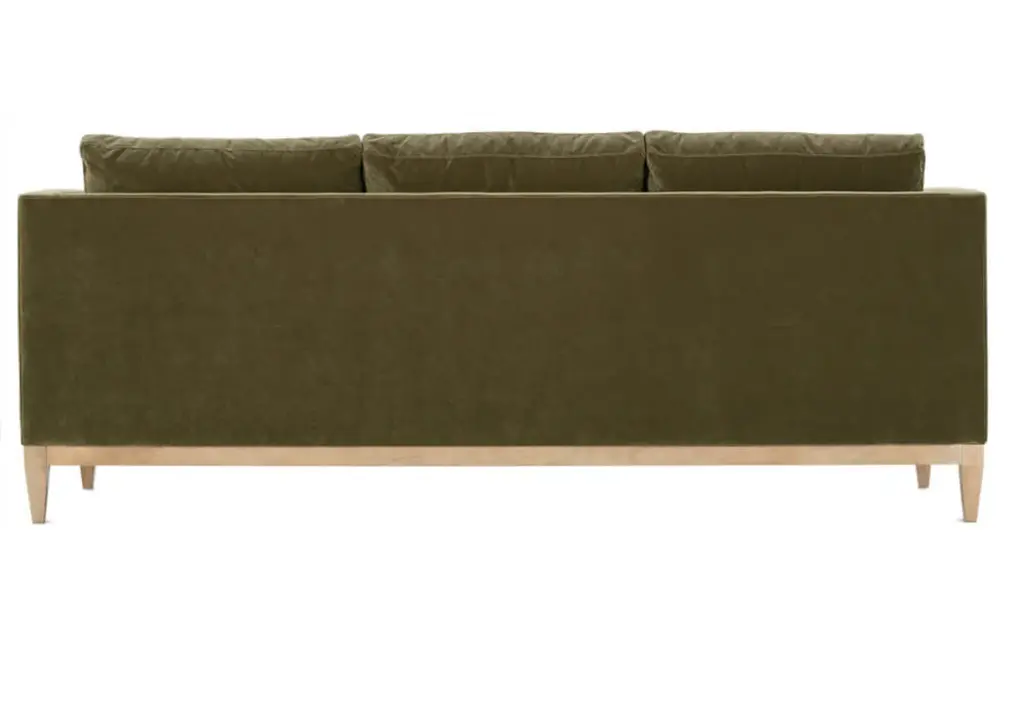 Soft and luxurious, this velvet sofa in rich olive coloring lends an elegant touch. Its elongated bench seat is complemented by matching bolster pillows and three plush back cushions. A washed oak base beautifully elevates and contrasts, creating a sophisticated design.